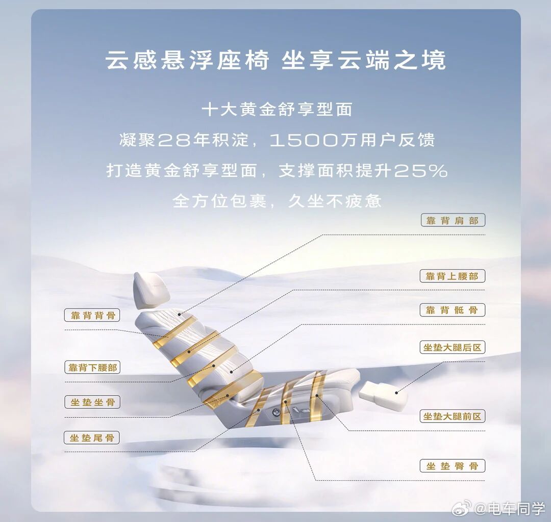 说到舒适性就不得不提至境 L7的座椅,采用劳斯莱斯同款悬浮层椅,简单形容就是:你坐着,它托着。