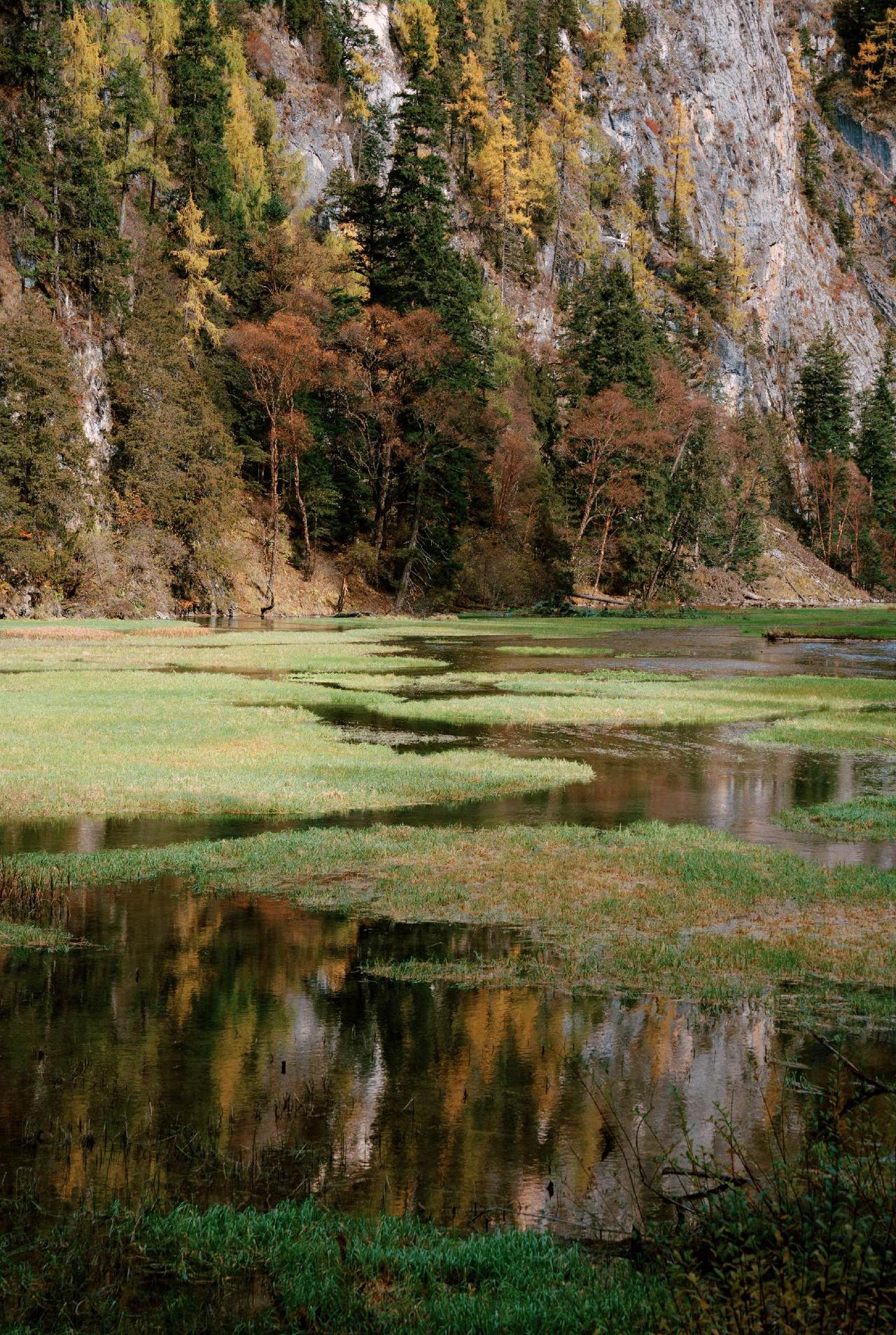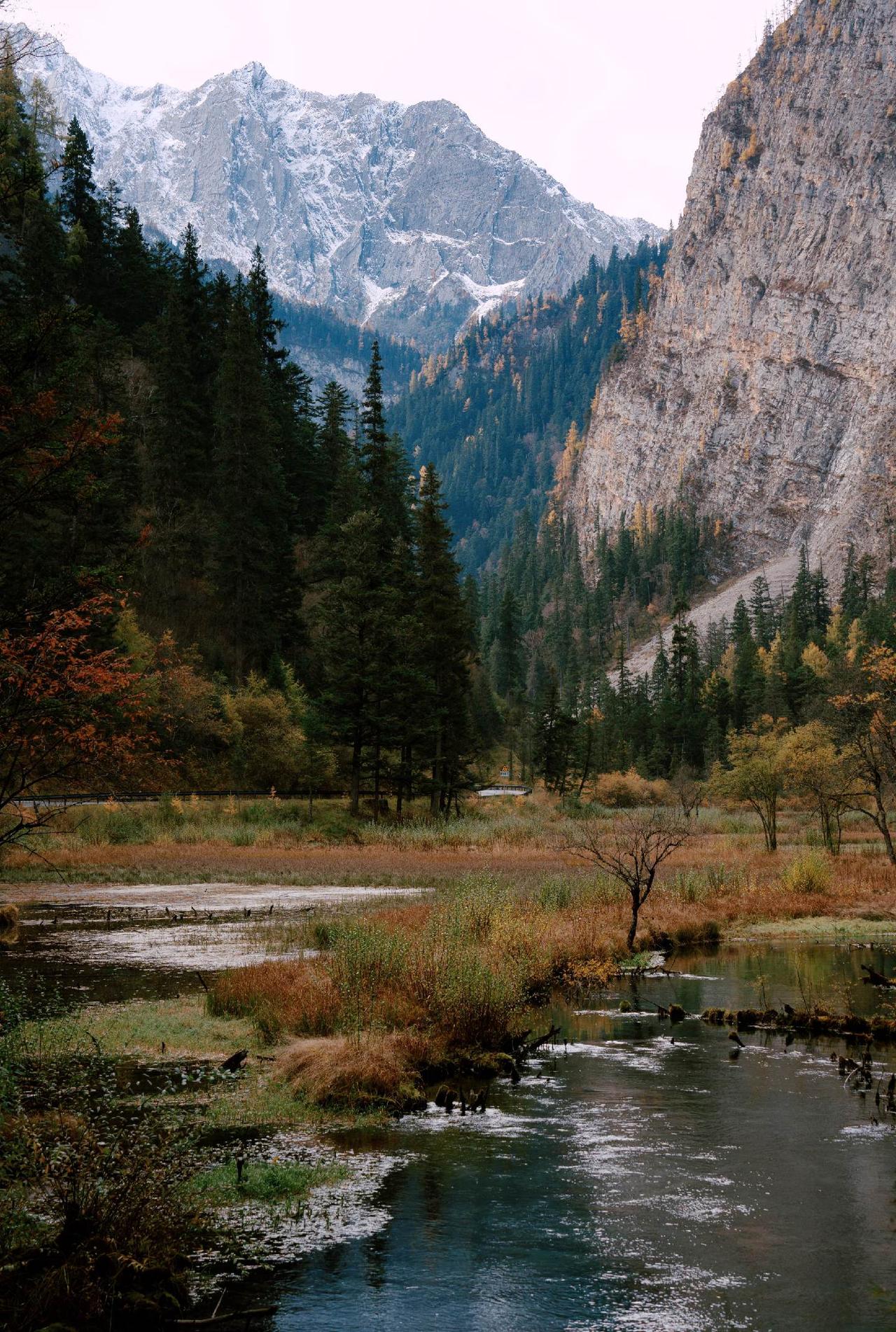 这片山谷像是被按下了暂停键的仙境,冷峻的雪山和幽深的森林守护着这片还带着秋意的湿地,没有人群的喧嚣,只有流水和风声。沿着这样的溪流行走,每一口呼吸都像在做森林SPA,所有的疲惫都能被这澄澈的绿意和雪山的寒意洗净。