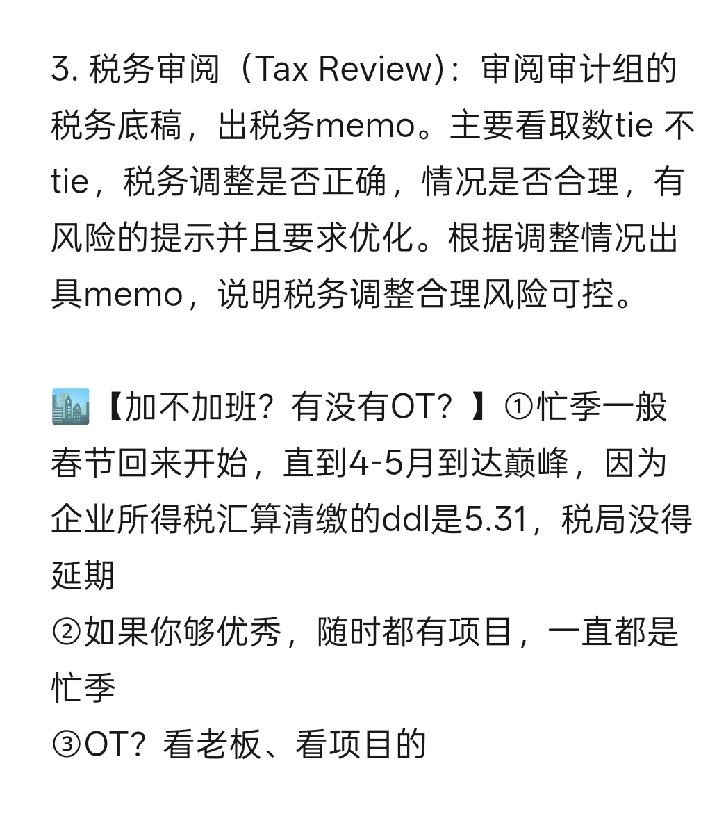 🏙️【加不加班?有没有OT?】①忙季一般春节回来开始,直到4-5月到达巅峰,因为企业所得税汇算清缴的ddl是5.31,税局没得延期