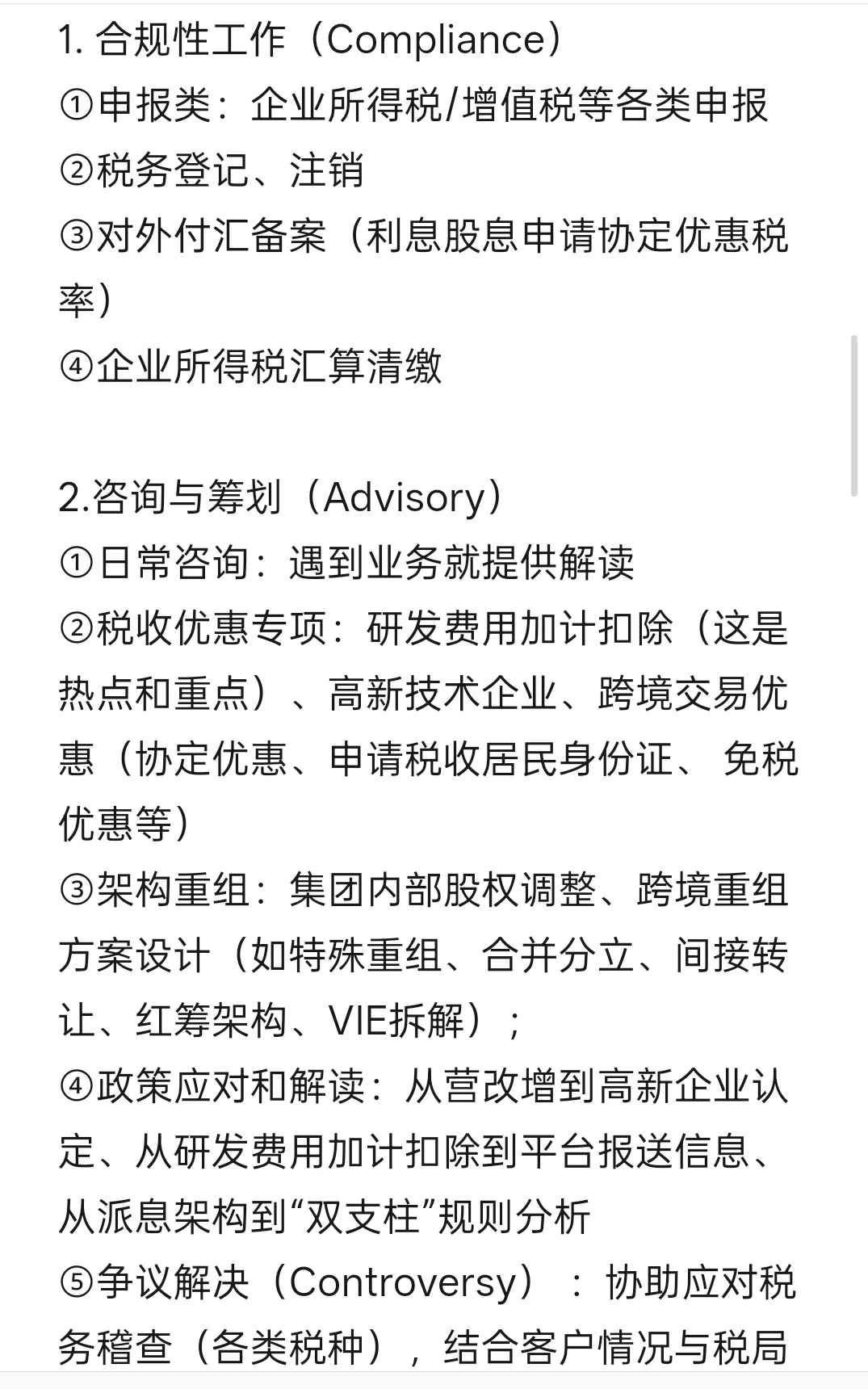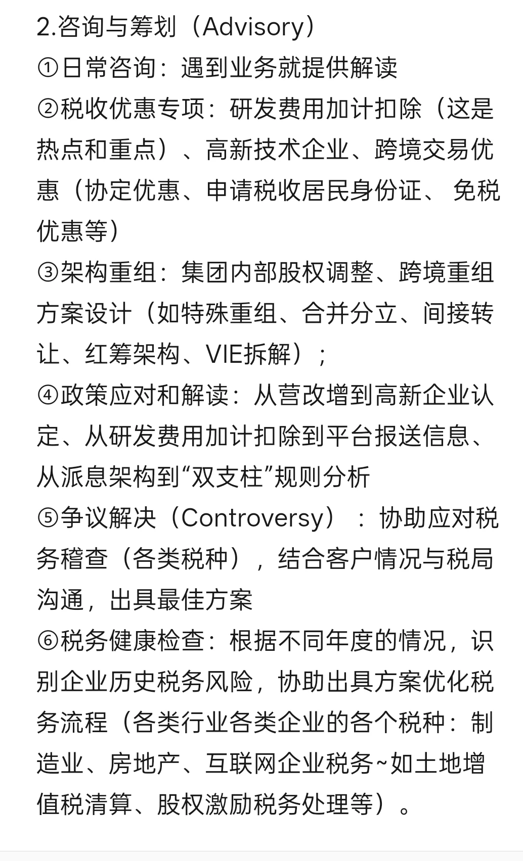 ⑤争议解决(Controversy) :协助应对税务稽查(各类税种),结合客户情况与税局沟通,出具最佳方案