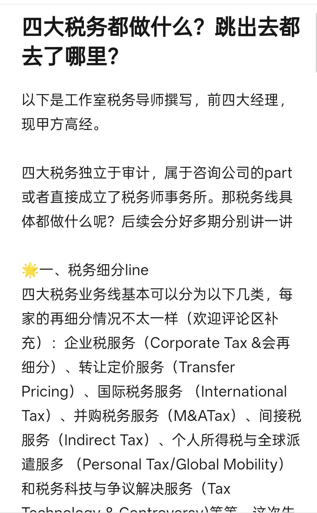 四大税务独立于审计,属于咨询公司的part或者直接成立了税务师事务所。那税务线具体都做什么呢?后续会分好多期分别讲一讲