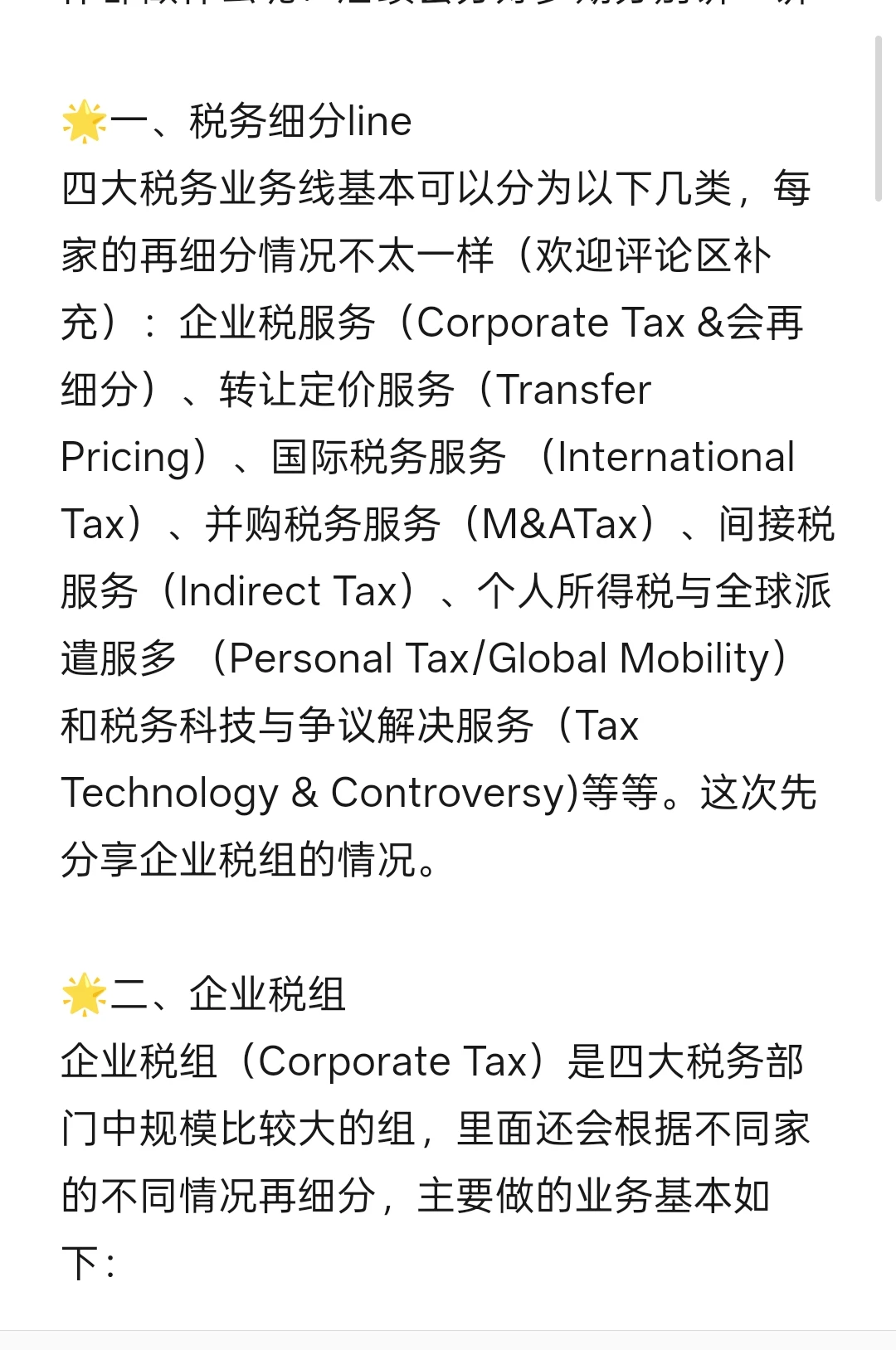 四大税务业务线基本可以分为以下几类,每家的再细分情况不太一样(欢迎评论区补充):企业税服务(Corporate Tax &会再细分)、转让定价服务(Transfer Pricing)、国际税务服务 (International Tax)、并购税务服务(M&ATax)、间接税服务(Indirect Tax)、个人所得税与全球派遣服多 (Personal Tax/Global Mobility) 和税务科技与争议解决服务(Tax Technology & Controversy)等等。这次先分享企业税组的情况。