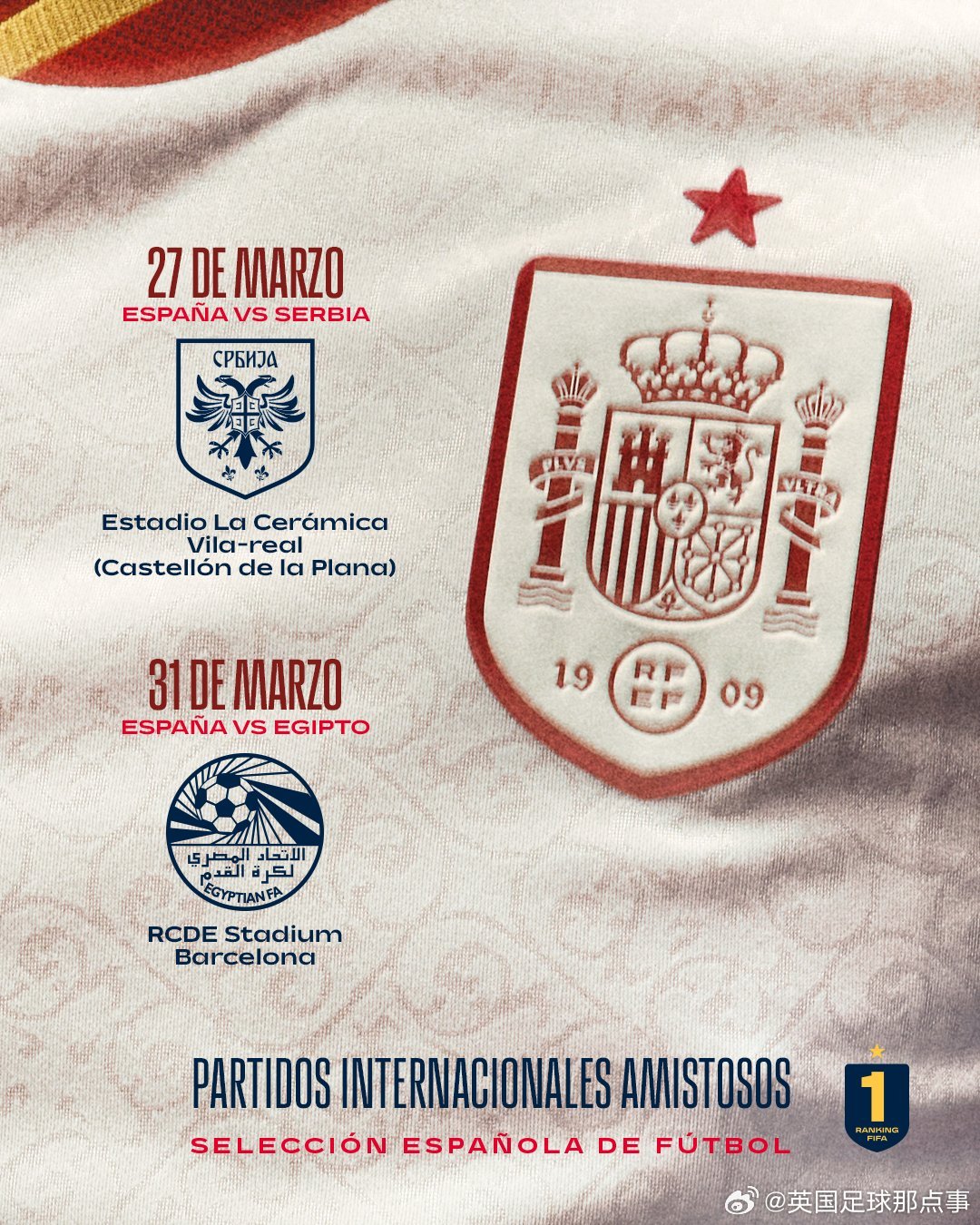 西班牙本月将在国内进行两场热身赛,分别是北京时间3月28日凌晨4点对阵塞尔维亚、3月31日凌晨1点对阵埃及。