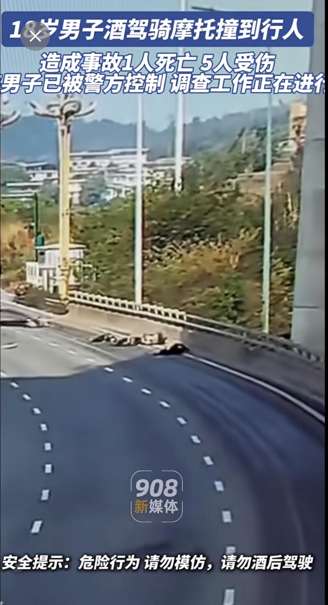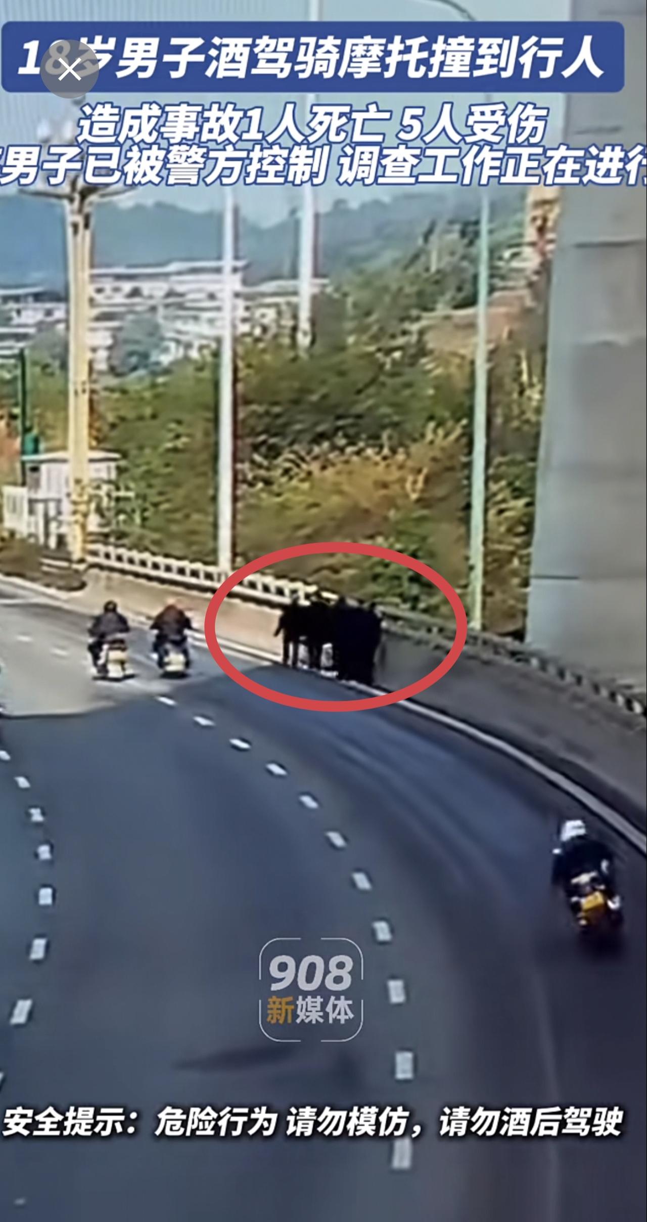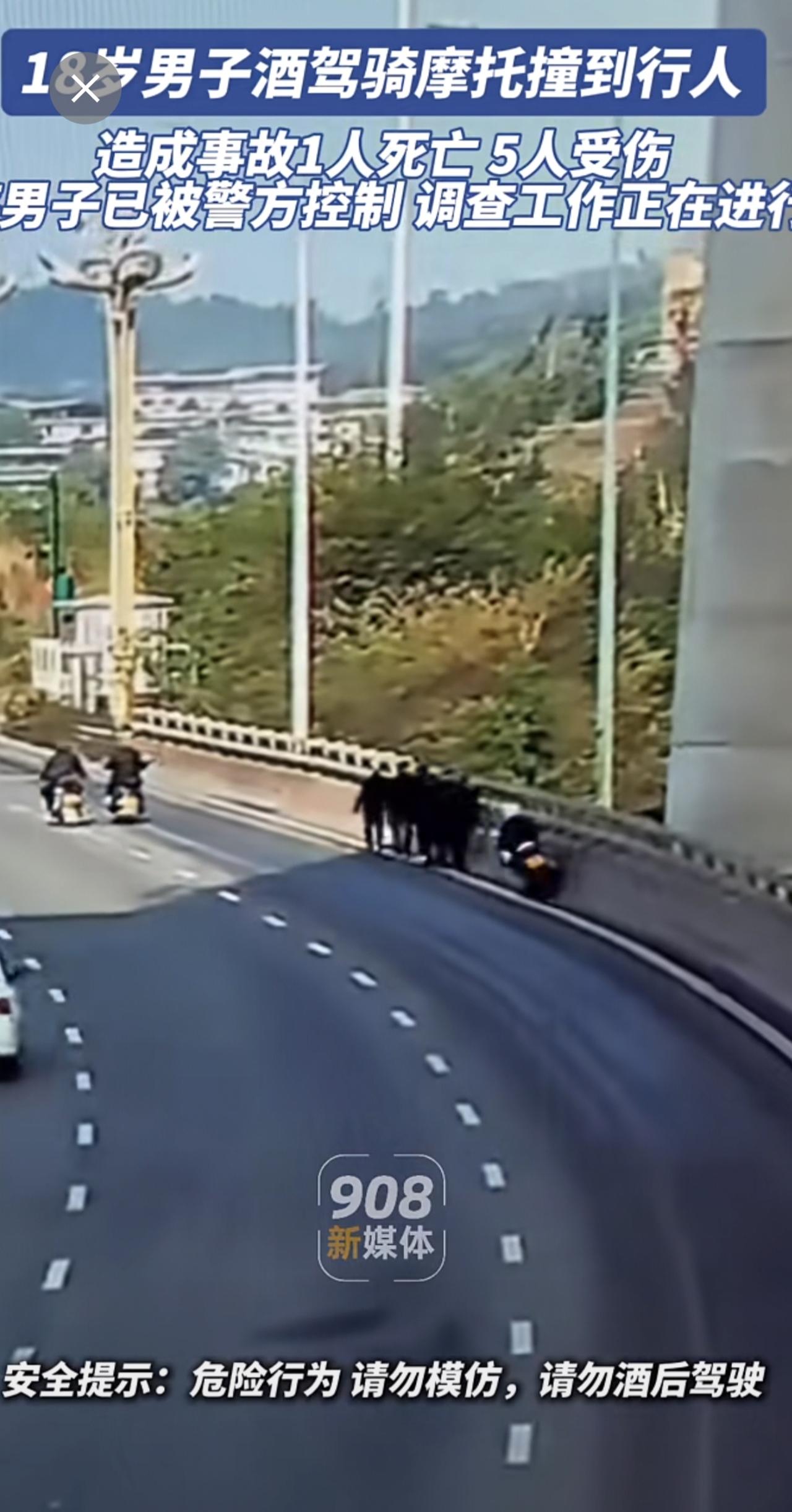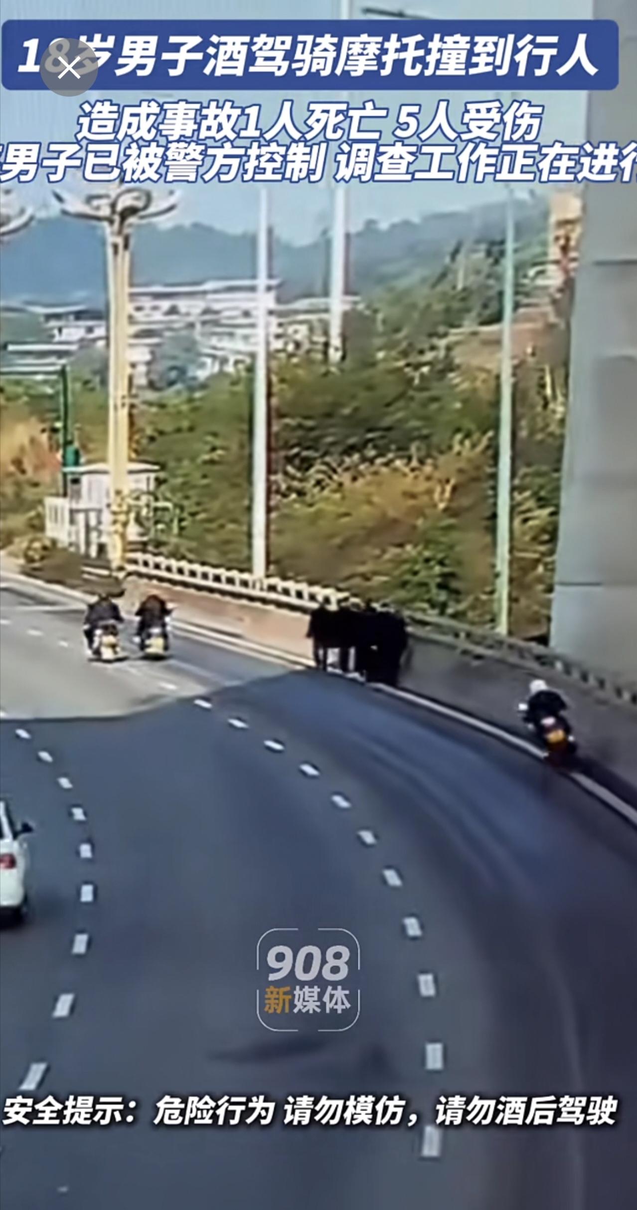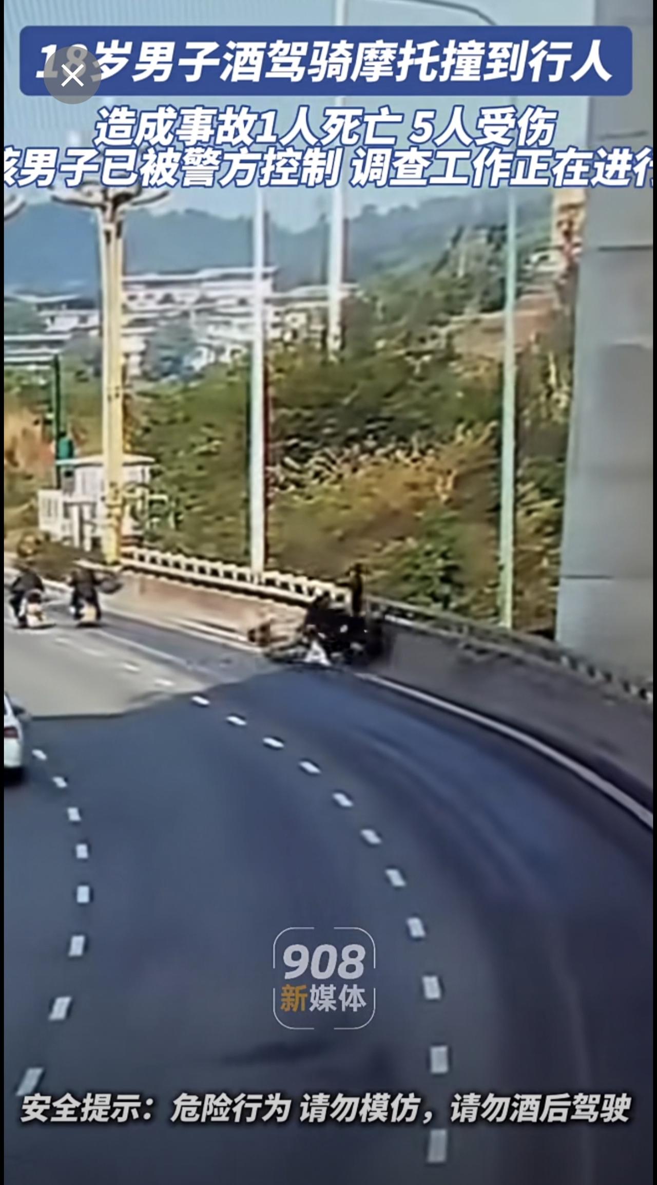 18岁男子酒驾骑摩托撞到行人 造成事故1人死亡 5人受伤 该男子已被警方控制 调