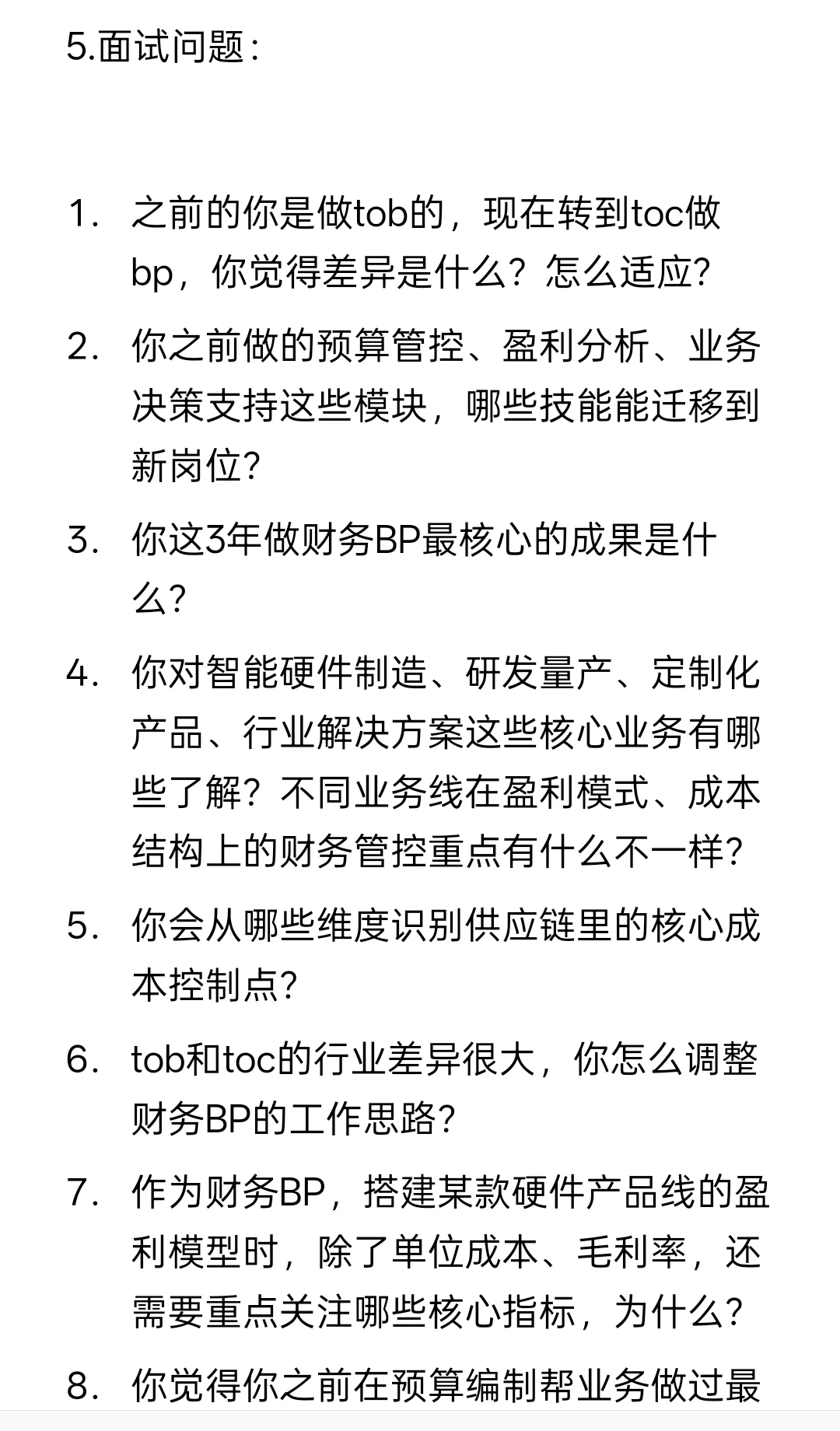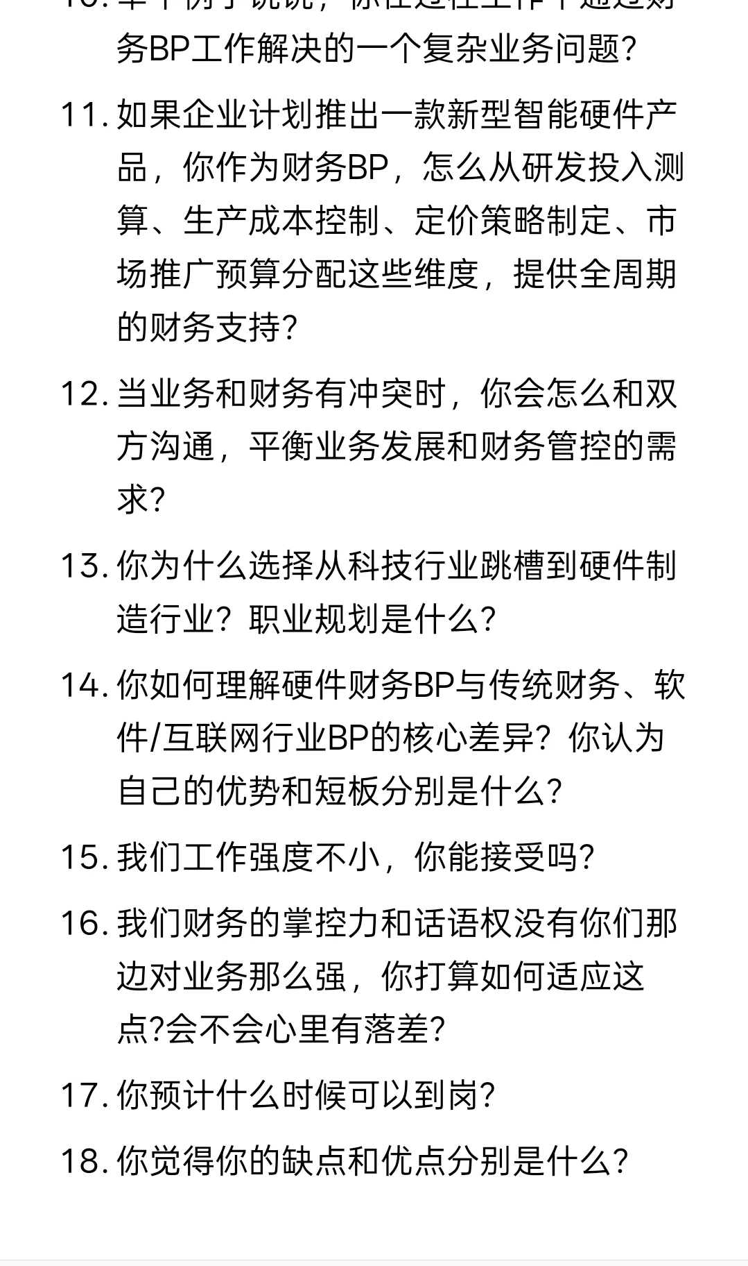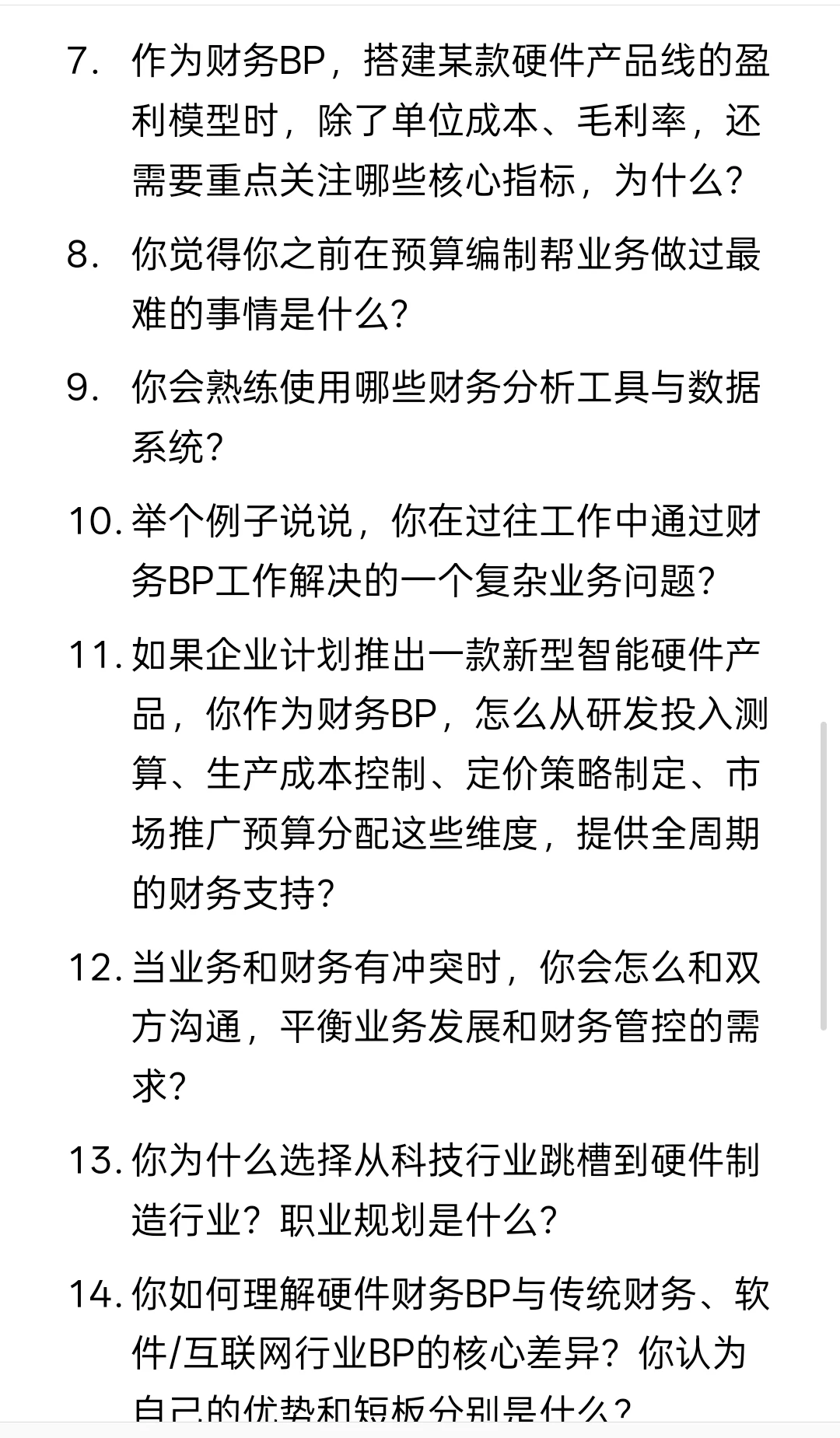 14. 你如何理解硬件财务BP与传统财务、软件/互联网行业BP的核心差异?你认为自己的优势和短板分别是什么?