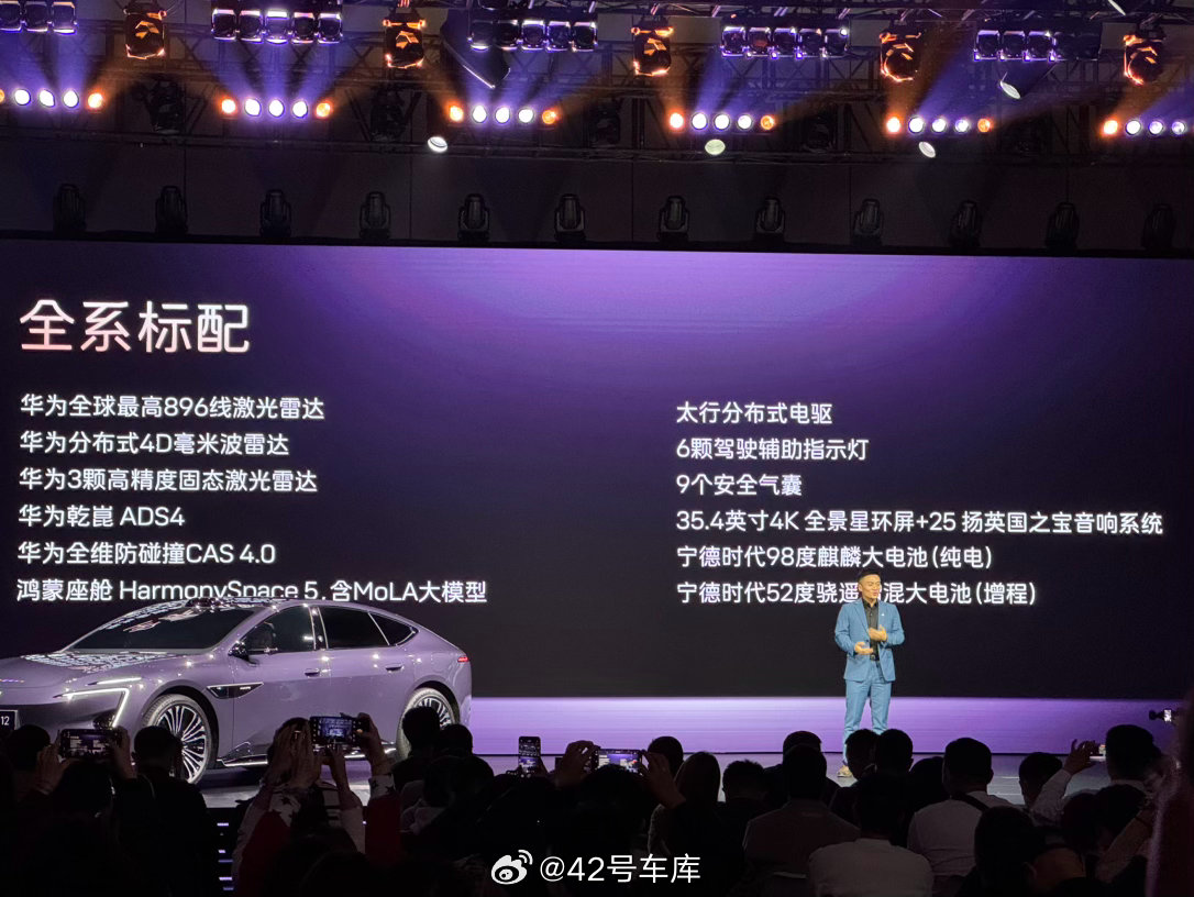 华为 896 线激光雷达、ADS4、太行分布式电驱、25 英国之宝扬声器、纯电 98 度宁德时代电池、增程 52 度宁德时代电池等等…都全系标配!