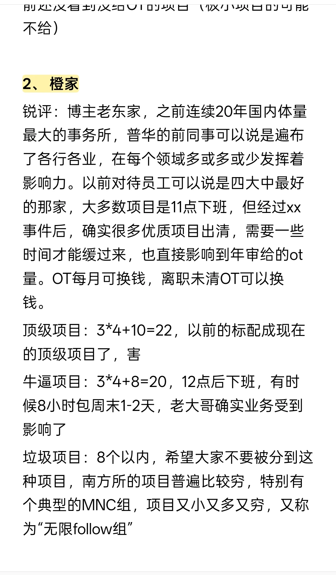 锐评:在博主还在四大那会,黄家最经典的两句话“ 半价安”“2OT包夜”,前者还适用,后者已经少了很多,基本只存在于FSO项目以及穷逼项目,大多数项目能给3OT以上。OT每月可换钱,离职未清OT可以换钱。目前IPO含量极高,不少数人处于去全年无休的情况。