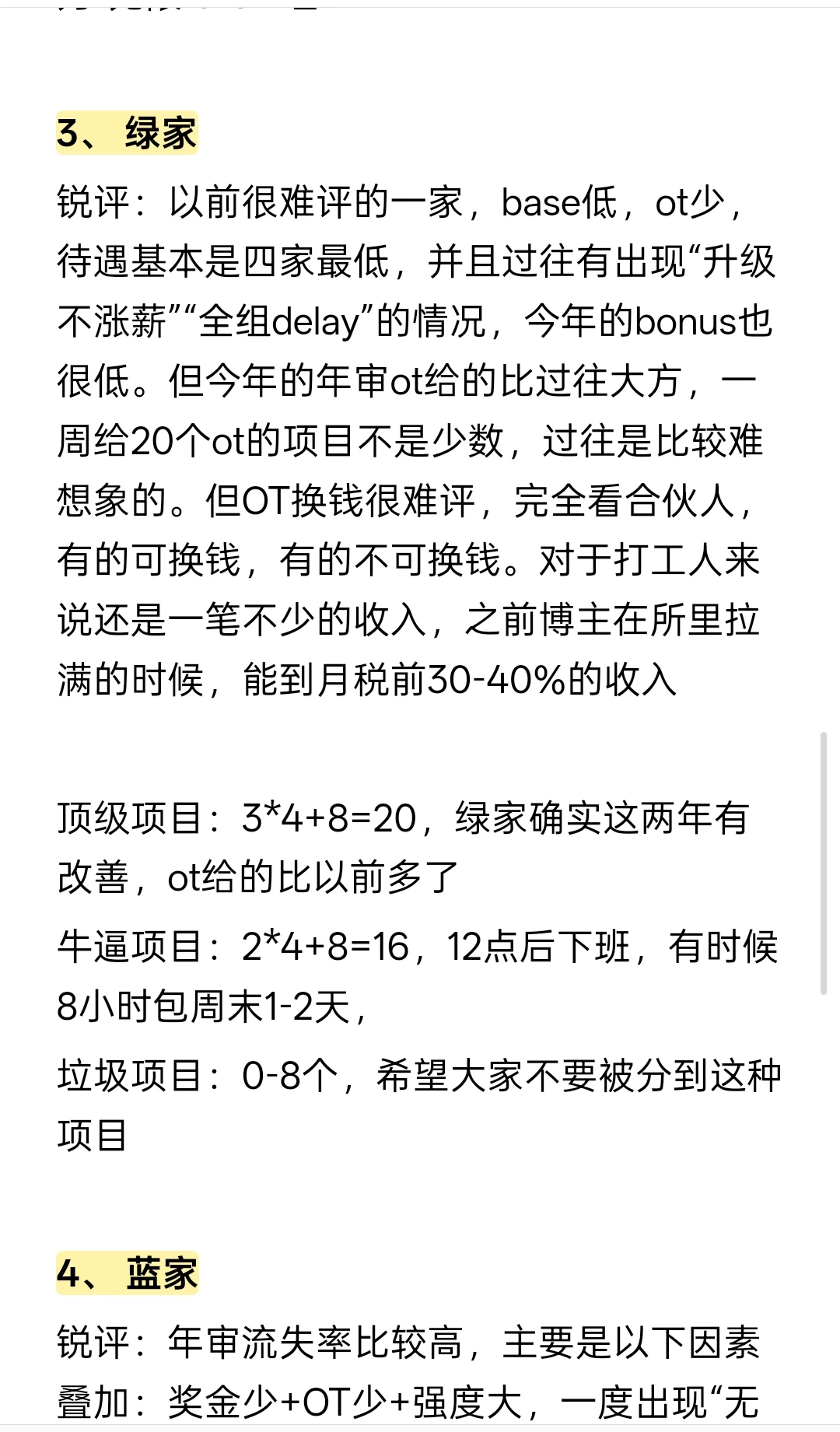 锐评:以前很难评的一家,base低,ot少,待遇基本是四家最低,并且过往有出现“升级不涨薪”“全组delay”的情况,今年的bonus也很低。但今年的年审ot给的比过往大方,一周给20个ot的项目不是少数,过往是比较难想象的。但OT换钱很难评,完全看合伙人,有的可换钱,有的不可换钱。对于打工人来说还是一笔不少的收入,之前博主在所里拉满的时候,能到月税前30-40%的收入