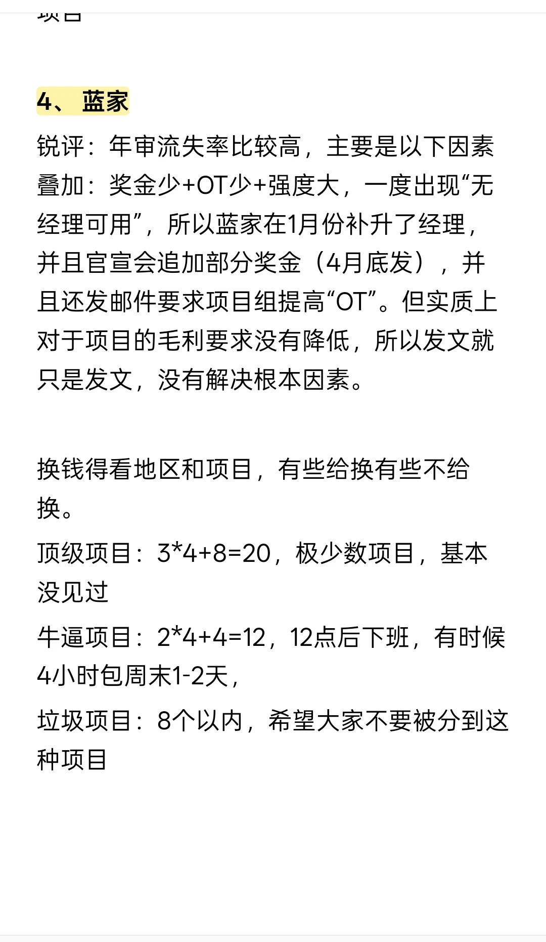 锐评:年审流失率比较高,主要是以下因素叠加:奖金少+OT少+强度大,一度出现“无经理可用”,所以蓝家在1月份补升了经理。