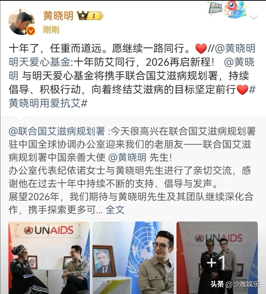 黄晓明,深夜高调发文! 3月20日傍晚,演员黄晓明一条“十年了,任重而道远”的社交平台发文,瞬间引爆全网热议。 比起他常年霸占热搜的感情八卦,这次他轻轻摊开的,是横跨十年、不掺喧嚣的防艾公益坚守,也让无数网友重新认识了这个始终身处话题中心的演员。 2016年,黄晓明正式被任命为联合国艾滋病规划署中国亲善大使,带着自己创办的明天爱心基金,一头扎进了防艾公益事业。彼时的他正处在人生高光时刻,与杨颖的恋情万众瞩目,2015年那场轰动娱乐圈的世纪婚礼,让他成了大众眼中妥妥的“人生赢家”。 婚后的他一边深耕演艺事业,一边持续推进公益,也迎来了儿子小海绵的出生。可生活总有起伏,2022年他与杨颖官宣离婚,后续与叶珂的恋情传闻频频登上热搜,私生活始终被放在舆论的放大镜下反复审视。 但任凭八卦喧嚣、争议缠身,他的防艾公益从未掉过线,十年间持续发声科普,带着团队跑遍各地做反歧视倡导,用自身影响力消解大众对艾滋病的偏见 。 2026年,他再次走进联合国艾滋病规划署驻中国办公室,收获了对方“十年不间断支持”的高度肯定,同时官宣将深化合作,继续朝着2030年终结艾滋病的目标前行。 最大的亮点,是这份“风雨不动安如山”的坚守。娱乐圈从不缺明星做公益,缺的是十年如一日的初心,最难得的是他的公益从未被人生的起落打断。 从万众瞩目的巅峰到婚姻破碎的舆论风波,不管是被追捧还是被非议,防艾这件事,他扎扎实实做了十年,累计资助受艾滋病影响的儿童414人次,捐赠相关善款140万元,用行动打破了“明星公益一阵风”的刻板印象。 而伴随而来的槽点与争议也从未停止,有网友直言“明星做公益就是立人设,选这个时候发文,无非是为了对冲新恋情的舆论争议”;也有网友感慨,他十年公益的热度,从来都比不上一次恋情绯闻,这是娱乐圈最现实的悲哀。 娱乐圈的流量来来去去,热搜上的八卦转瞬即逝,能真正被人记住的,从来都不是一时的话题热度,而是长年累月的责任与坚守。黄晓明的十年,一半是聚光灯下的感情起落,一半是无人问津的公益前行。 比起“人生赢家”的标签,比起顶流的光环,这份能给世界带来温度、给弱势群体带去光的坚持,这份明知会被质疑、依然十年不辍的初心,才是他作为公众人物,最硬的底气。