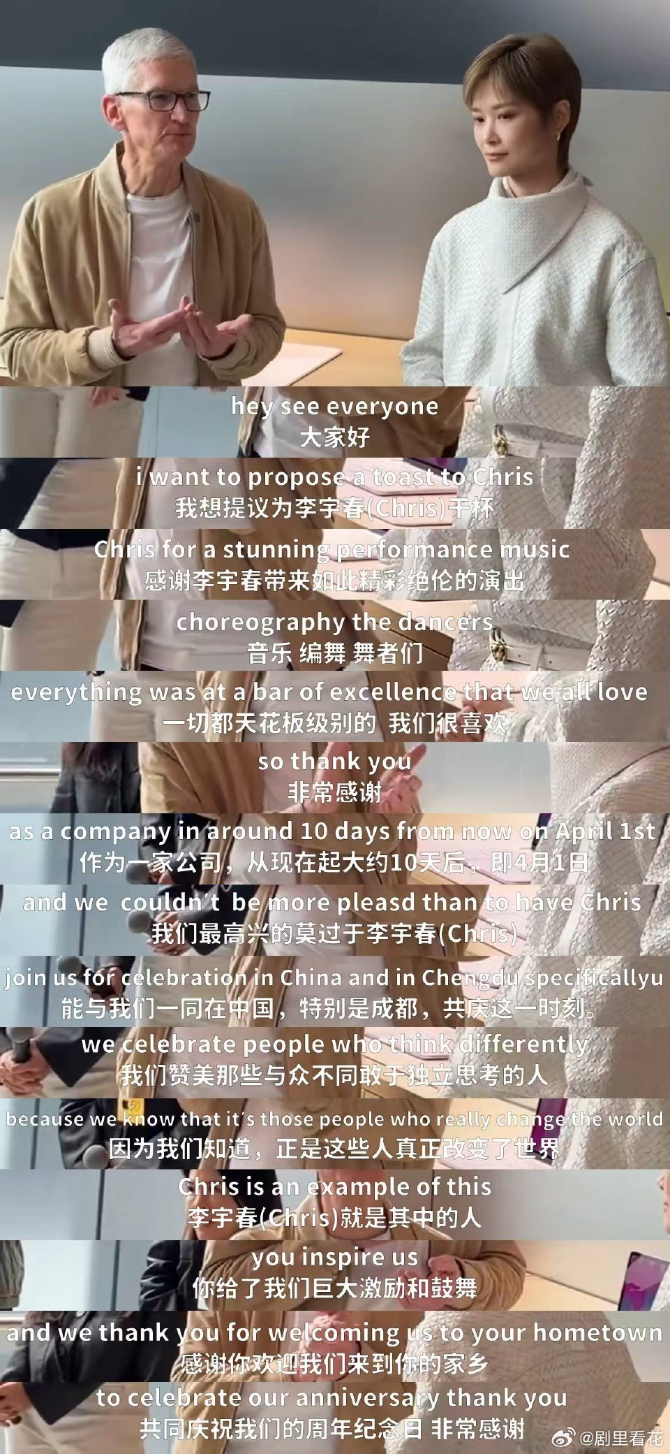 库克说李宇春的表演是现象级的 苹果50周年成都庆典亮点满满,李宇春的表演成为核心高光,库克亲自盖章现象级,让世界看到中国舞台的独特魅力。