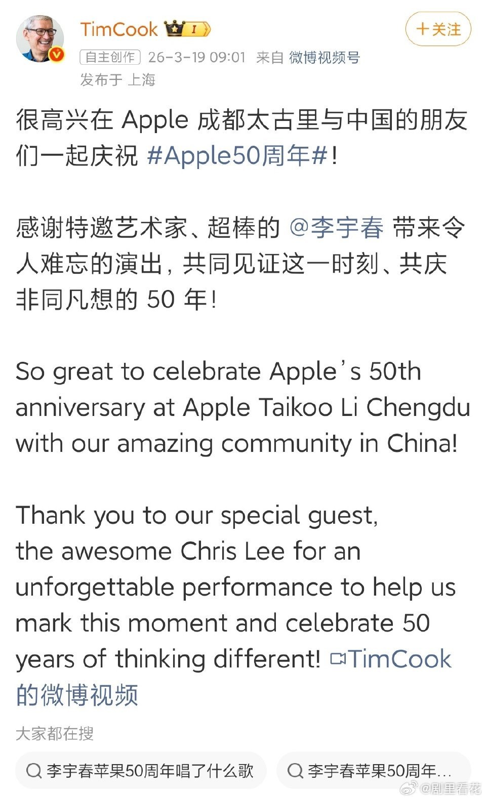 库克说李宇春的表演是现象级的 苹果50周年成都庆典亮点满满,李宇春的表演成为核心