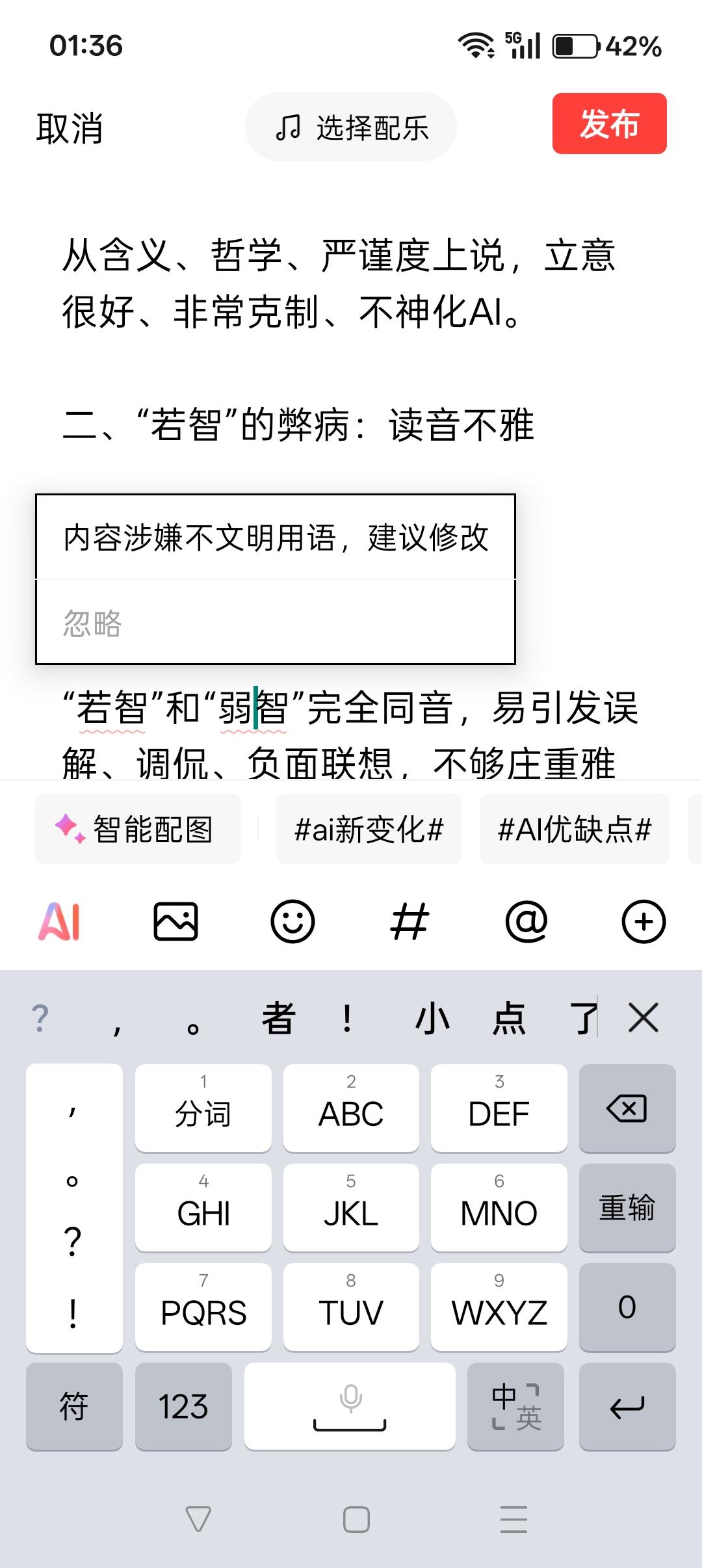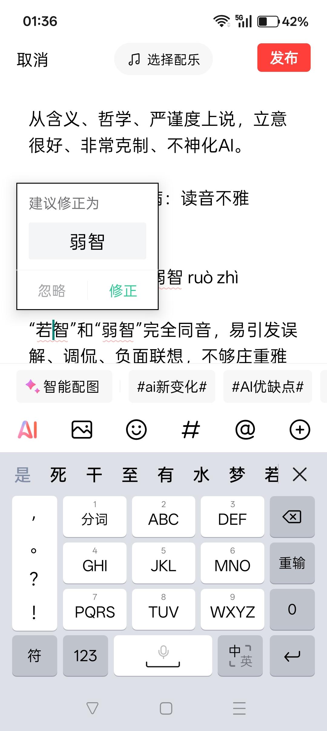 AI(人工智能)不能取名为“若智”! 人民网呼吁广大群众,给AI(人工智能)取个中文新名字,现向全社会征名。 有人说:叫“若智”吧,若表示类似、近似,智慧是生命体的专属,AI虽然可以像生命体一样“思考”,但本质上仍然不是生命体,叫“若智”最符合它的特性。 一、“若智”的思路(确实有道理) 若:好像、如同、近似、仿佛 智:智慧 若智 = 好像有智慧、近似智慧,但不是真智慧 “若智”的逻辑准、意思妙: AI 只是模仿、像人,但没有意识、不是真生命、不是真智慧。 从含义、哲学、严谨度上说,立意很好、非常克制、不神化AI。 二、“若智”的弊病:读音不雅 若智 ruò zhì 读音非常接近:弱智 ruò zhì “若智”和“弱智”完全同音,易引发误解调侃和负面联想,而且不庄重雅观,不适合作为官方科技名称。不知道的还以为把“若智”一词误写成了“弱智”。 连手机输入法都建议将“若智”修正为“弱智”,平台同时判定“弱智”为不文明用语。足见二者读音相同、歧义严重,不适宜作为正式科技名称。(如配图所示)。 总之,官方不可能用,行业不方便用,民间觉得滑稽可笑。“若智”不如“仿智”。