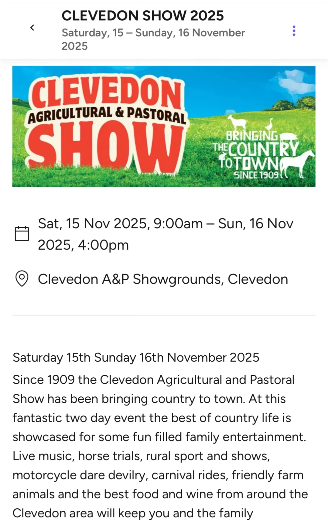 纽村一年一度必去活动!Clevedon农业展2025年重磅回归![赞R] 从1909年举办至今,是新西兰真正的老牌田园盛会~[得意R] 🎡 活动亮点: ✅ 亲密接触超萌农场动物 ✅ 观看马术比赛+摩托车特技表演 ✅ 畅玩复古嘉年华游乐设施 ✅ 品尝Clevedon本地美食美酒 ✅ 淘选农家特产与手工艺品 📅 时间:2025年11月15日(周六)9am-5pm | 11月16日(周日)9am-4pm 📍地点:Clevedon Showgrounds, 107 Monument Road, Auckland 🎫 购票:可官网提前预订或现场购票 ✨ 游玩小贴士: · 建议穿舒适步行的鞋子,场地很大 · 带上防晒用品和现金,部分摊位可能只收现金 · 超多亲子互动项目,超适合带娃放电一整天![棒R] 关注我,下一篇更精彩