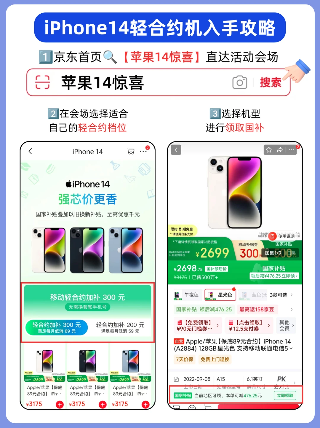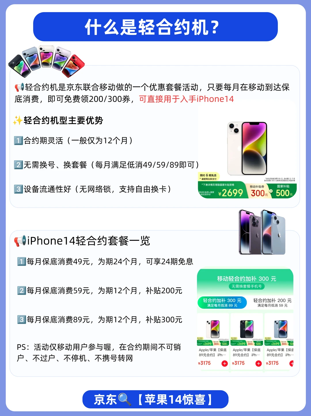 轻合约机是京东联合移动做的一个优惠套餐活动,只要每月在移动到达保底消费,即可免费领200/300券,可直接用于入手iPhone14