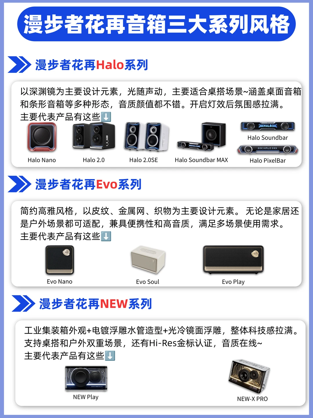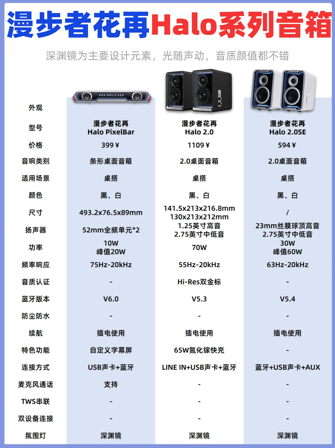 漫步者花再Halo Soundbar、Halo Soundbar MAX、Halo PixelBar,条形设计搭配显示器更佳。Halo2.0、Halo2.0SE,适合追求高音质体验的宝子选择,听歌、玩游戏沉浸感更足