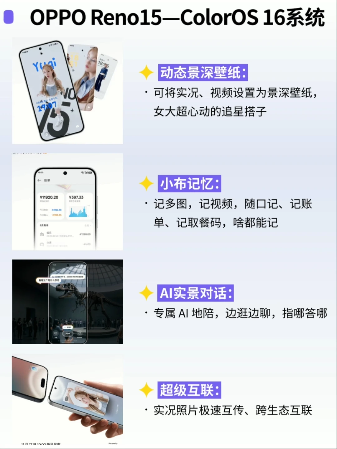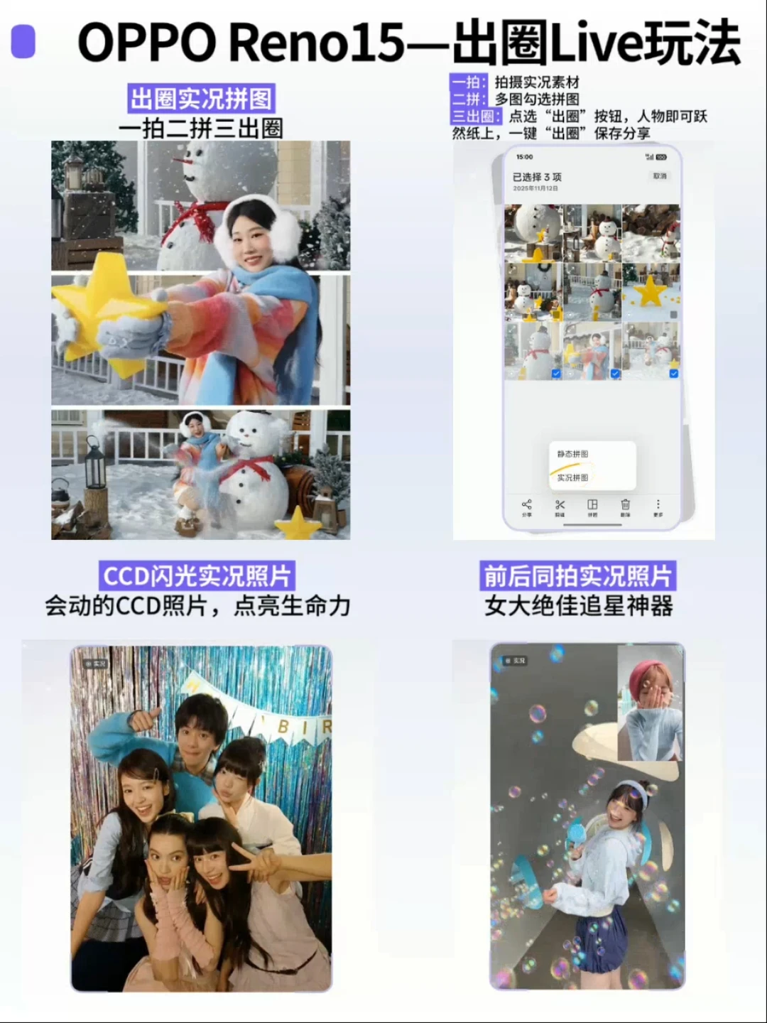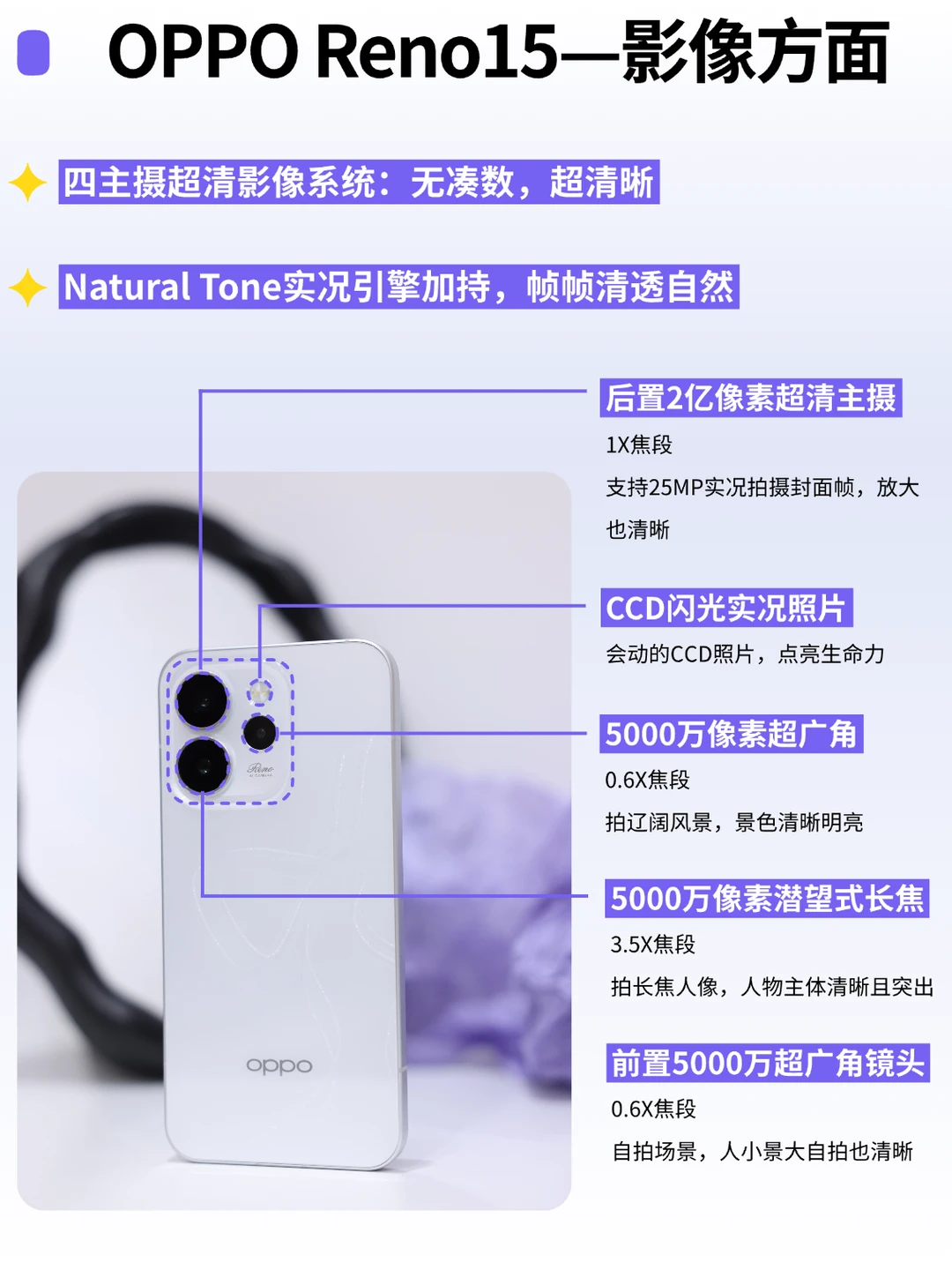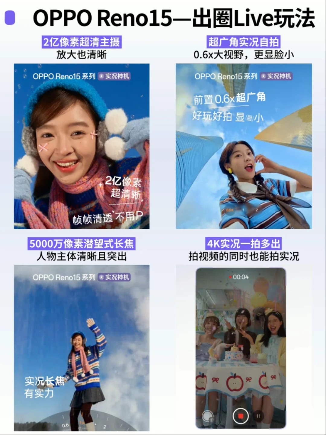 OPPO Reno15 抢先看~估计很对拍照爱好者的胃口~ 作为 “超出圈的 Live 图神机”,“一拍二拼三出圈” 的核心玩法实用又有新意,年末想换机的可以多留意~ ✨ 四主摄超清影像系统,实况直出很省心 ●无凑数四主摄配置扎实 ●2 亿像素主摄 1X 焦段支持 25MP 实况封面,细节还原清晰 ●5000 万潜望长焦 3.5X 拍人像,主体突出、背景虚化自然 ●5000 万超广角 0.6X 拍风景视野开阔,多人合照不拥挤 ●前置 5000 万超广角自拍,0.6X 画幅能自然显脸小 ●搭配 Natural Tone 实况引擎,影调清透不厚重,日常随拍不用修图也能直接发圈📸 ✨ 实况玩法有新意,创作更灵活 ●超出圈的Live图神机,一拍二拼三出圈: 一拍存好实况素材 二拼勾选心仪画面 三点击 “出圈”,人物就能呈现跃出画面的动态效果,发圈很吸睛。 ● CCD 闪光实况带复古质感 ●4K 实况一拍多出,拍视频时能同步抓取高光帧 ●前后同拍功能也不错,双视角同步记录,还支持均分、图形、矩形三种排列,不管是追星还是探店,都能丰富拍摄素材🌟 ✨ 星光蝴蝶结 + 精致小直屏,颜值手感在线 “星光蝴蝶结” 配色采用全息光刻工艺,光线照到转动时能看到细腻的光影效果,很有质感。 星光镜组里还点缀着细腻的闪光砂,通透且层次丰富 6.32 英寸极窄四等边小直屏,视觉通透且操作顺手 187g 的轻量化机身,举着拍照久了也不会累。 高亮冰透玻璃背板 + 金属中框,触感丝滑还不易沾指纹,加上 IP69 防水防尘,日常使用很放心💖 ✨ ColorOS16 加持,实用功能不少 ●动态景深壁纸能把实况设为桌面,锁屏也能互动,追星党会喜欢 ●AI实景对话功能很实用,导航、查点评小布地陪一键就能搞定,旅行时能派上用场 ●小布记忆支持语音存账单、取餐码,不用特意记笔记 ●超级互联能跨设备传输 Live 图,和闺蜜分享照片很方便🔗 这波Reno15 影像表现、外观设计和实用功能都兼顾到了,综合表现挺亮眼的 喜欢的宝子可以关注一下11.17 发布会,特别是对拍照和颜值有要求的用户可以重点了解~