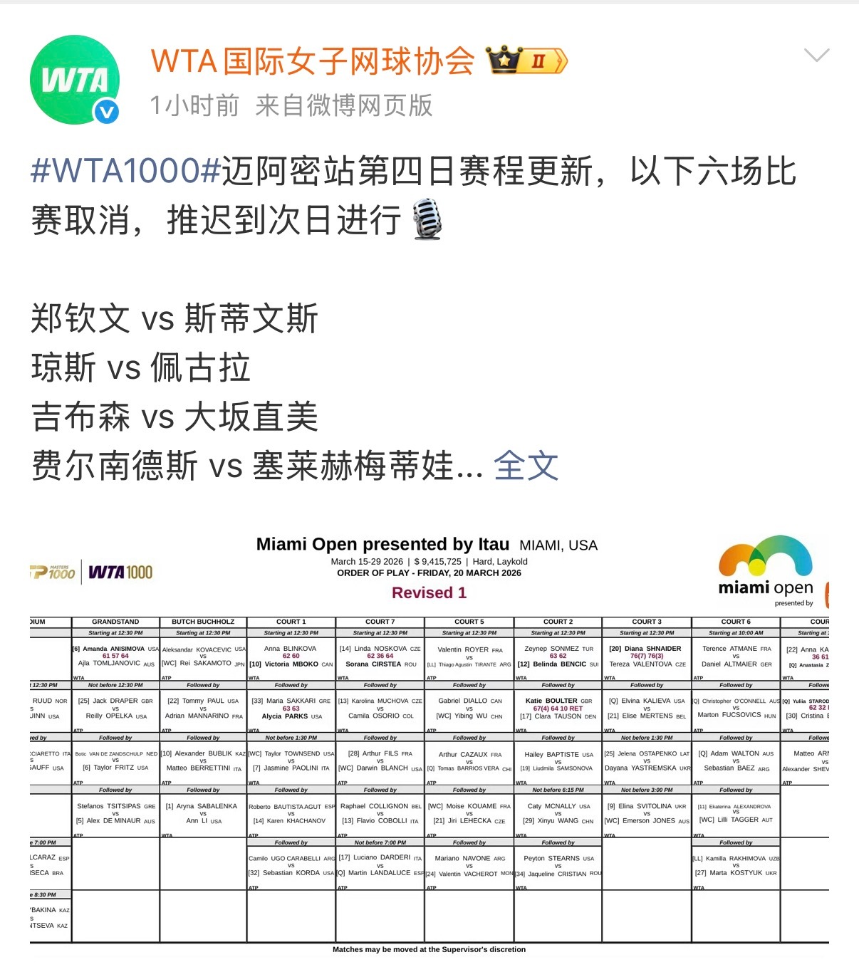 🌧郑钦文的比赛因雨推迟到明天 郑钦文比赛因雨推迟