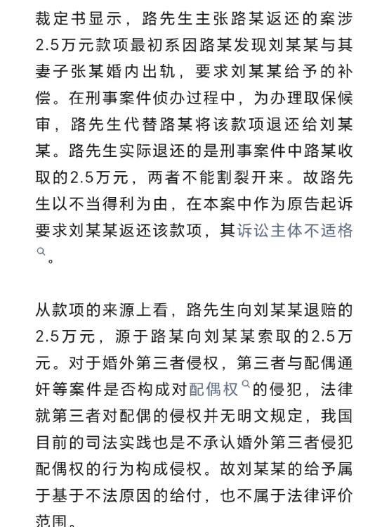 山东淄博,一位妻子把孩子送到辅导班学习后,与情夫在辅导班楼下的酒店开房,正在进行时,其丈夫突然闯了进来!   2021年的一天,淄博路先生的妻子准备送孩子去课外辅导班,与往日不同的是,她今天出门前花费了大量的时间化妆,如此刻意的装扮让一旁的路先生觉得有点不对劲。 以往接送孩子的时候,妻子都没有这么细致的准备过,想到这里,路先生的心里涌现出了一丝不安的感觉,他决定偷偷跟在妻子后面看看她到底要去哪里。 路先生压低身形跟在妻子身后,看着对方将孩子顺利送进辅导班教室后,本以为妻子会就此返程,可女子转身便踏入了辅导班楼下的一家酒店。 他强压着内心的慌乱,推门进入酒店,眼前的景象彻底击碎了他对家庭的期许,自己的妻子竟然在和一名陌生男子开房! 这名陌生男子姓刘,他并非不知晓女子的婚姻状态,却依旧与其保持着不正当的往来,全然不顾婚姻与家庭的底线。 被背叛的怒火瞬间冲垮了路先生的理智,积压已久的委屈与屈辱一齐涌上心头。他再也控制不住情绪,上前击打了刘某,只想用最直接的方式,宣泄心底的痛苦与不甘。 刘某自知行为有违道德,全程没有反抗,还主动提出用金钱弥补自身过错,试图快速平息这场冲突。 双方私下达成约定,刘某当场向路先生转账两万五千元,这笔钱作为过错补偿,双方就此不再追究。 拿到钱款的路先生以为这场难堪的闹剧就此结束,可事态的发展完全超出了他的预料。 刘某离开后心态彻底反转,不甘心钱款的流失,随即前往公安机关报案,指控路先生存在敲诈勒索行为。 消息传来,路先生陷入了极度的惶恐之中,为了帮儿子摆脱牢狱之灾,路先生的父亲立刻凑齐两万五千元全数退还给刘某,刘某收下退款后出具了谅解文书。 同年,淄博张店区法院对这起敲诈勒索案进行了审理,法庭结合当时的证据链与审理程序,认定路先生以非法占有为目的,采用胁迫方式索取他人财物。 并且,涉案金额已经达到了法定标准,行为已构成敲诈勒索罪,最终判处路先生有期徒刑六个月,并处五千元罚金。 拿到判决书的路先生难以接受这一结果,作为婚姻中的受害方,他的冲动源于亲眼目睹的背叛,钱款更是对方主动提出的赔偿,可妻子与刘某的过错行为却未受到任何惩处。 不甘心的路先生提起上诉,二审法院审理后依旧维持原判,有罪的判定像一块巨石压得他喘不过气。 就在路先生近乎绝望时,事情迎来了关键性转折。随着事件社会关注度的提升,2023年山东省高级人民法院对该案进行全面复核,认为案件存在事实认定偏差,指令淄博市中级人民法院启动再审程序。 再审庭审中,法院全面梳理事件始末,重新界定双方过错与钱款性质。法庭明确刘某明知他人有配偶仍维持不正当关系,行为严重违背公序良俗,存在核心过错。 涉案的两万五千元是刘某主动提出的过错赔偿,并非路先生强行索要,路先生不存在非法占有的主观故意。最终淄博中院依法改判,宣告路先生无罪。 重获清白的路先生想起此前被退回的两万五千元,心中再起波澜。这笔钱是刘某自愿支付的道德赔偿,父亲当初退款只是情急之下的无奈之举,刘某收下退款的行为于理不合。 2023年,路先生以不当得利为由将刘某告上法庭,要求对方返还本金及利息共计两万八千元。 今年3月13日,张店区法院对这起民事纠纷案作出裁定,认定路先生的诉求不符合法律程序规定,依法驳回了他的诉讼请求。 路先生并未放弃,在与代理律师沟通后,决定继续提起上诉,用法律途径维护自身权益,最终结果仍需等待法院的审理判决。 法律始终以事实为依据,在不断核查与纠正中坚守公平正义,既不纵容违背道德的行为,也不冤枉情理之中的冲动之举。 相信后续的司法程序会给出最公正的结果,也愿每个人都能坚守婚姻忠诚,扛起家庭责任,守住法律与道德的底线。