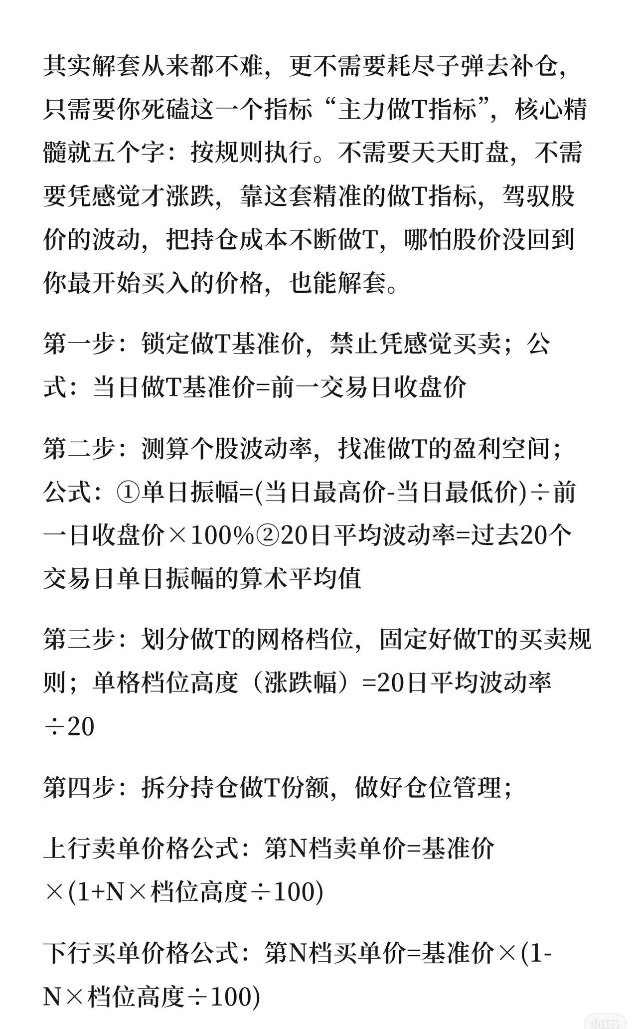 针对炒股全仓被套难题,介绍“主力做T指标”解套法,核心是按规则执行,无需天天盯盘、凭感觉操作,通过精准做T降低成本,哪怕股价未回到买入价也能解套。 解套步骤(4步): 1. 锁定做T基准价:当日做T基准价 = 前一交易日收盘价(固定锚点,避免凭感觉买卖)。 2. 测算波动率(找盈利空间): - 单日振幅 =(当日最高价 - 当日最低价)÷ 前一日收盘价 × 100%; - 20日平均波动率 = 过去20个交易日单日振幅的算术平均值。 3. 划分网格档位(定买卖规则):单格档位高度(涨跌幅)= 20日平均波动率 ÷ 20。 4. 拆分持仓份额(仓位管理): - 上行第N档卖单价 = 基准价 × (1 + N×档位高度÷100); - 下行第N档买单价 = 基准价 × (1 - N×档位高度÷100)。 解决的散户痛点: 市面做T方法多但散户易失败(核心问题:无固定锚点、仓位管理混乱、情绪化操作),这套网格做T法通过固定锚点(基准价)、明确仓位/买卖规则(网格档位+公式)、量化操作(非情绪化),一次性解决三大痛点。