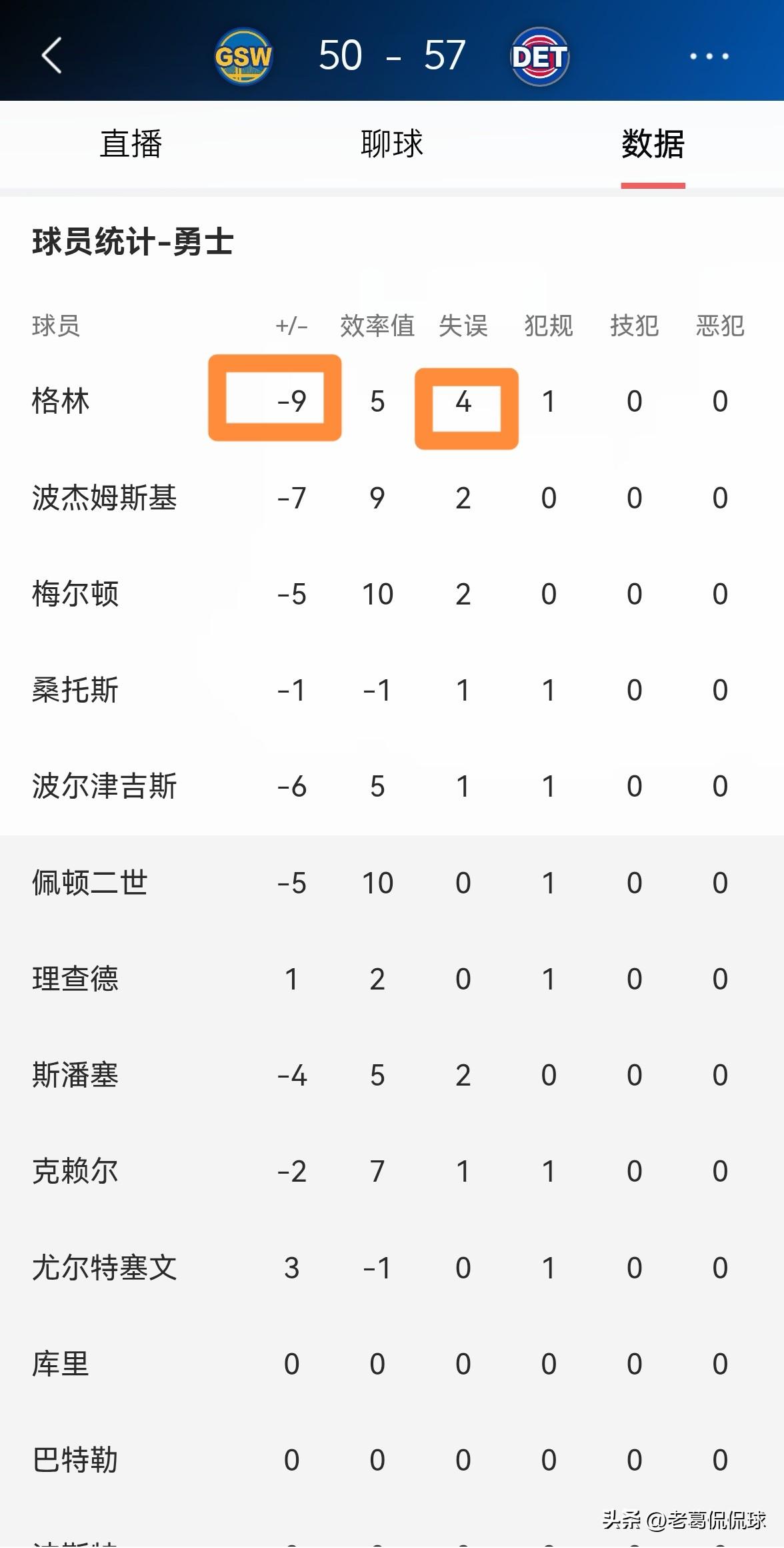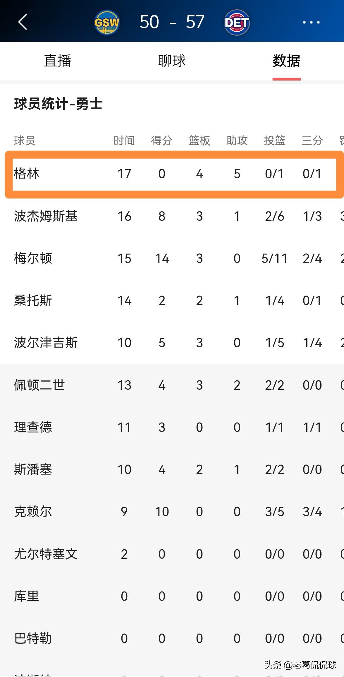 勇士主帅科尔真是被追梦格林给气炸了!在今天勇士客场挑战活塞的比赛中,目前双方半场战罢,勇士以50:57处于落后。值得一提的是,在前两节比赛中,追梦格林在怒砍0分的情况下出现了4次失误,他的一次又一次失误让科尔教练怒火中烧。 在上半场比赛中,追梦格林首发出战17分钟,投篮1中0怒砍0分,还有4次失误,他的场上正负值为球队最低的-9。 说实话,如果勇士想要在客场击败活塞,那么科尔教练必须在下半场比赛中弃用追梦格林,追梦格林的心思完全不在球场上。