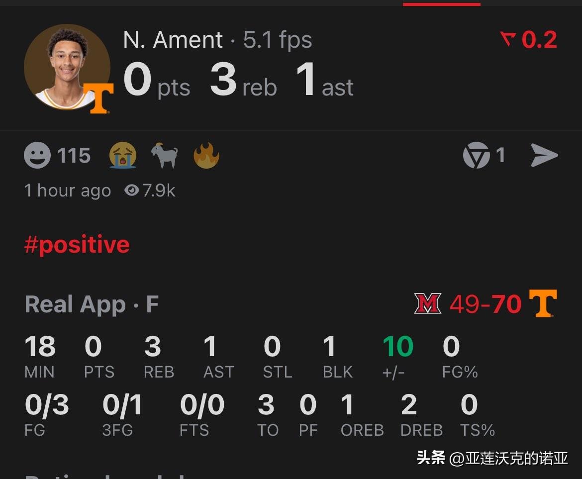 田纳西前锋Nate Ament首轮出场18分钟得到3篮板,主帅Rick Barnes说他脚踝带伤,领先时让他休息是为了备战后续,球评Seth Greenberg对阿门特评价极高,他让我想起了杜兰特,未来绝对是NBA全明星。
