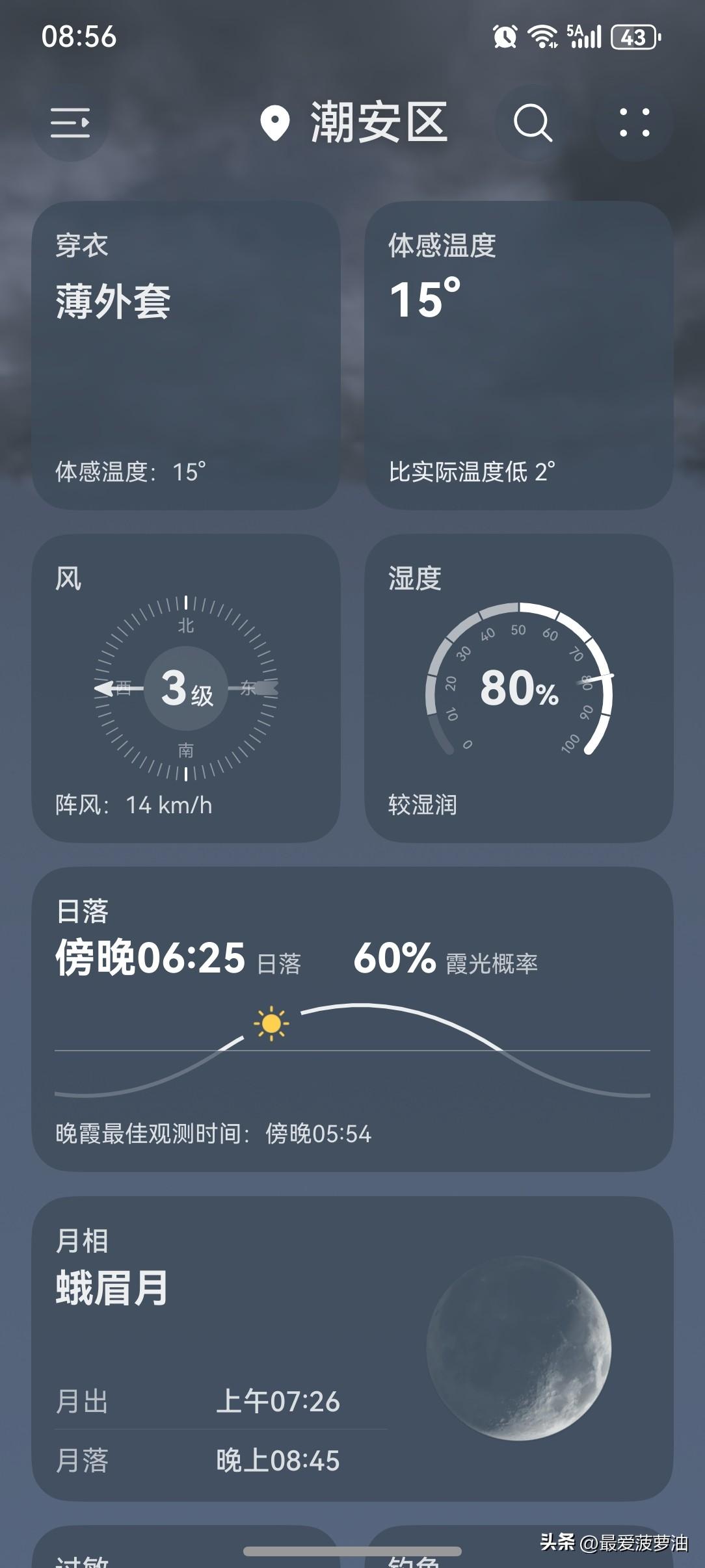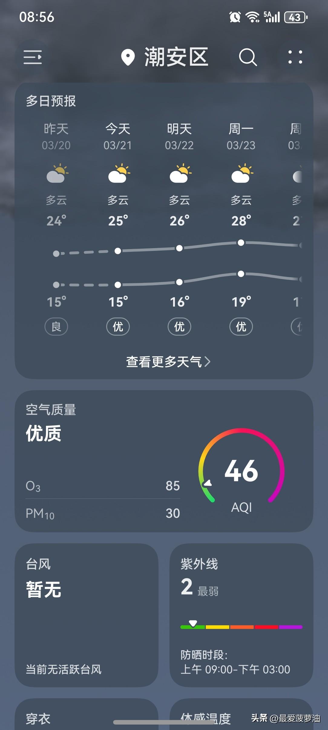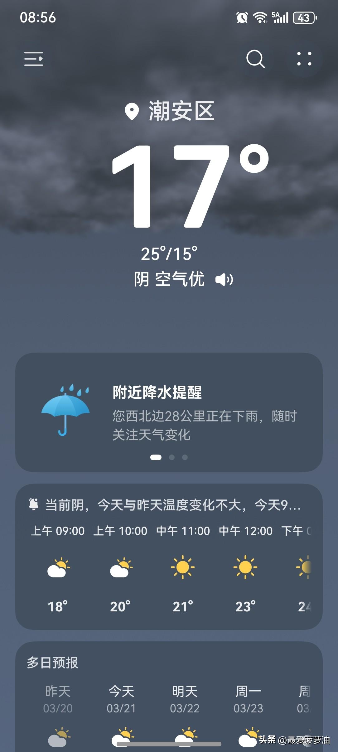 广东多地周六有中雨或大雨!大部市县周日可见阳光,早晚有雾! 21日,粤北和珠江三角洲北部市县阴天间多云有小雨,其中,韶关及清远的南部、肇庆、河源北部市县局部有中雨或大雨;22~23日,大部市县可见阳光,早晚有轻雾局部有雾。 今天(21日),潮州喜提一个多云天气,气温15~25℃,此刻气温17℃,体感温度15℃。 今天的气温跟昨天差不多,但早上感觉有点冷! 一起来看看今天的天空吧!云量有点多,完全遮住了太阳,一点阳光也看不到了。 没有了阳光的加持,天气阴沉,大风一吹,体感更冷! 周末准备外出游玩的小伙伴们,出门记得多带件衣服,以防万一!毕竟现在才是二月呢!天气乍暖还寒的,变化节奏快,需要密切留意天气预报,适时增减衣物,别让感冒病毒有机可乘!