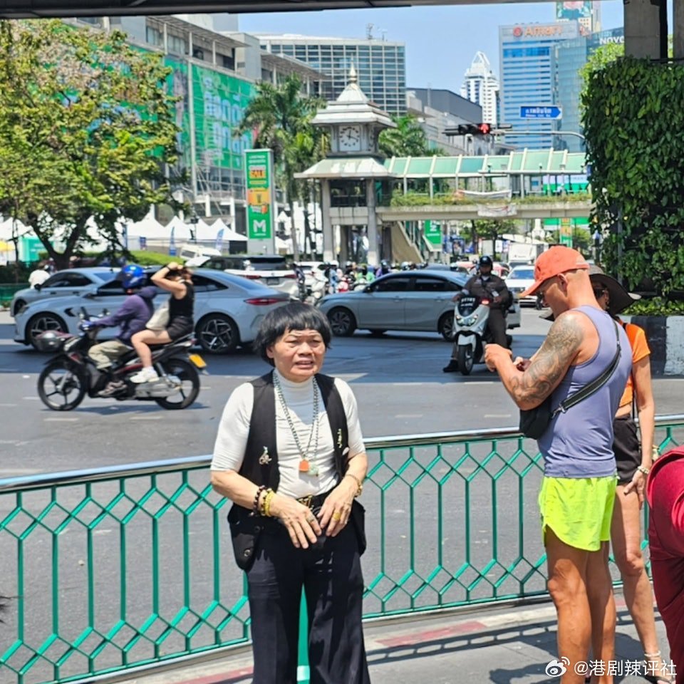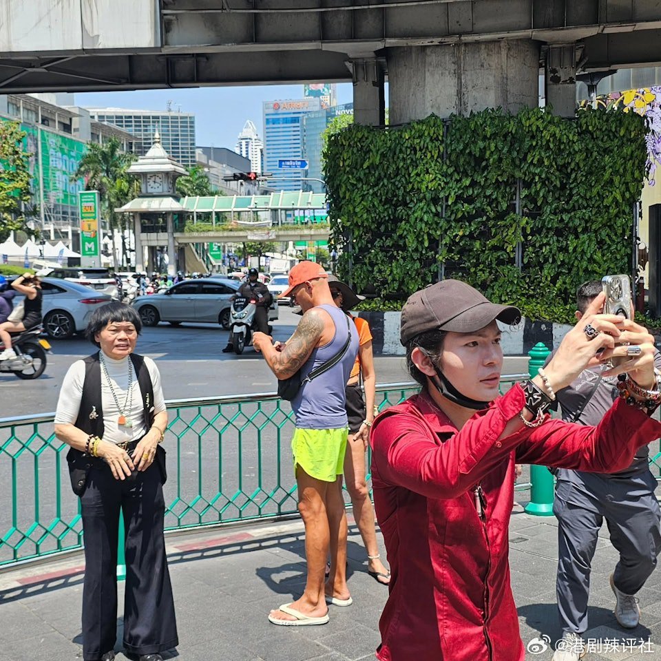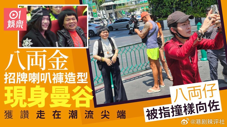 日前有網民在Threads發文,分享在泰國曼谷四面佛野生捕獲八両金與兒子「八両仔」。相中可見,八両金依然留著招牌冬菇頭,身穿白色貼身中袖上衣及黑色馬甲,下身就穿上十年不變的喇叭褲。而照片的右邊,頭戴Cap買的「八両仔」大熱天時穿山紅色長袖外套,拍攝四面佛。