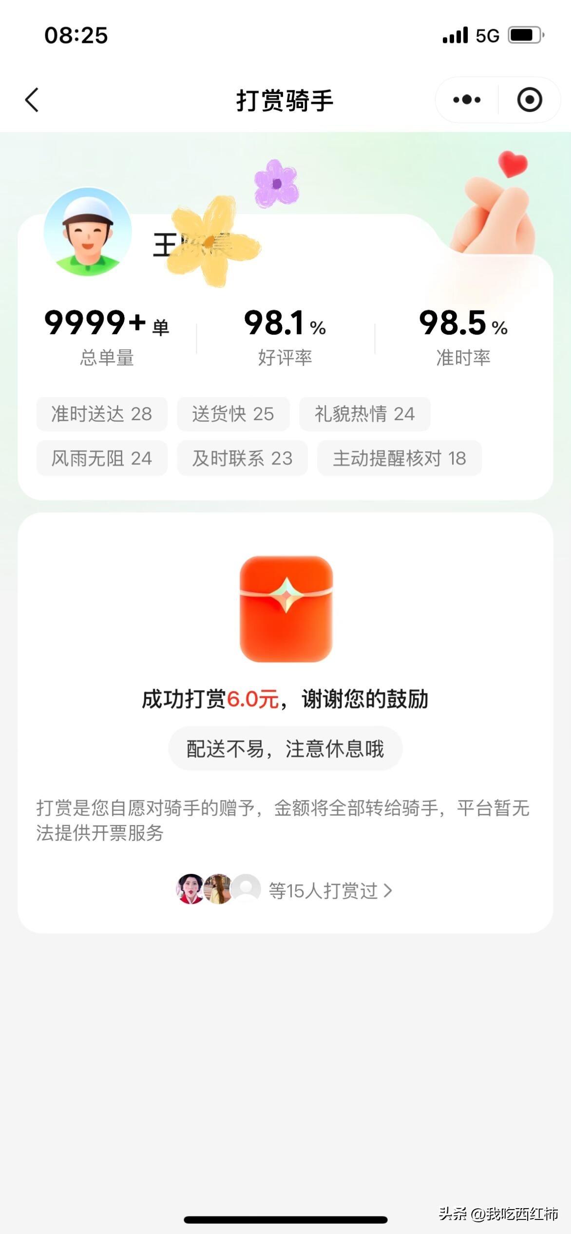 世界破破烂烂,总有人缝缝补补 起因是昨天晚上10点多,我点了小象超市的外卖,买了1瓶2L无糖可乐、1块奶油蛋糕🍰、其他是一些面包和馒头。 后面骑手送到的时候给我打电话,我说放门口就行,骑手说他在送货的路上摔了一跤,坚持让我去门口确认一下。 然后我打开门,看到骑手满脸抱歉,地上的大可乐标签已经磨烂了,蛋糕的奶油都沾到盒子上了,他一个劲道歉说“不好意思,刚刚路上摔了一跤”。 我看到可乐标签都烂了,心想这一跤摔得肯定不轻,不过东西没坏也不影响吃,我就说“没关系,可乐没有摔坏就行”。 但是骑手还是坚持说“真的很不好意思,我这边赔偿你”,说着他拿出手机想要给我转钱,我立马说“真的不用,你放心我不会给你打差评的,真的不用了!”,说完我就准备拿着东西回屋里,最后他满脸抱歉说了一句“谢谢”。 后来我在客厅吃那个奶油蛋糕🍰,边吃边在想骑手这一跤肯定摔得不轻,而且他态度又这么诚恳,大环境这么差大家都很不容易,我就给他打赏了6块钱。 今天早上出门,看到门口放着这个小袋子,里面是2瓶可乐➕1盒橘子,问了男朋友确认没有点外卖,就想到应该是昨天的骑手放的,瞬间被治愈到。 世界破破烂烂,总有人在缝缝补补❤️。即使现在大环境这么难,经济下行、降薪、失业、AI革命,这些焦虑压得我们喘不过气,但生活还在继续,这个世界还是有很多微不足道但温暖的小事在治愈我们~