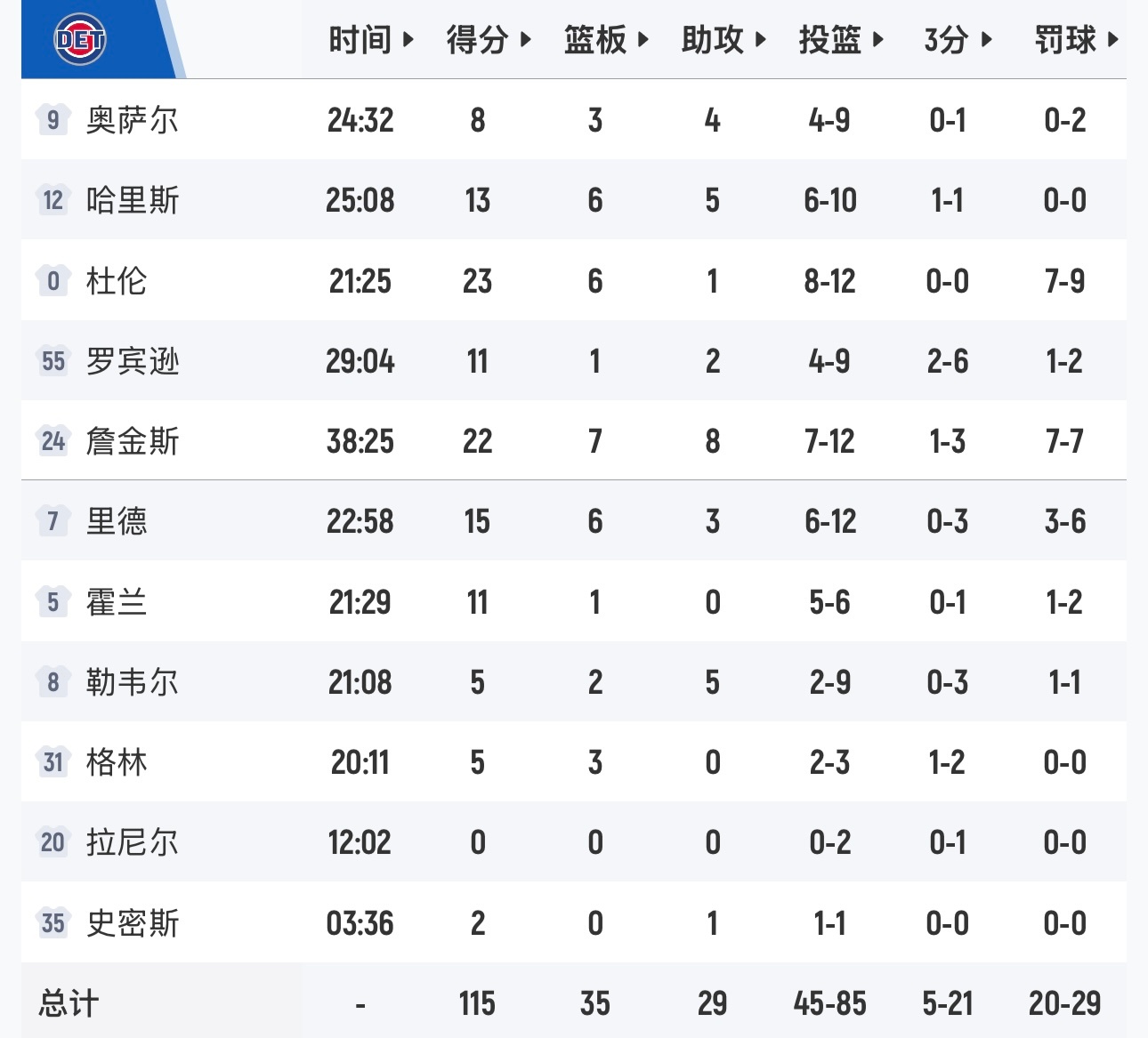 波尔津吉斯伤退,追梦格林0分,活塞115-101勇士取得三连胜,下周二主场对阵湖人。
