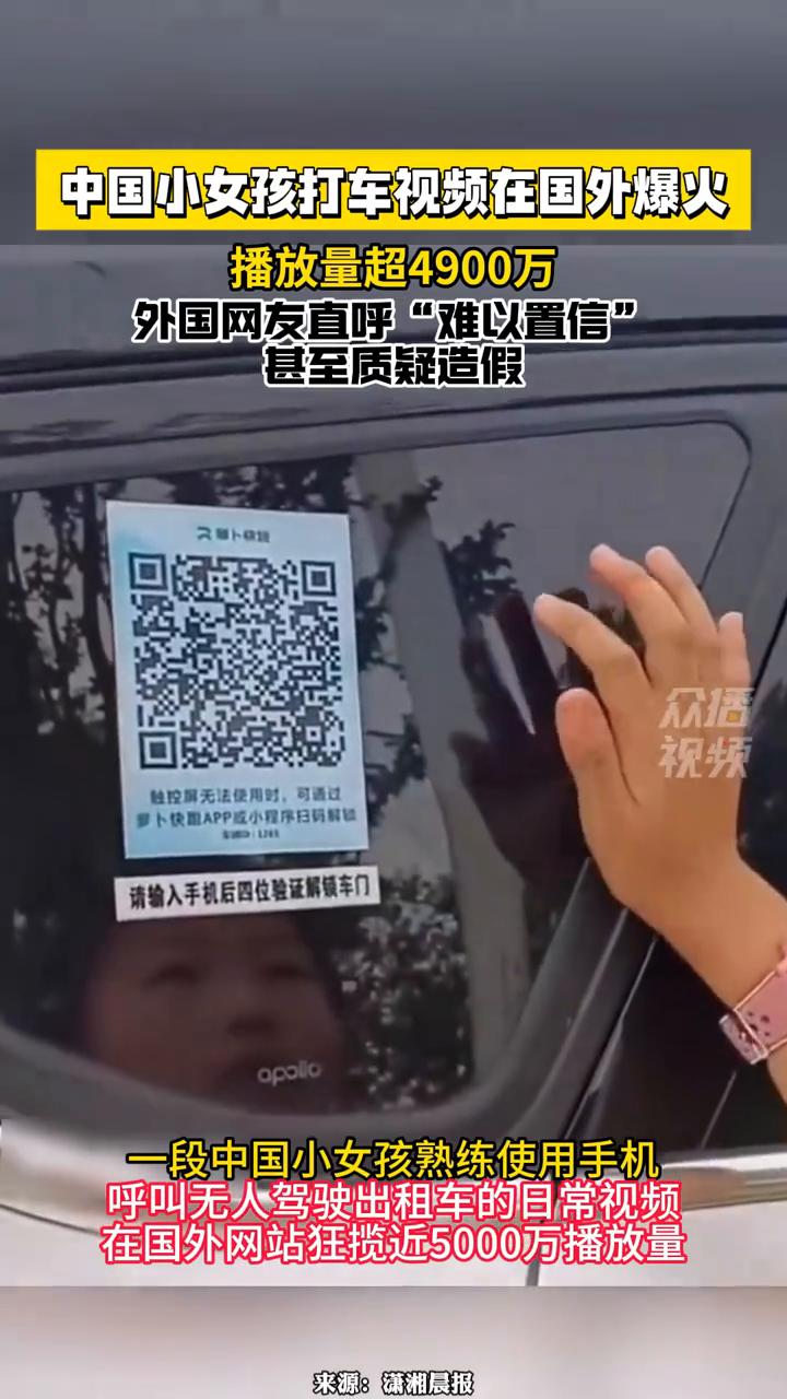 中国小女孩打车视频在国外爆火,播放量超4900万,外国网友直呼"难以置信",甚至质疑造假。 潇湘晨报。 近日,潇湘晨报综合"中国小女孩打车视频"这一话题登上热搜。一段中国小女孩熟练使用手机呼叫无人驾驶出租车的日常视频在国外网站狂揽近5000万播放量,其展现的科技生活化场景让部分外国网友直呼"难以置信",甚至质疑视频造假。 据悉,该视频拍摄于武汉,是国内首个开放无人驾驶网约车商业化运营的城市。
