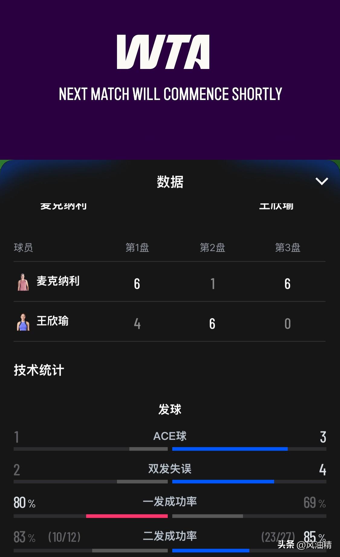 油条换鸡蛋🥚[捂脸] 没有等到郑钦文,那就看看王右吧,结果在刚刚结束的WTA迈阿密次轮,王欣瑜苦战三盘不敌麦克纳利。首盘惜败后她迅速调整,以6-1利落送出“油条”扳平战局,攻防节奏把控亮眼。遗憾决胜盘状态断崖下滑,遭6-0送蛋崩盘,暴露体能续航与关键分抗压短板。两盘反差太大,王一轮的名号是要坐实了[捂脸]
