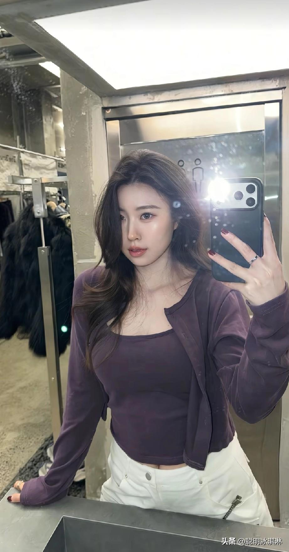 紫色毛衣+白色裤子,简约又时尚,镜子里的你最美!