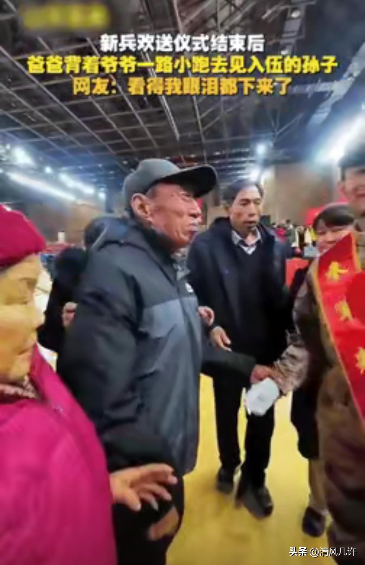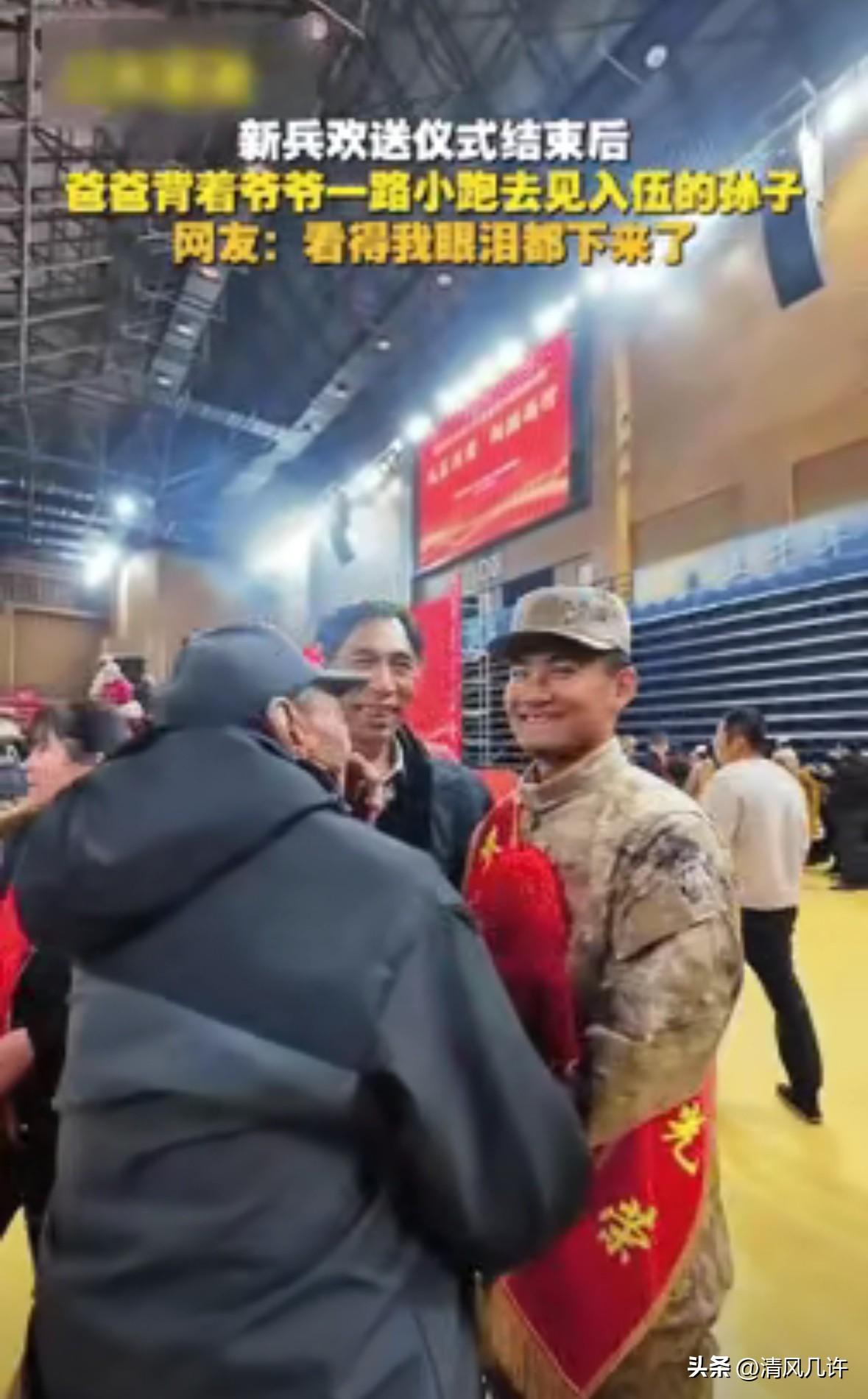 山东日照,一新兵欢送仪式结束后,一位父亲背着年迈的爷爷一路小跑去见入伍的孙子。结果找到后,爷爷看着身穿戎装的孙子,紧紧握着其手,激动的热泪盈眶!网友:“看哭了,我们国人特有的爱国拥军情怀!” 这一幕发生在3月18日莒县2026年上半年新兵入伍欢送仪式的现场。 仪式刚落下帷幕,家属与新兵的短暂见面环节紧跟着开始,偌大的场馆里瞬间挤满了人,喧闹的人声里裹着无数家庭的牵挂与期盼。 这位00后新兵的爷爷腿脚早就不利索,没法在拥挤的人潮里快步挪动,眼看孙子所在的队列就要集合出发,老人的眉头拧成一团,眼神里的焦急藏都藏不住。父亲没跟家里人多商量,只是稳稳蹲下身,让爷爷慢慢伏在自己背上,双手牢牢托住老人的腿弯,起身时微微沉了沉肩,便朝着新兵队列的方向迈开了步子。 他的脚步迈得又急又稳,呼吸渐渐变得粗重,额角的汗珠顺着脸颊往下滑,却始终没放慢哪怕一步——他心里清楚,背上是含辛茹苦养自己长大的长辈,前方是即将奔赴军营保家卫国的孩子,这一路跑的,是三代人之间扯不断、割不开的牵挂。 穿过攒动的人群,绕过一排排白色的座椅,父亲终于在队列前停下了脚步,他小心地弯下腰,慢慢将爷爷从背上放下来,生怕颠着老人。 爷爷站稳后,几乎是凭着本能,目光瞬间锁定了那个身披光荣绶带、胸戴大红花的熟悉身影,脚步颤巍巍地挪过去,伸出布满老年斑、皱得像树皮一样的手,紧紧攥住了孙子的手腕。 他张了张嘴,却没说出一句完整的话,只是看着眼前一身戎装的孩子,浑浊的眼睛里慢慢蓄满了泪水,顺着眼角的皱纹往下淌,打湿了衣领的边角。孙子也红了眼眶,轻轻回握住爷爷的手,能清晰感受到老人掌心的温度与微微的颤抖,那里面有不舍,有牵挂,更有藏不住的骄傲与自豪。 站在一旁的父亲,看着眼前紧紧相依的祖孙俩,抬手轻轻拍了拍儿子的后背,没说一句“好好干”“注意安全”之类的叮嘱,却把所有的期许与牵挂,都藏在了这个简单又有力的动作里。 这段十几秒的视频被现场的人随手拍下,很快在社交平台上传开,短短几个小时就戳中了无数网友的泪点,相关话题接连冲上热搜。 有人在评论区里写下一句“背着养我的,看望我养的”,简简单单九个字,却道尽了这一幕里最朴素也最厚重的亲情。 这不是刻意编排的煽情戏码,是刻在中国人骨子里的孝与爱:父亲用脊背扛起对长辈的赡养责任,用奔跑的脚步传递对晚辈的期许与支持;爷爷用满眶的热泪,诉说着对孙子的不舍,更表达着对家国的拥护与支持;而即将踏上军旅征程的新兵,用一身戎装回应着家人的期盼,也主动扛起了保家卫国的责任与担当。 三代人的身影,在这个小小的送兵现场,拼成了一幅最动人的家国画卷——没有华丽的辞藻,没有激昂的口号,只有最实在、最朴素的行动,却比任何宣传都更有力量,更能打动人心。 有人说,这是中国人独有的浪漫,把对家人的小爱,对国家的大爱,都揉进了日常的一举一动里。从爷爷那辈人可能经历过的动荡岁月,到父亲这辈人默默扛起的生活重担,再到孙子这辈人主动选择的军旅之路,传承的不仅是血脉,更是刻在骨子里的家国情怀。 一人参军,全家光荣,从来不是一句空泛的口号,它藏在父亲奔跑的脚步里,藏在爷爷紧握的手掌里,藏在每一个普通人对家国的赤诚与热爱里。这一幕之所以能看哭无数人,正是因为它让我们看到了,最动人的家国情怀,从来都不在远方,就在这些平凡人的平凡举动里。 各位读者你们怎么看?欢迎在评论区讨论。