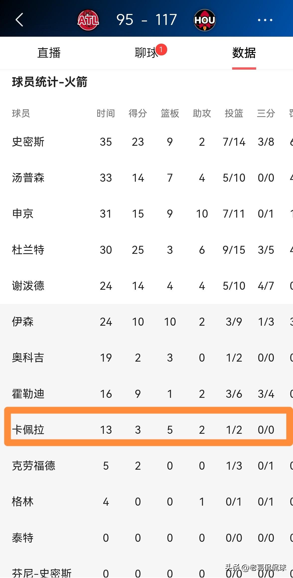 火箭老将卡佩拉真是太不懂事了!在今天火箭主场以117:95大胜老鹰的比赛中,卡佩拉面对旧主真是毫不留情,他在攻防两端都打出了可圈可点的表现。 整场比赛下来,卡佩拉替补出战13分钟,投篮2中1,其中罚球4中1得到3分5篮板2助攻1抢断,他的场上正负值为+8。 老实说,卡佩拉真是太不懂事了,他怎么能在面对旧主时打的这么好呢?