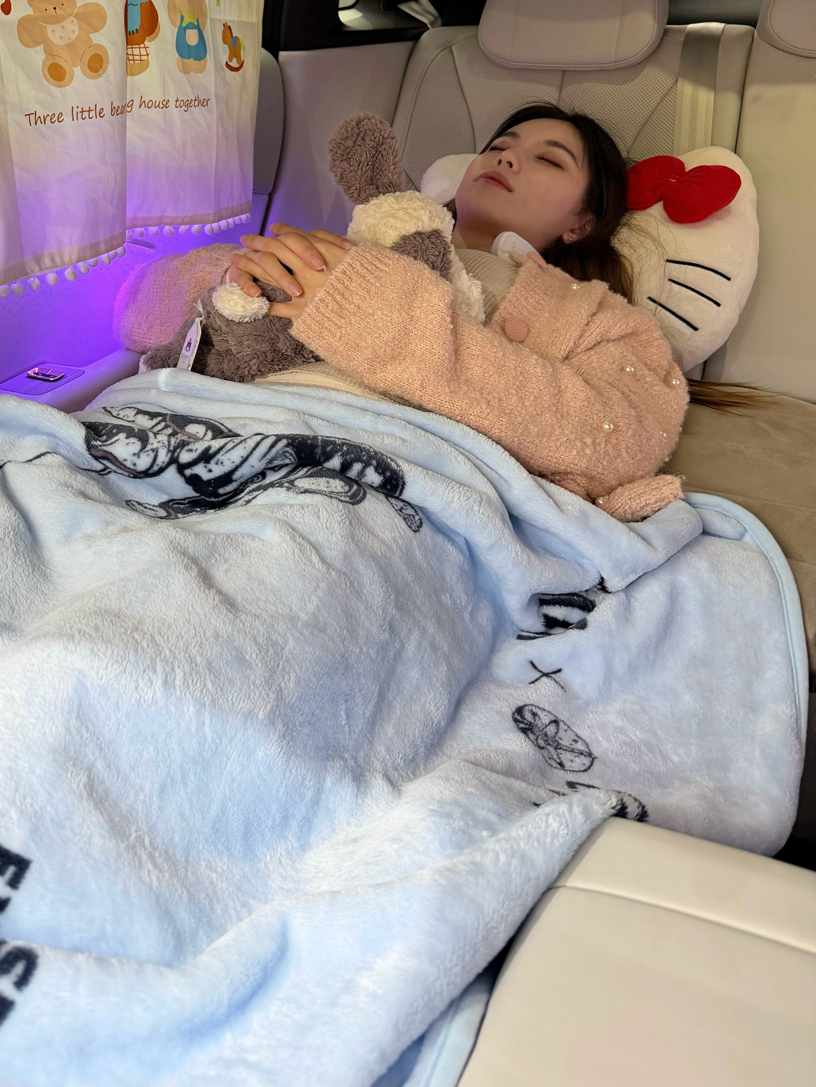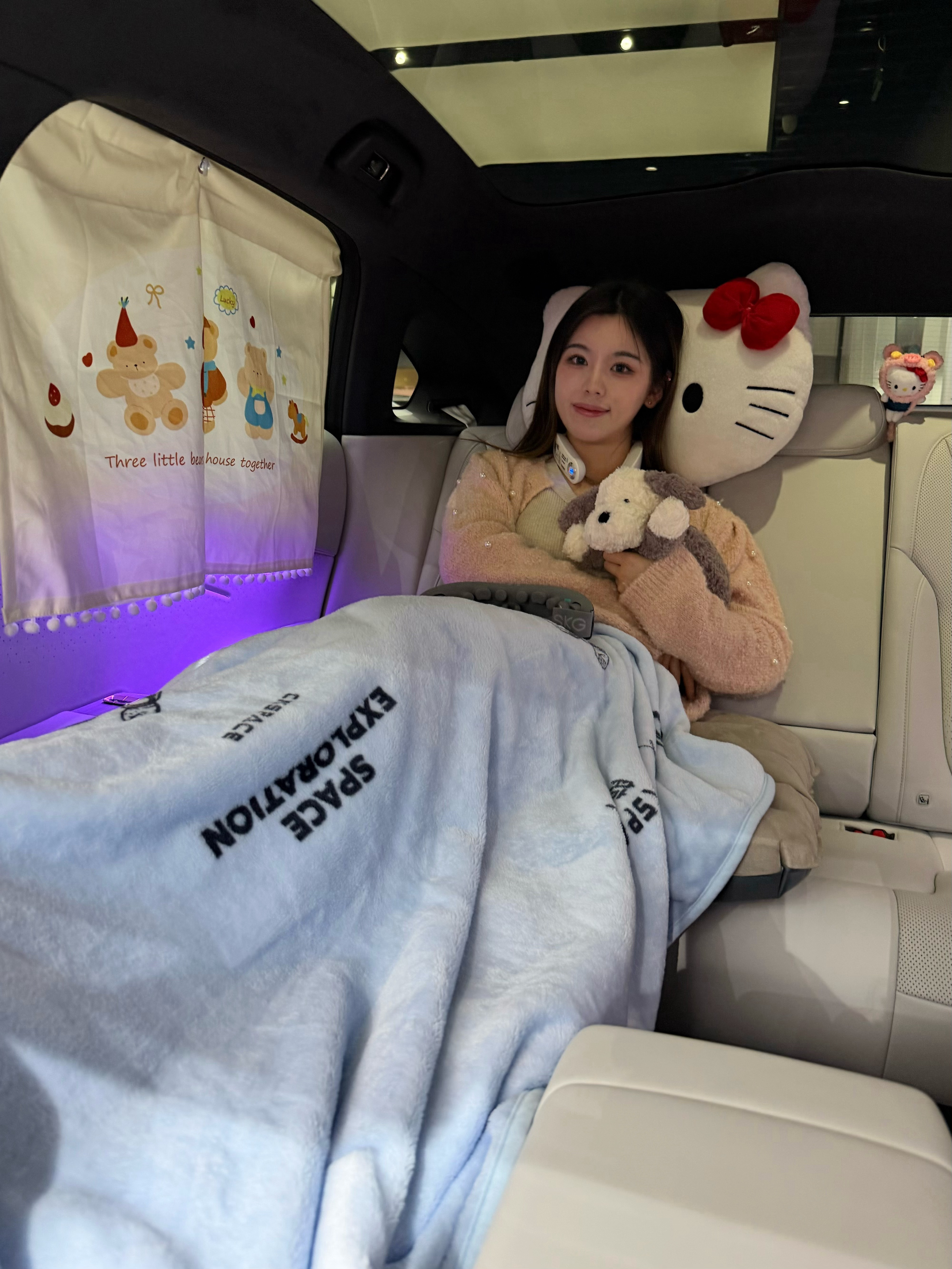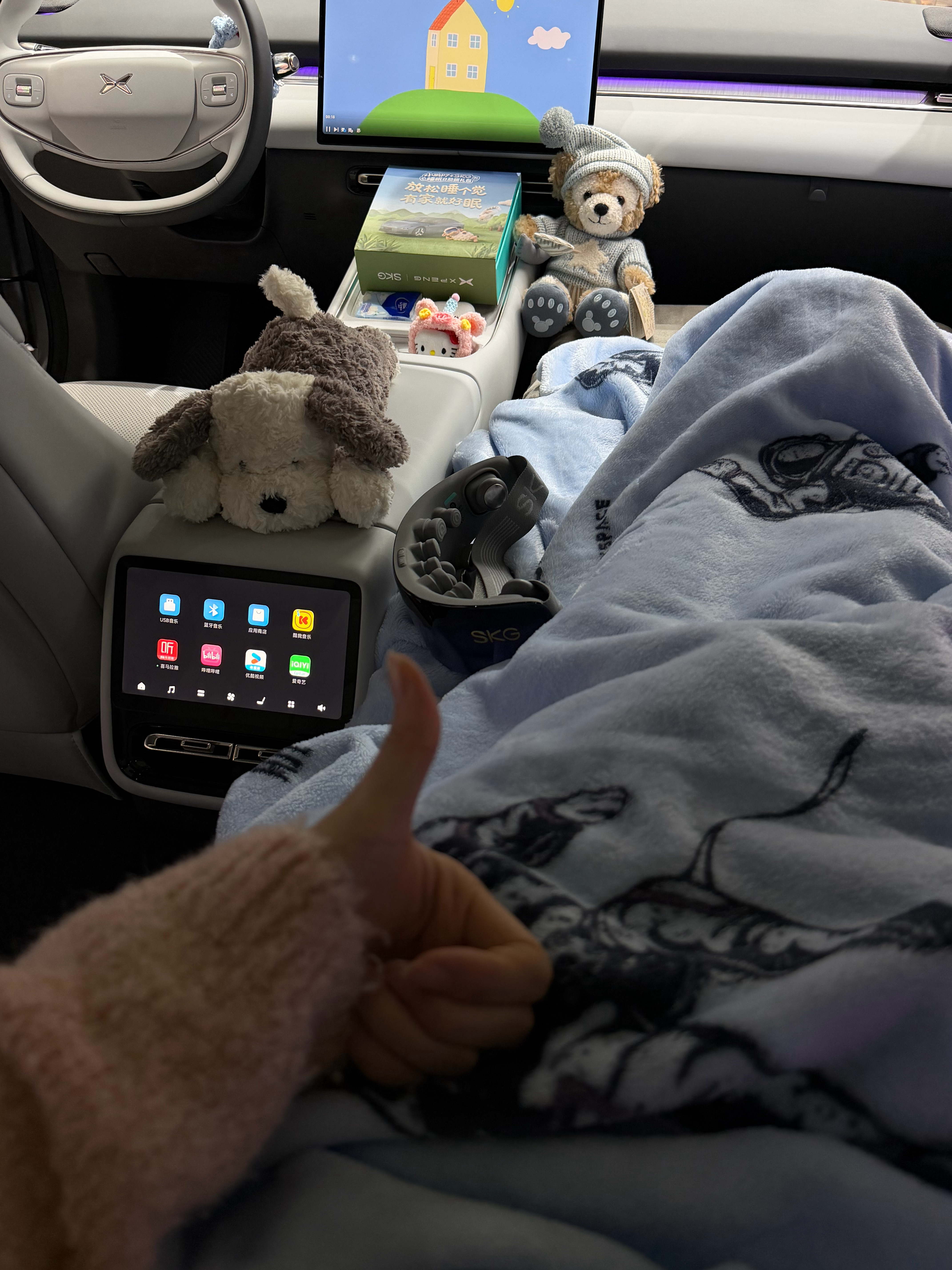 但我不用去店里,我自己就有移动大床房哈哈哈,带大家参观一下!带着SKG在我的P7+大床上看佩奇,看累了一句“小P,打开小憩模式”,座椅放倒、灯光变暗,再加上空调和一点白噪音,氛围一下就到了,想不睡都难