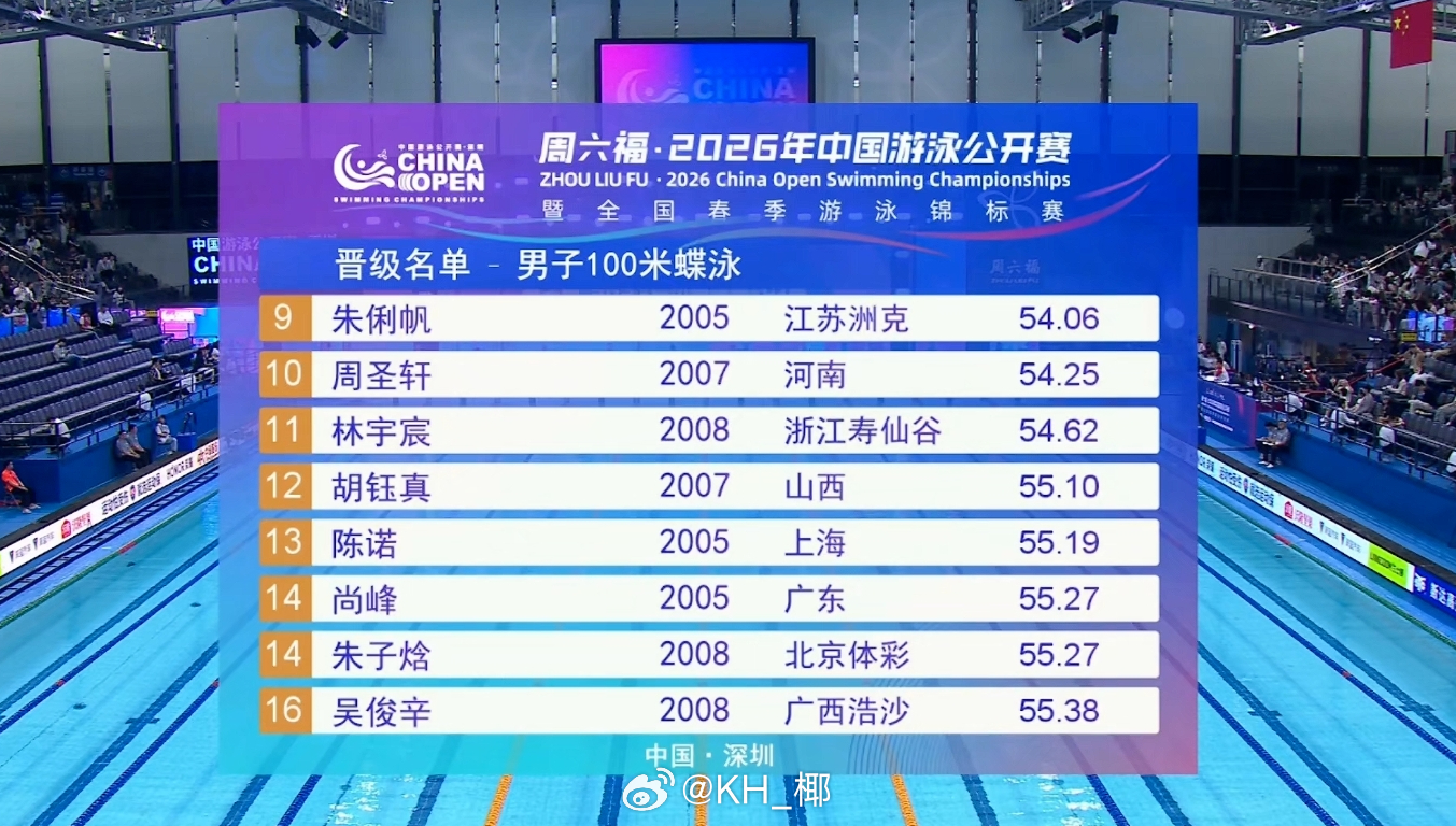 2026年中国游泳公开赛 男100蝶预赛🇨🇭Ponti 51.07陈俊儿 51.57王曦喆 52.04徐放 52.31🇮🇹切孔 52.59李泰裕 53.06洪金权 53.64马福晶 53.96朱俐帆 54.06周圣轩 54.25林宇宸 54.62胡钰真 55.10陈诺 55.19朱子焓 55.27尚峰 55.27吴俊辛 55.38