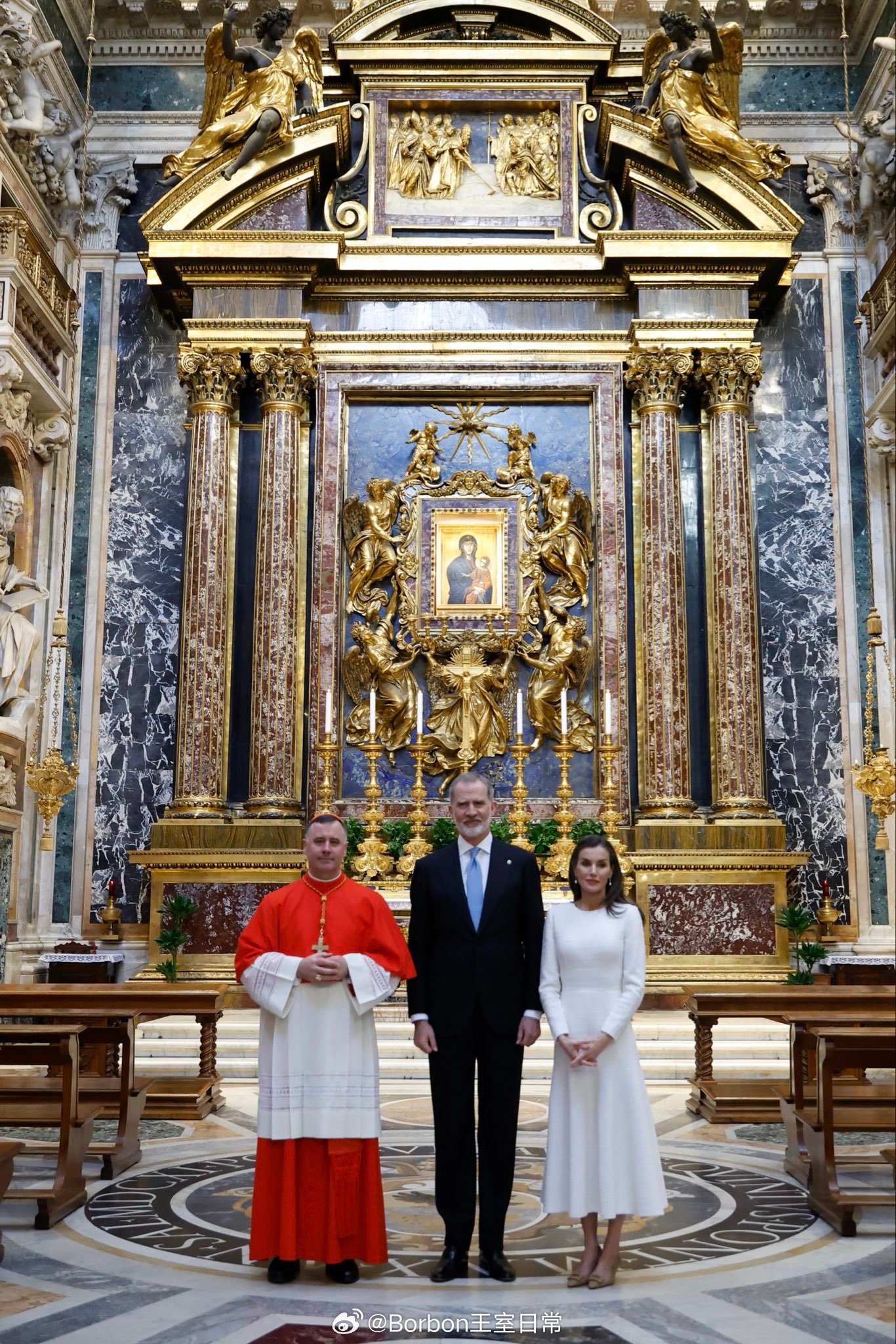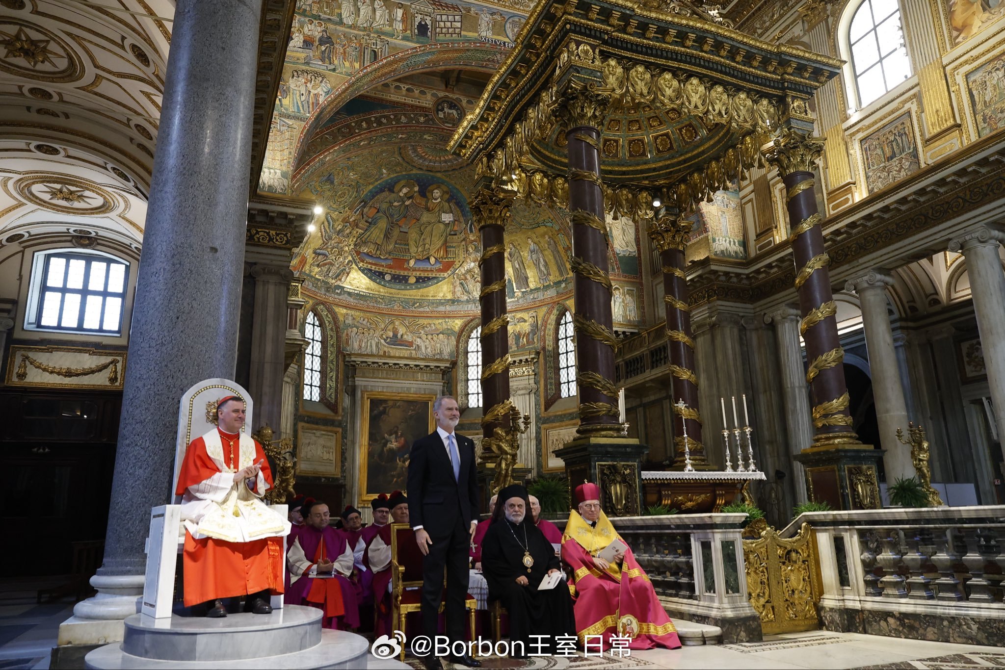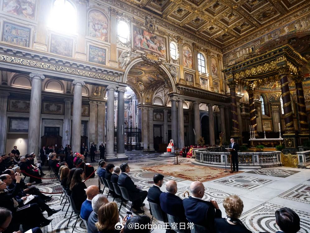 费莱昨日行程part2,在觐见良十四世后,费莱会见了Pietro Parolin枢机主教(图1图2),之后前往罗马圣玛利亚大教堂,出席费6就任名誉首席教士仪式(图3-图7),这是一个礼仪性头衔,起初是因为费利佩四世,他为圣玛利亚大殿提供巨额资金,资助大殿的重要修缮与装饰工程,如鎏金天花板。作为回报,教皇正式授予西班牙君主 “名誉首席教士” 头衔,所有西班牙国王自动继任的。