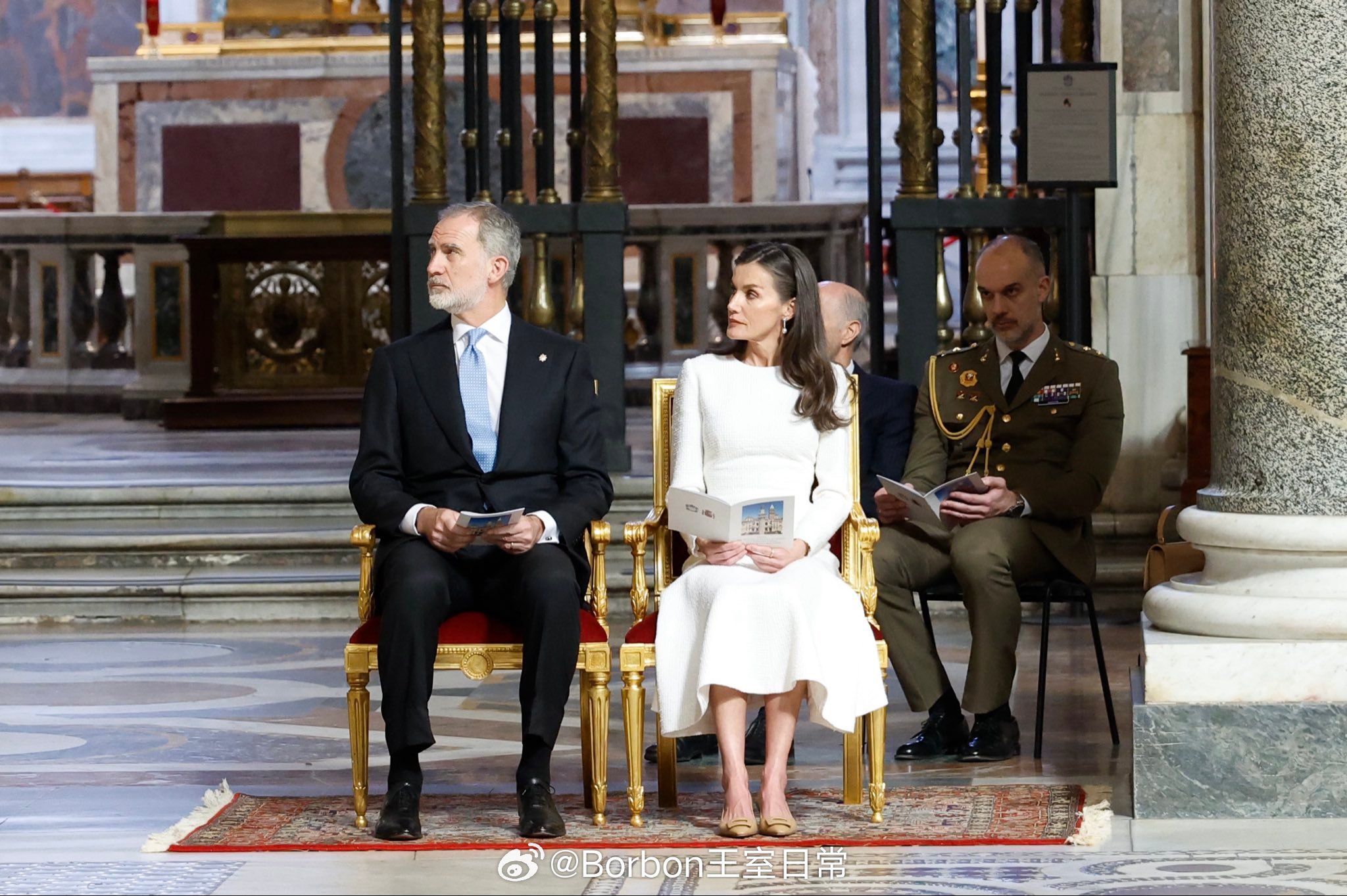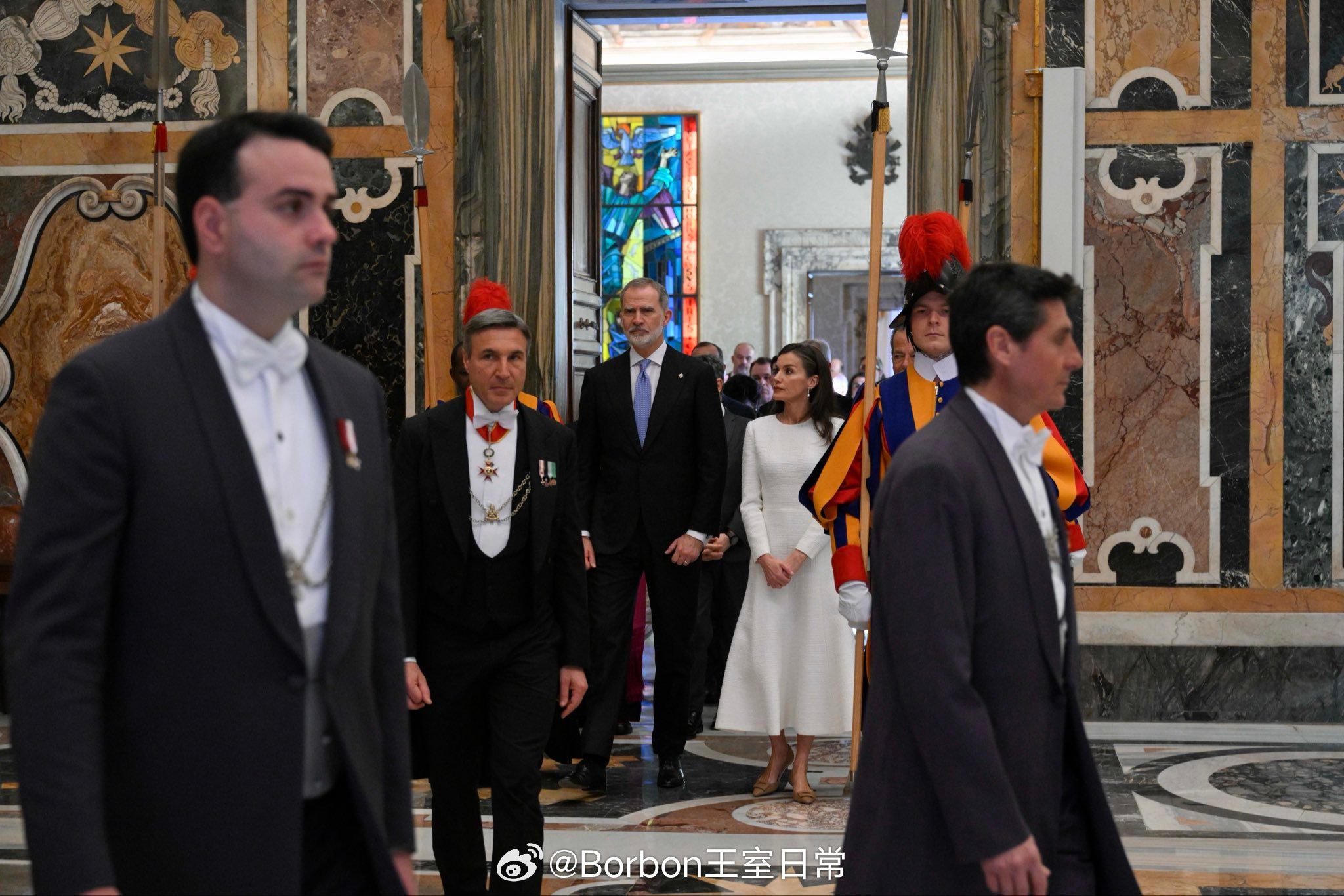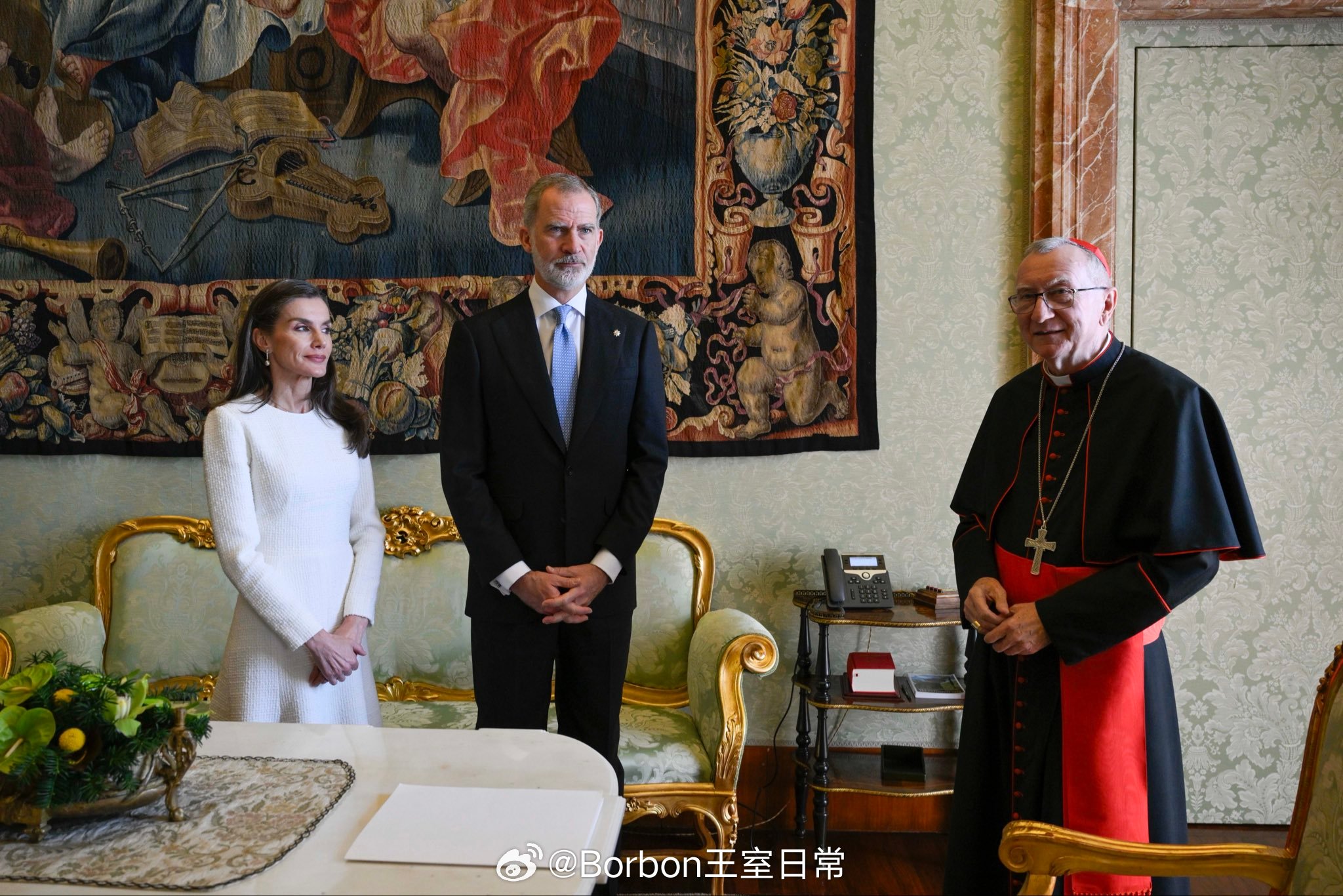 费莱昨日行程part2,在觐见良十四世后,费莱会见了Pietro Parolin枢机主教(图1图2),之后前往罗马圣玛利亚大教堂,出席费6就任名誉首席教士仪式(图3-图7),这是一个礼仪性头衔,起初是因为费利佩四世,他为圣玛利亚大殿提供巨额资金,资助大殿的重要修缮与装饰工程,如鎏金天花板。作为回报,教皇正式授予西班牙君主 “名誉首席教士” 头衔,所有西班牙国王自动继任的。