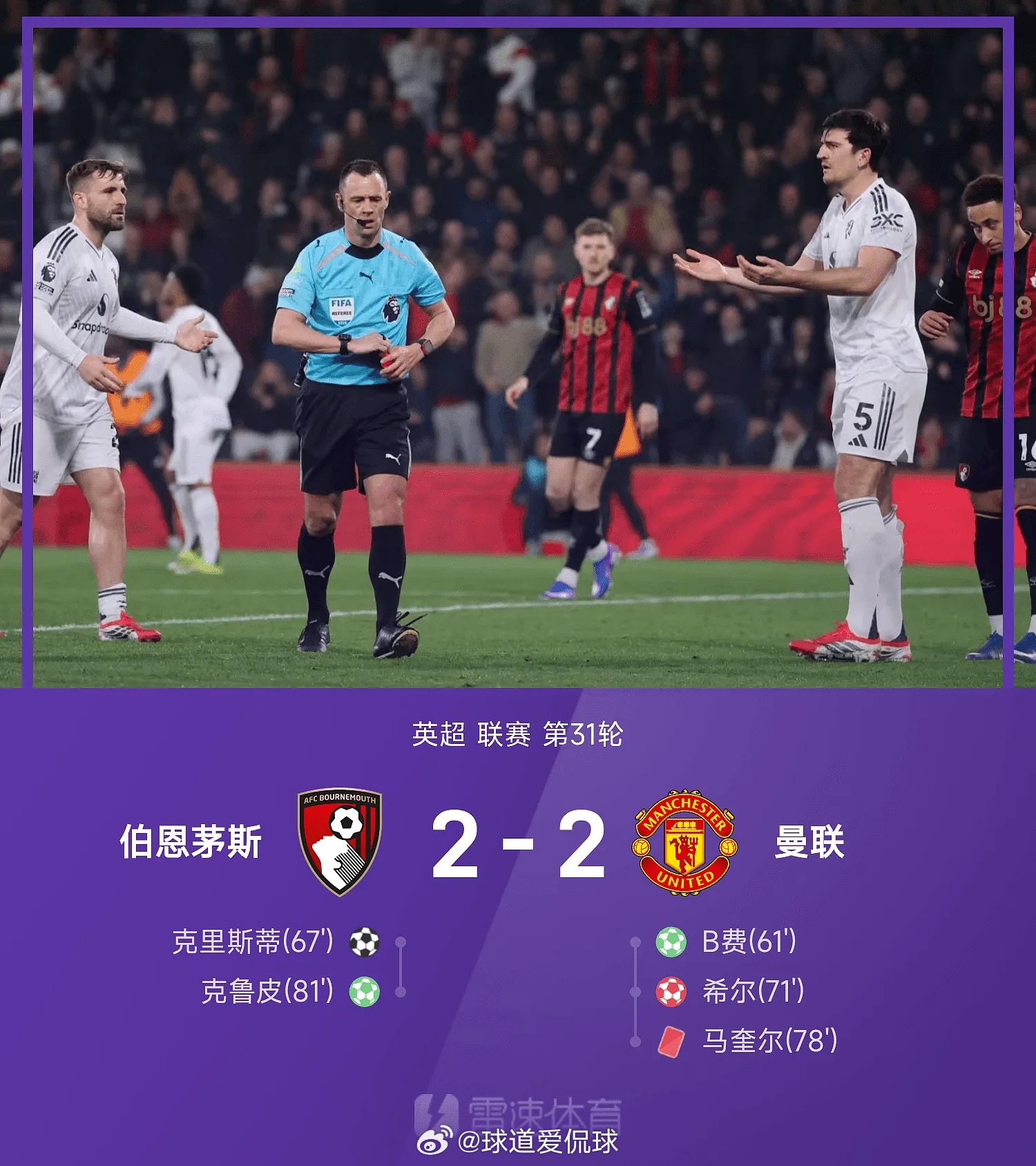 03月21日讯 25/26赛季英超联赛第31轮,伯恩茅斯主场对阵曼联。上半场双方对攻激烈但门将均表现出色,下半场B费率先点射破门,但克里斯蒂闪电扳平,马奎尔造乌龙后又送出红点套餐,克鲁皮点射扳平。最终全场比赛结束,伯恩茅斯2-2战平曼联。足球曼联体育英超足球