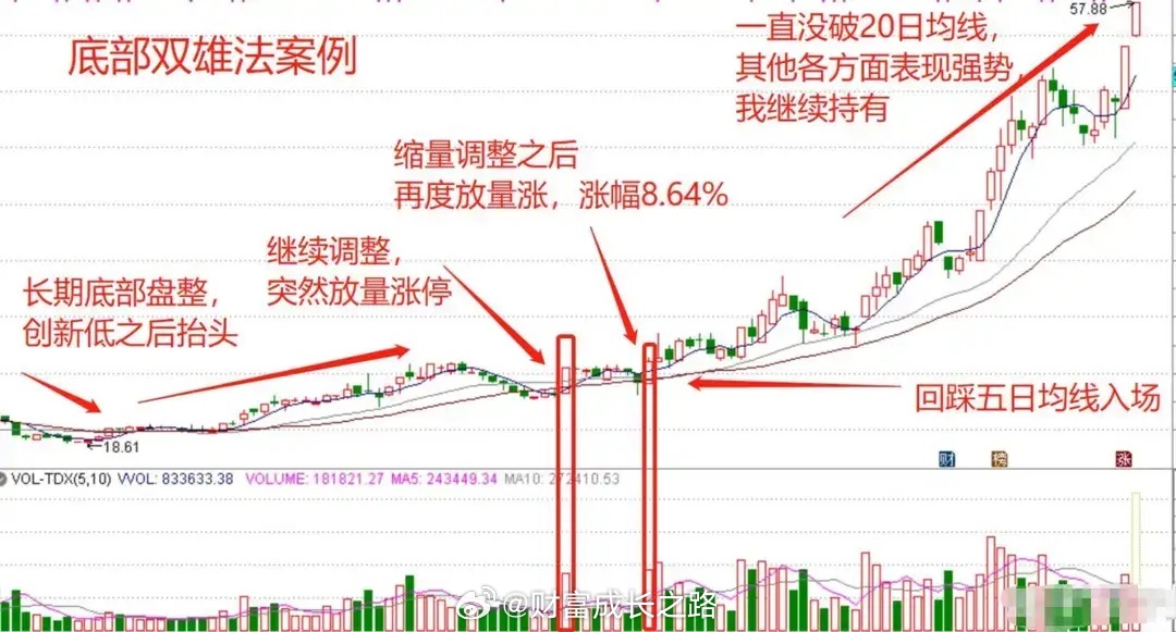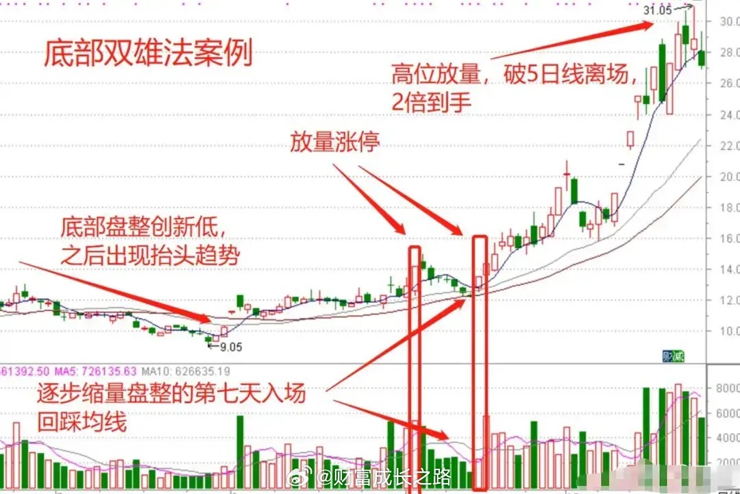 90%散户抄底亏,核心是分不清主力洗盘与底部信号,常把“半山腰”当“底”。“底部双雄”是主力拉升前典型信号,通过“双涨停+缩量回踩”过滤风险,吃透其逻辑可避坑。