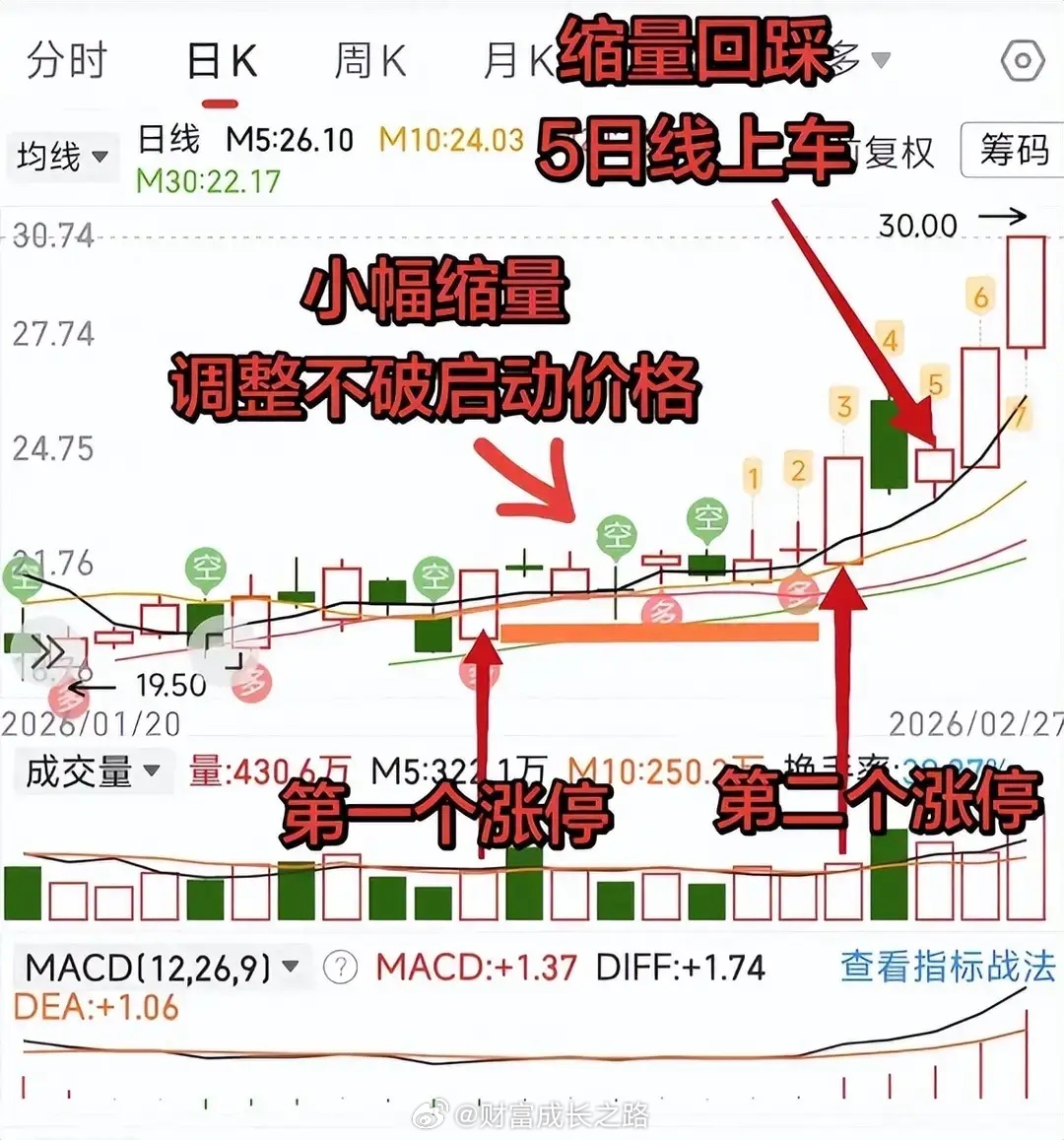 1. 首板/长阳:股价长期低位横盘→首现涨停(或涨超7%长阳),温和放量,确认主力进场,为形态基础。2. 缩量回踩:首板后回调,需满足:①不破首板启动价/5日线;②量能持续萎缩;③周期2-5天(超5天筑底更稳)。此为主力洗盘吸筹,验证形态有效性。3. 二板/长阳:缩量末期再现涨停(或长阳),与首板成“N”字,叠加均线多头、MACD金叉等指标共振,标志形态成型,拉升开启。
