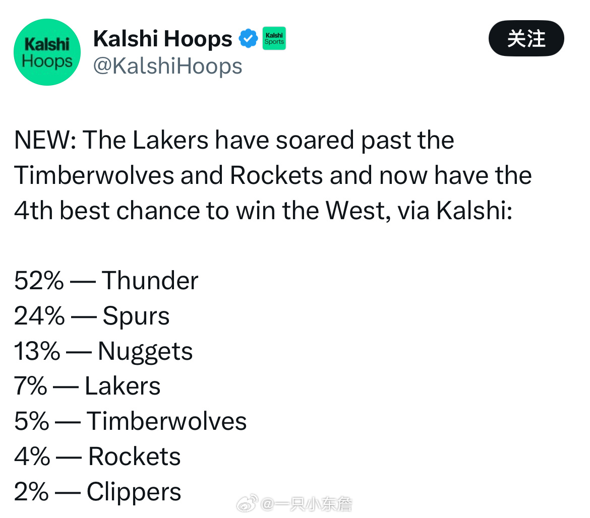 湖人已经超越森林狼队和火箭队,目前拥有西部第四大夺冠希望:52% — 雷霆24%