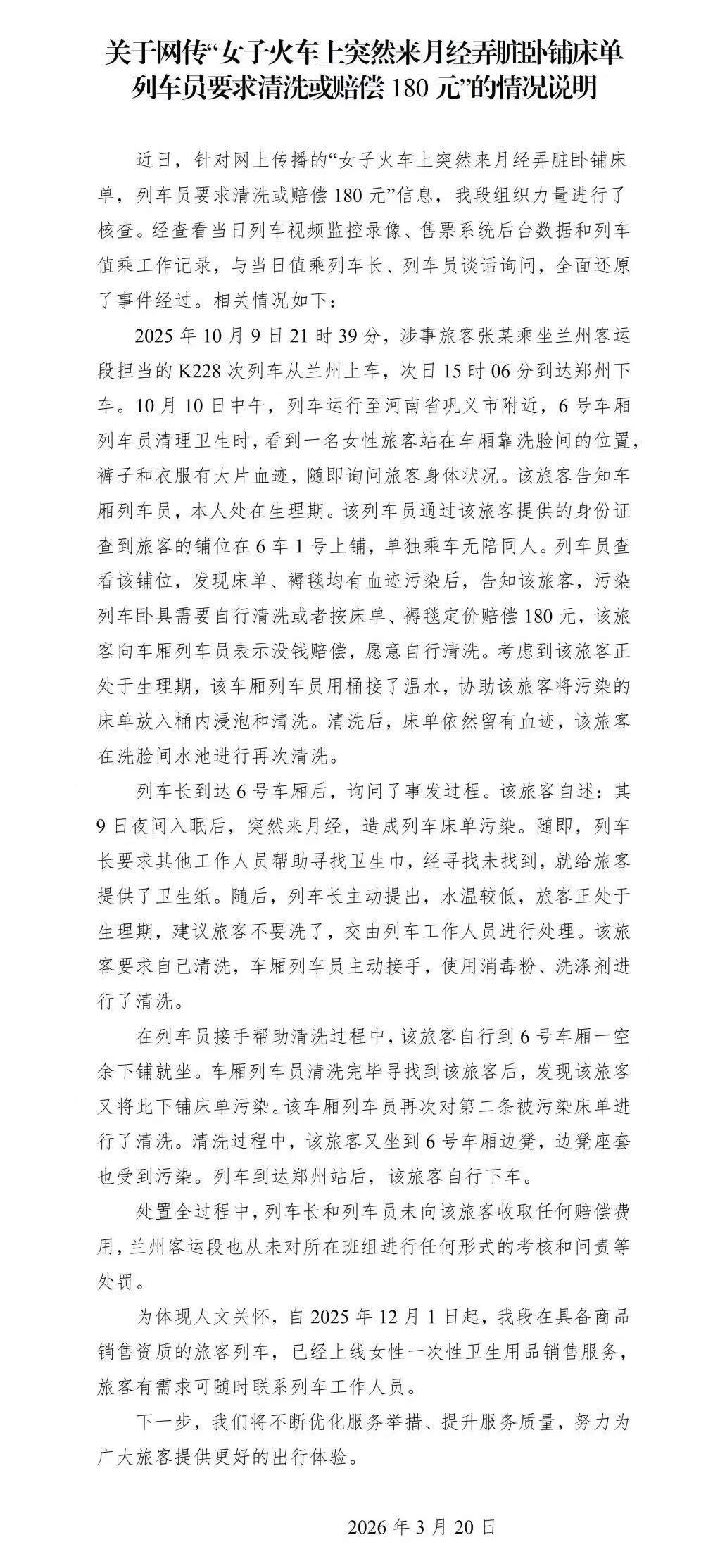 女子乘坐火车卧铺时,因月经突然来临,车上买不到卫生巾,不慎弄脏床单,被工作人员要求自行清洗干净或赔偿180元,她呼吁火车上应该售卖卫生巾! 这篇推文的后续内容,我将从**“生理困境”切入,上升到“人性关怀”与“公共服务温度”**的高度,引发读者的强烈共鸣与讨论。 【接续内容】 这一幕,让评论区瞬间炸开了锅。这不仅仅是一片卫生巾的问题,更是一块扯下了公共服务“温柔底色”的遮羞布。 想象一下,在飞速行驶的列车上,一个女孩面对突如其来的生理期,那种无助和窘迫甚至超过了身体的坠痛。她翻遍行李,找遍车厢,最后却在列车售货员的推车里,看到了数不清的瓜子、零食、充电宝,唯独找不到那片每个成年女性都可能需要的“救急物资”。 最让人心寒的,不是缺失的商品,而是那冷冰冰的“180元”。 当女孩满怀愧疚地寻求帮助,等来的不是一句“没关系,我帮你处理”,而是“要么你自己洗干净,要么赔钱”。那一刻,规则的刚性像一把钝刀,割裂了人与人之间应有的体恤。我们不禁要问:床单脏了可以洗,但一个女性在公共场合被放大的狼狈和尊严,谁来清洗? 人性最大的善,是察觉他人的难处。 卫生巾不是奢侈品,而是占比半数人口的刚需品。当火车上能买到白酒、香烟,甚至昂贵的护肤品时,却容不下一包几块钱的卫生巾,这背后折射出的,是长期以来对女性需求的“集体隐身”。 这180元,罚掉的是女孩的尊严,也罚掉了公共服务的温度。 很多网友说:“这不是钱的事,是这个社会对女性的一份理解。” 每一个在评论区发声的人,其实都在呼唤一种更具烟火气、更有人情味的社会规则。 这件事,你怎么看?你觉得火车上应该售卖卫生巾吗?如果规则和人情撞车,我们又该如何选择?评论区留下你的观点,我们一起聊聊。卫生巾尴尬瞬间 旅途中来月经 高铁免费卫生巾 卫生的卫生巾 女生用卫生巾 带卫生巾 更换卫生巾