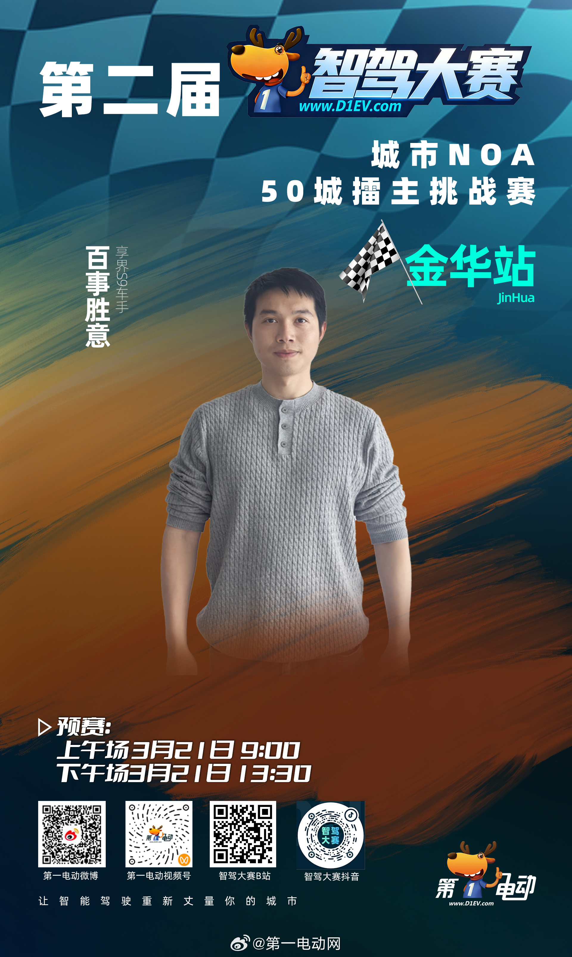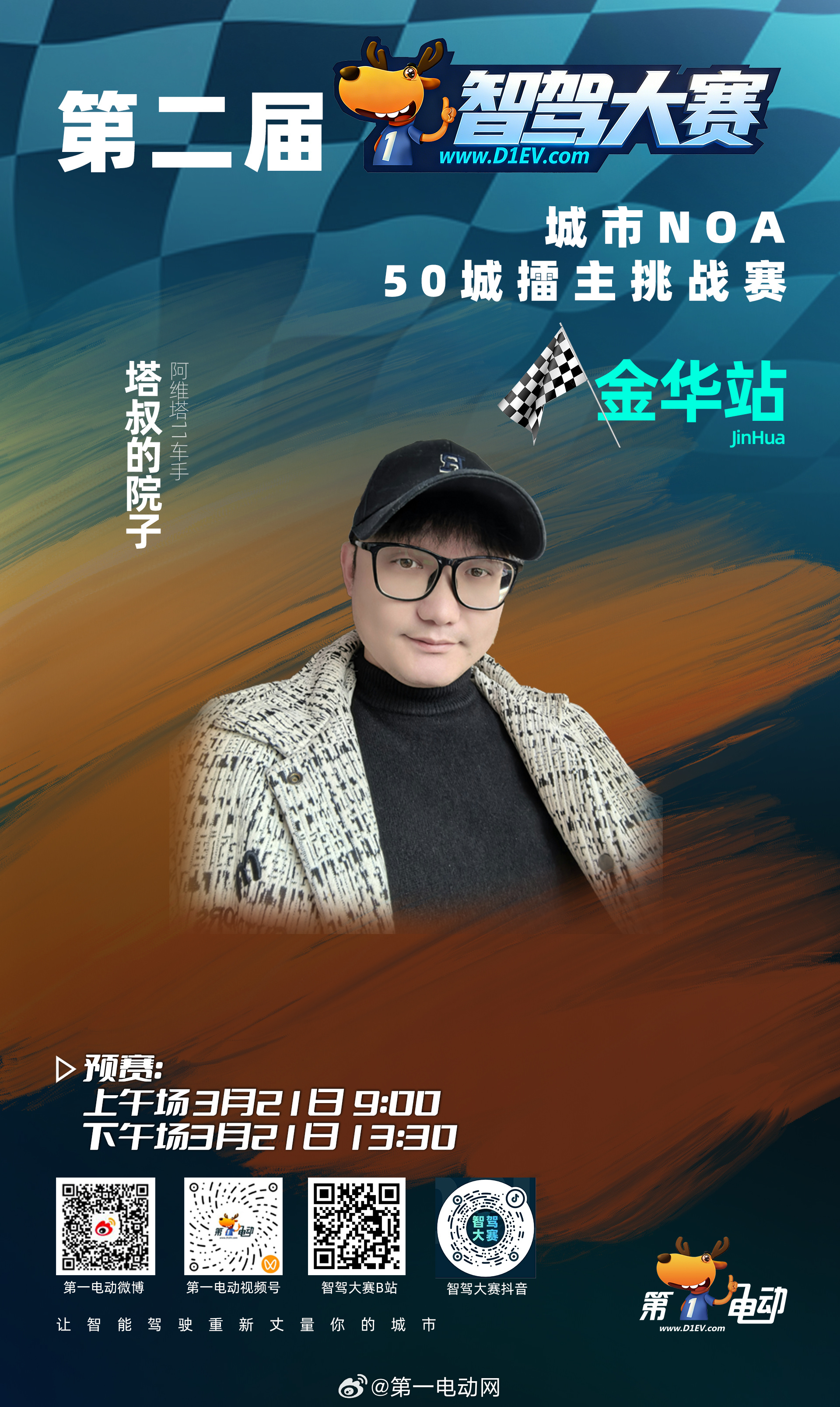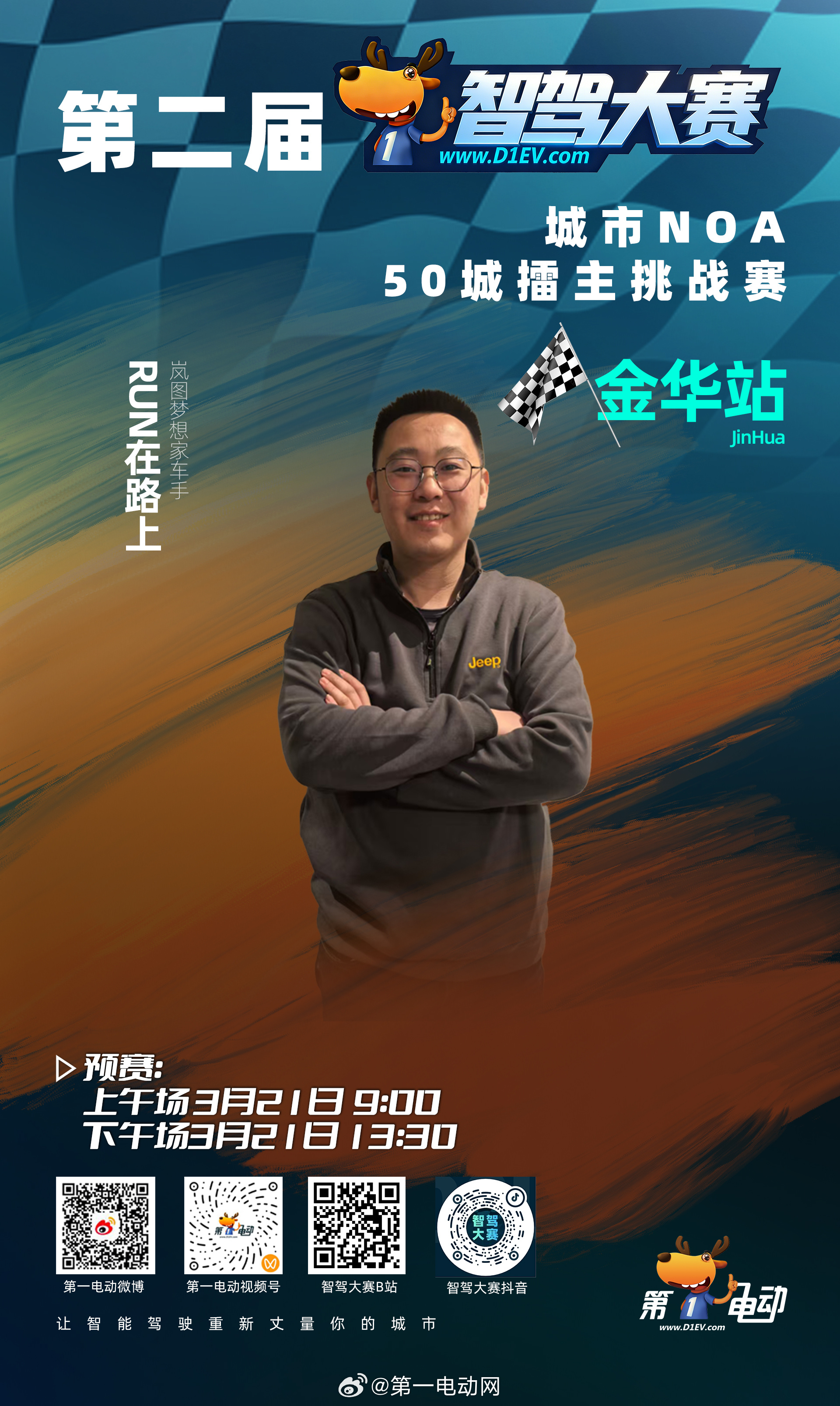 ⏰ 直播锁定:3月21日 13:30 预赛下午场📺 官方主直播:第一电动 微博|视频号、智驾大赛 B站|抖音📺 单车车内视角:微博搜“智驾大赛”,各车型独立直播间已就位