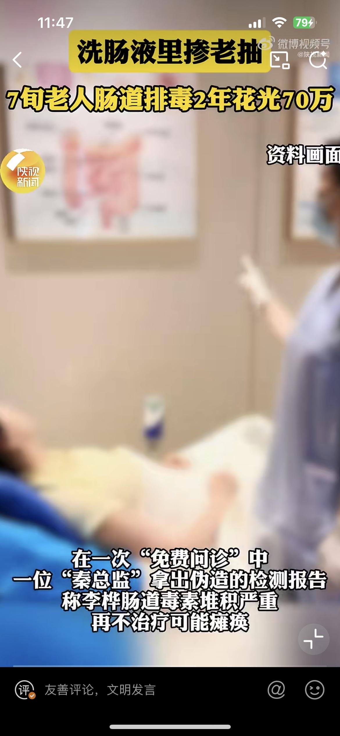 北京大妈误信肠道排毒延年益寿,在一养生馆两年花了 70 万,连随身之物金镯子都给当掉了。北京大妈闲来无事,进了小区附近一家养生馆,免费进行颈肩按摩,38 元办了体验卡,没想到就上套了。在一次免费检测中,一个假冒的健康专家说,大妈身上毒素堆积,需要进行肠道排毒,否则将全身瘫痪,大妈被恐吓住,办了他们的治疗套餐。每次排毒从身体里都挤出一大袋酱油色的液体,实际上这是工作人员事先兑好的老抽。大妈对他们的治疗深信不疑,不停的充值打钱,两年花光 70 万的积蓄,连金镯子也兑掉了。
