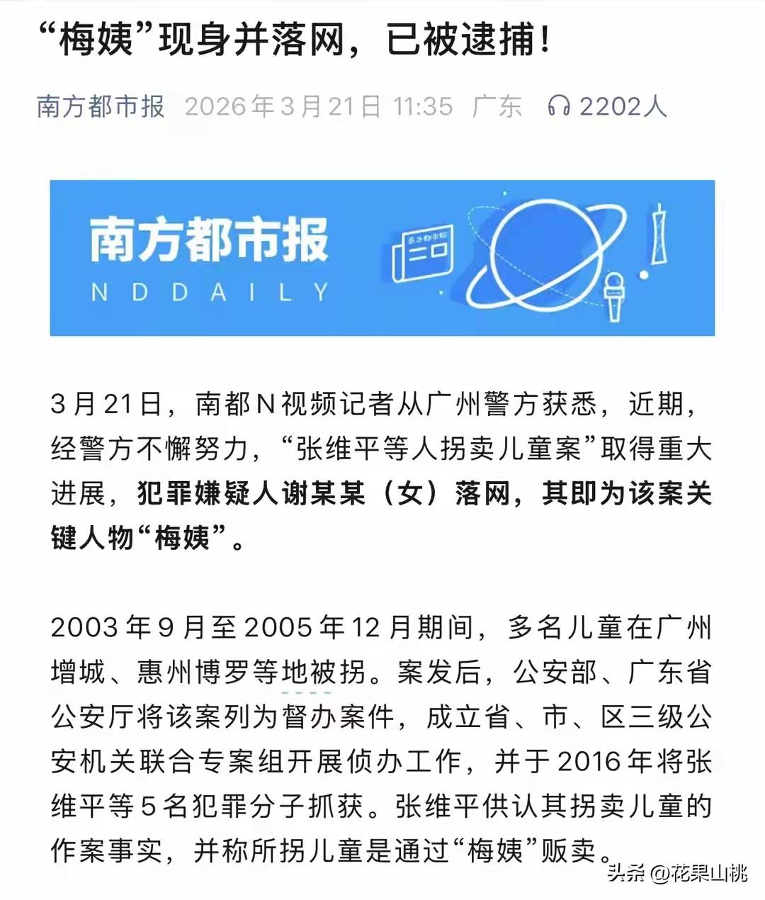 天大的好消息,令人拍手称快! 那个害人不浅、曾令许多个家庭陷入痛苦深渊的“梅姨”被抓获,这么多年,在公安机关坚持不懈的努力下终于将恶人绳之以法,真是大快人心。 2003年9月至2005年12月期间,多名儿童在广州增城、惠州博罗等地被拐,公安机关成立了联合专案组开展侦办。2016年将张维平等5名犯罪分子抓获,张维平供诉称,他所拐卖的儿童是通过“梅姨”贩卖的。 2023年4月,主犯张维平等人被依法执行死刑。而“梅姨”却依然逍遥法外,抓获她的难点在于此人真实身份等关键信息缺失,让这个案件的关键人物始终未能 归案。 不过公安机关从未松懈,采取“内紧外松”的策略,坚持不懈的努力下抓获一名与“梅姨”高度吻合的女子谢某某,经核实,这个人正是“梅姨”。 看到这个消息的网友无不拍手称快,法网恢恢疏而不漏,坏人被绳之以法,等待她的将会是法律的严惩。