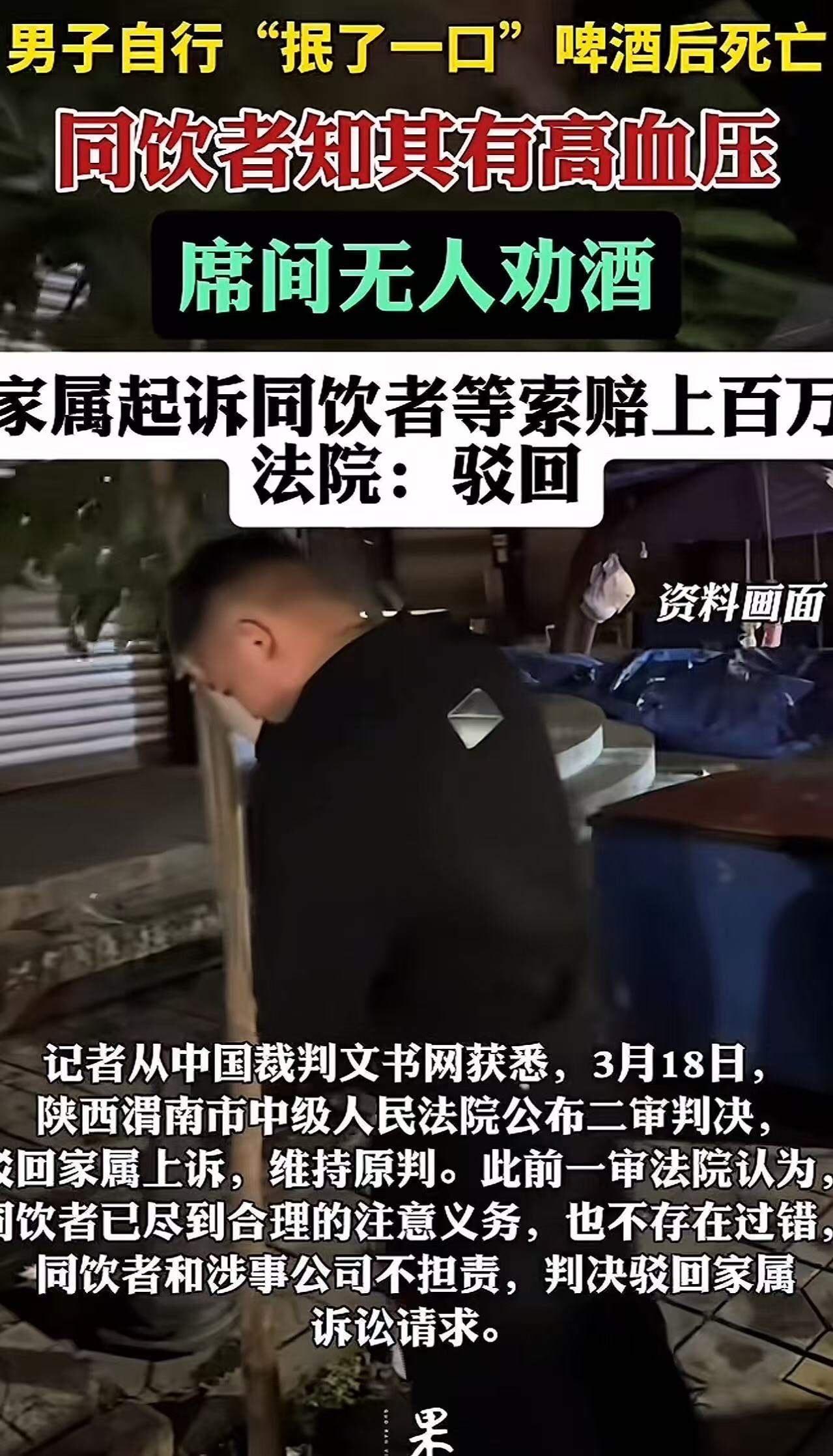 这次必须给法院点赞!男子在酒桌上主动抿了一口啤酒猝死,家属张口索赔143万!法院硬气判决:驳回!网友:吓得我都不敢请朋友喝酒了! 这事儿发生在2023年5月,陕西富平。 那天,原本是一场老友相聚的欢餐。男子李某应邀参加朋友的聚会。席间,大家推杯换盏,气氛正浓。李某在没有任何人劝酒、甚至在大家提醒他“身体不好少喝点”的情况下,自己主动端起酒杯,仅仅抿了一小口啤酒。可谁能想到,死神就在这一刻掐住了他的咽喉。李某随即感到不适倒地,送医抢救无效死亡。 悲剧发生后,李某家属的反应让人大跌眼镜。他们没有反思李某自身的身体状况,而是反手将同桌的5名好友告上法庭,索赔143万巨款!家属的逻辑简单粗暴:“人是在你们酒桌上死的,你们就得负责!” 这种“死者为大、谁弱谁有理”的闹剧,我们见过太多了。在以往的类似案例中,为了所谓的“人道主义”,法院往往会判同桌人赔点“辛苦费”息事宁人。但这次,富平法院的法官没有选择和稀泥。 法院经审理认为:同桌好友不仅没有劝酒、灌酒行为,反而尽到了提醒义务,且在李某发病后第一时间拨打120并积极救助。反观李某,作为完全民事行为能力人,明知自己患有严重疾病不能饮酒,却置生命于不顾,这属于典型的“自甘风险”。 最终,判决结果只有两个字:驳回!一分钱都不用赔! 这个判决一出,评论区瞬间炸锅了。这哪里只是一个判决书,这简直是给所有“碰瓷式维权”的一记响亮耳光! 说实话,看完这个案子,我心里只有两个字:解气! 长期以来,我们被那种“只要出事就有理”的畸形逻辑绑架了太久。好心请客吃饭,却成了“高危职业”;正常社交往来,却要背负“连坐”的风险。如果“抿一口”都要赔143万,那以后谁还敢社交?谁还敢推心置腹? 人性中最大的恶,莫过于利用他人的善良和规则的漏洞,来填补自己贪婪的胃口。 家属的巨额索赔,毁掉的不仅是朋友间的情谊,更是社会的信任基石。 这次法院的硬气,硬在了对法律底线的坚守,更硬在了对社会公德的捍卫。它告诉我们:法律保护的是守法者的权益,而不是谁闹谁有理的遮羞布!每个人都是自己生命健康的第一责任人,你不能一边挥霍自己的生命,一边让无辜的人为你买单。 这一判决,让正义不再和稀泥,让善良不再战战兢兢。 对于这件事,你怎么看?你觉得“酒桌连坐”的时代该结束了吗?欢迎在评论区留言,写下你的看法!