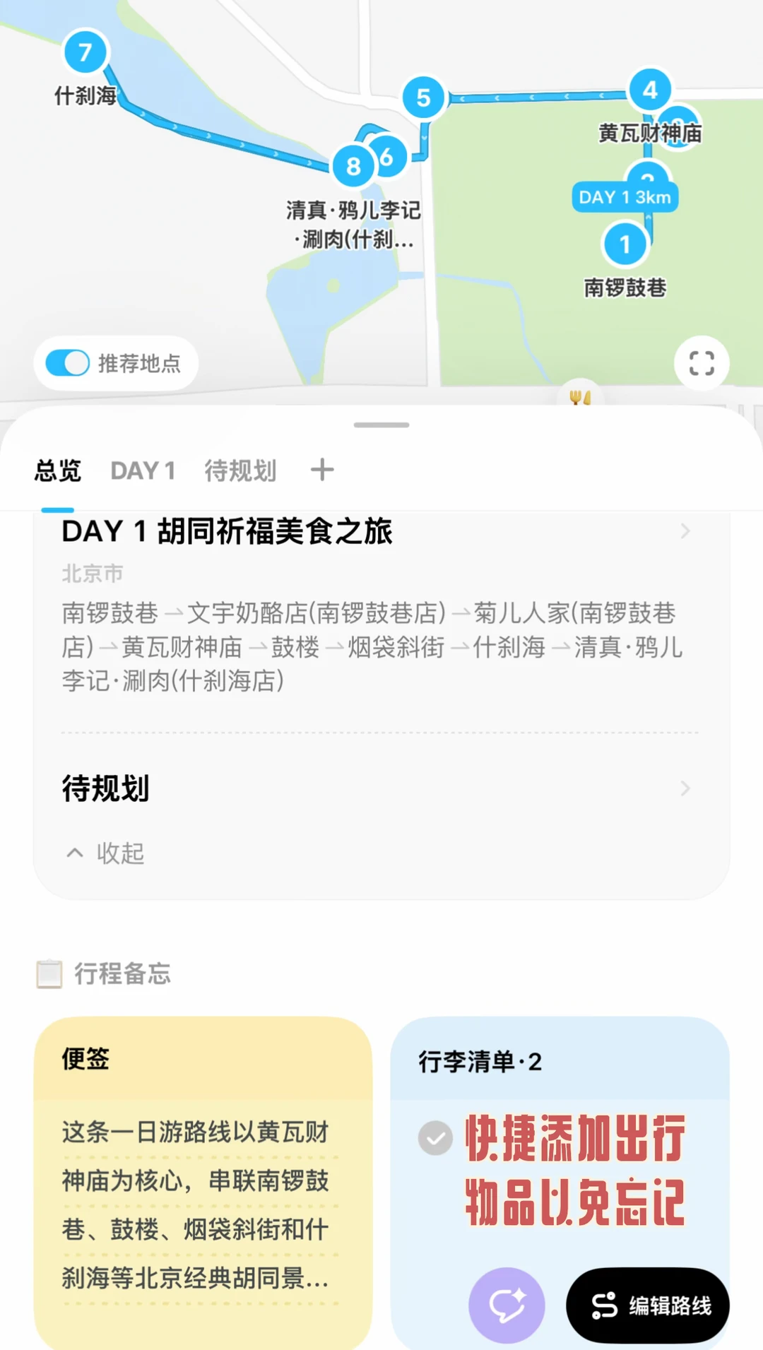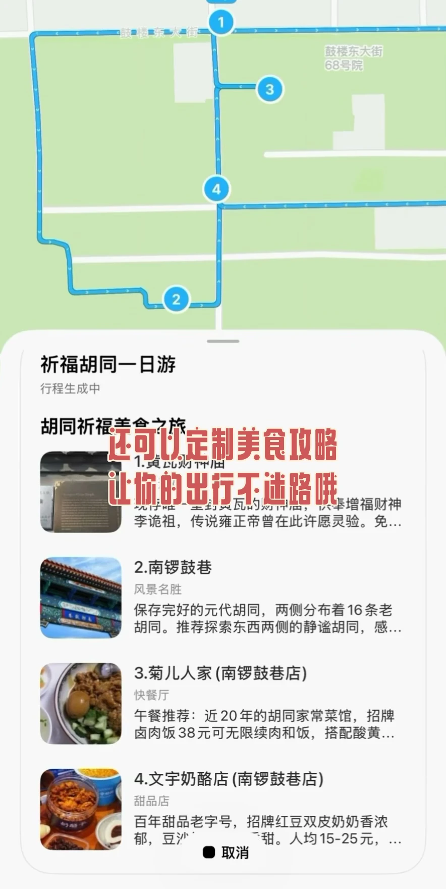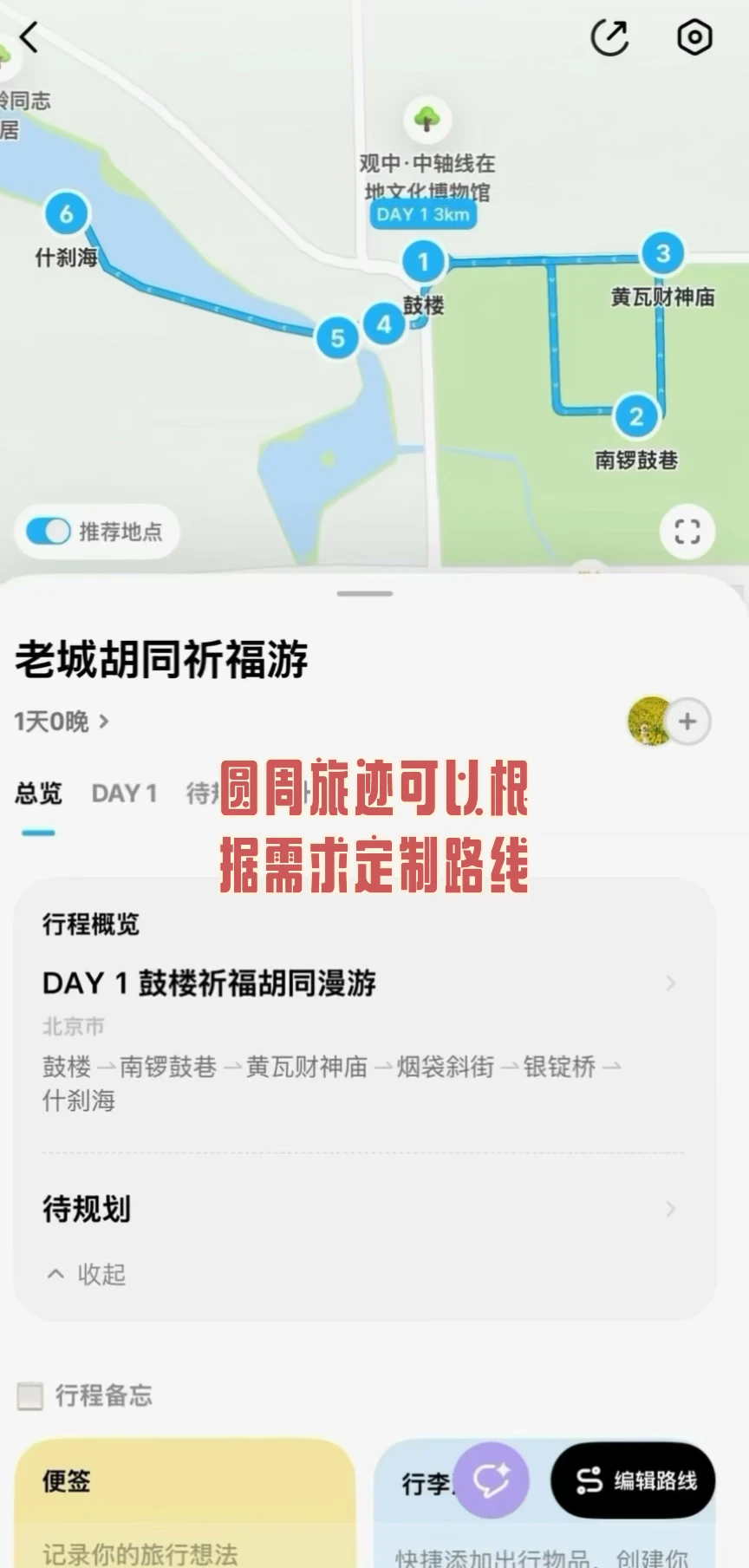 北京鼓楼真的太适合Citywalk了 红墙绿瓦在阳光下随手一拍大片 不用刻意找角度,每一步都像走进老北京的温柔里 逛老街、看古建、感受人间烟火 在这里沉浸式体验京城文化,治愈又有仪式感 ❤️citywalk 路线 炒豆胡同➡️南锣鼓巷➡️黄瓦财神庙➡️北锣鼓巷➡️鼓楼园➡️钟鼓楼➡️什刹海➡️北海公园➡️景山公园➡️如果时间允许还可以去天安门夜骑 ✅南锣鼓巷、北锣鼓巷:地铁口E口出,一条街都是小店跟小吃 ✅黄瓦财神庙:🆓9:00-17:30开放(周一闭馆),每次都会去逛逛 给大家分享一些玩法⬇️ ✔️主殿左手抱右手三拜,默念心愿;殿前🉑取1枚钱币,投入“福/禄/财”斗盆 ✔️恰逢二月二,庙内推出特色民俗活动:金豆开花破霉运,还有扫尘除秽、喜财包金(财糖迎福)等传统体验,仪式感十足 ✔️文创:造办处买“带财水”(9.8元)、元宝、手串、财气袋 ✅鼓楼、钟楼是挨着的,可俯瞰中轴线 ✅什刹海:去糖房☕️打卡,烟袋斜街、什刹海、鼓楼尽收眼底,去后海坐北京特色的小三轮车,坐个小船吹着风,感受老北京的人文气息,看北京历史街区 ✅北海公园:北门进➡️静心斋➡️西天梵境➡️九龙壁➡️快雪堂➡️阐福寺➡️五龙亭➡️团城➡️琼华岛,这条路线2h,走走停停很惬意! ✅景山公园:出去正好到景山公园西门,可俯瞰故宫 ✅天安门骑行:有时间可以去,从东门出有🚴,北池子大街➡️北河沿大街➡️南河沿大街➡️长安街➡️天安门 来北京要打卡胡同北京元素 ✔️ “I ❤️ China” ➡️鼓捣猫呢 ☕ ✔️红色“北京”字墙 ➡️一贴一世界 ✔️ 金色“北京”字墙 ➡️ 八月桂花香 ✔️马赛克“北京”字墙 ➡️大树前老市集 ✔️“南锣”字墙 ➡️匠铸 ✔️ “金鱼屋顶” ➡️ 16毫米 小tips: 可以用圆周旅迹自动生成行程,可以精准到每个景点间的距离,还可以定制美食攻略,旅行不迷路哦,用起来很方便!
