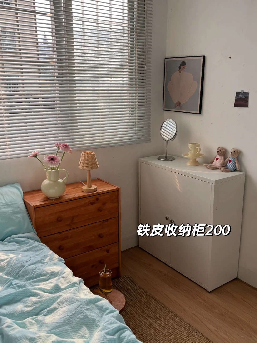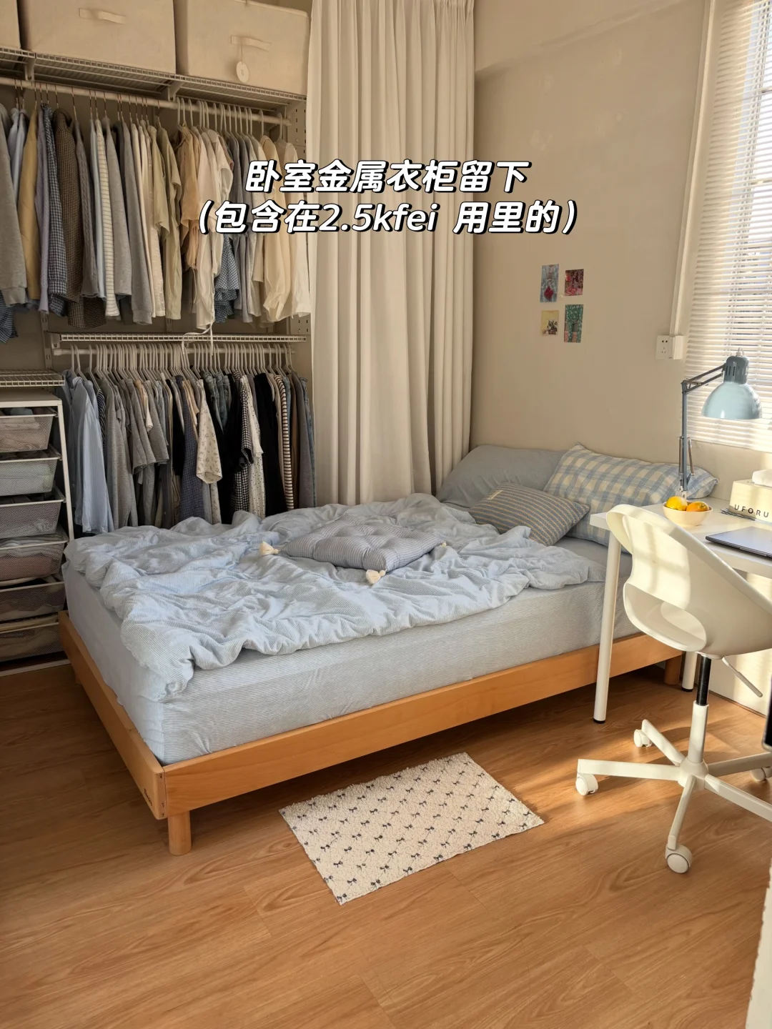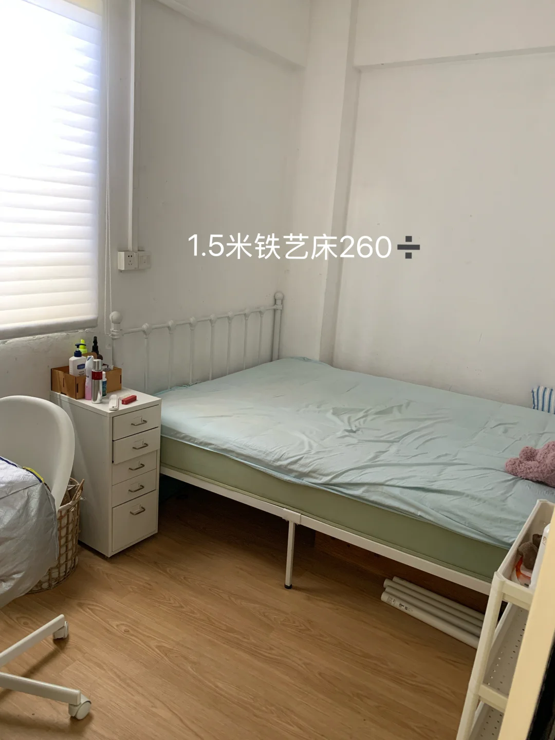 重刷的墙面,木地板,卧室金属衣柜,所有窗户的百叶帘